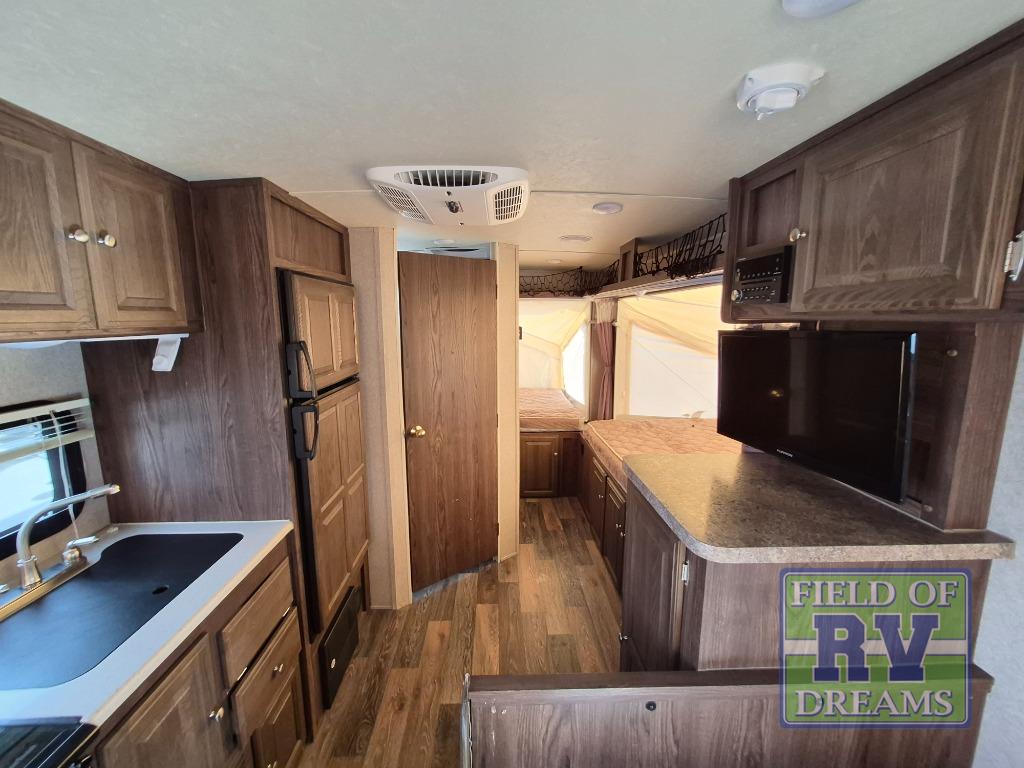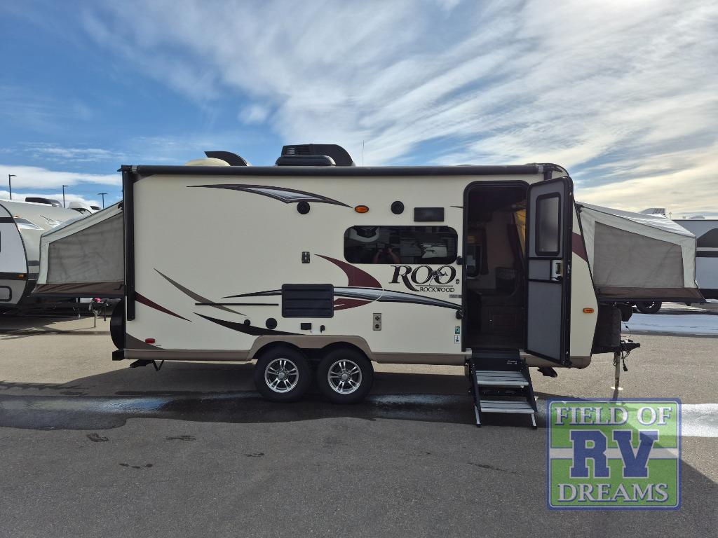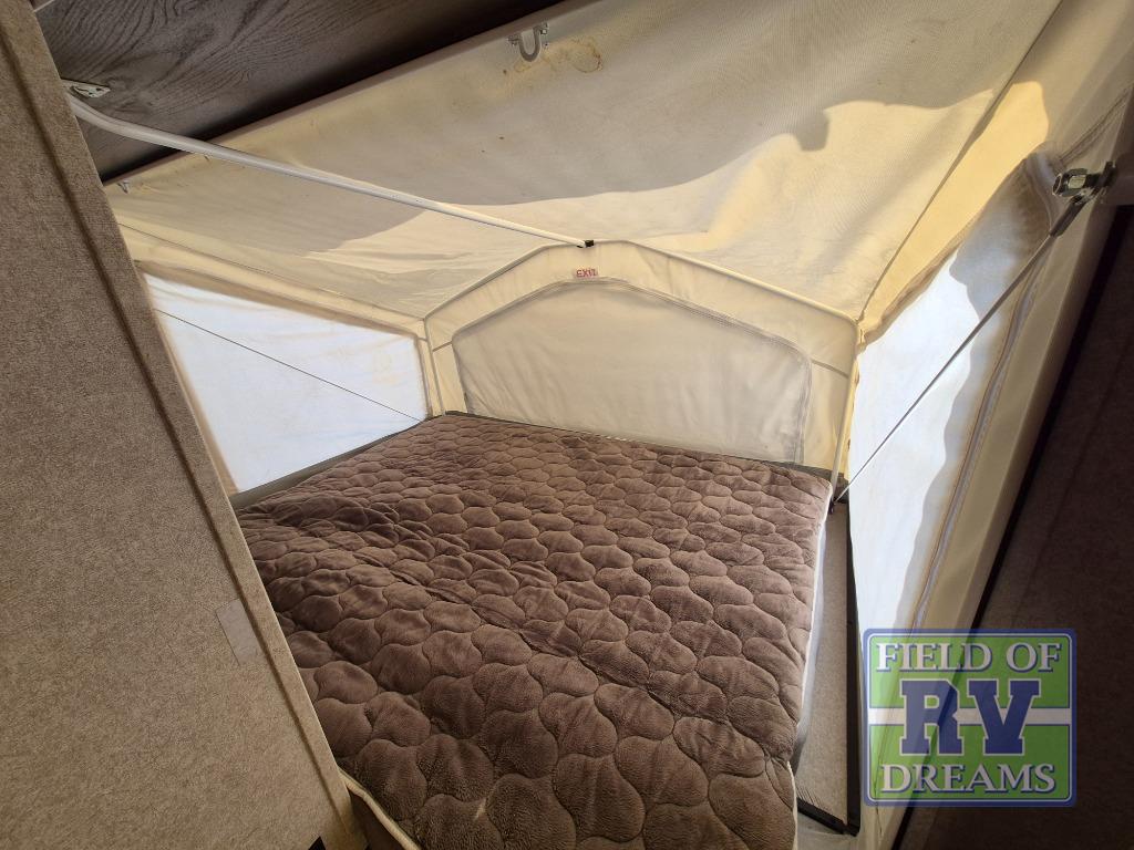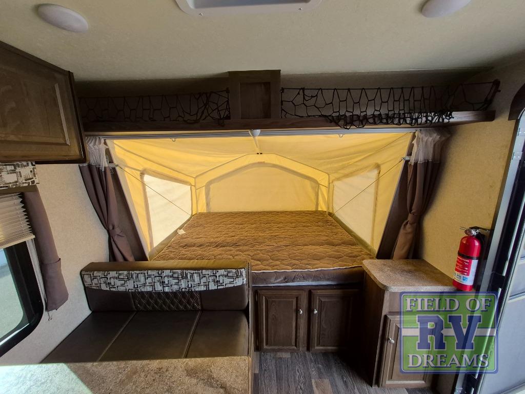 This Rockwood Roo 183 expandable travel trailer by Forest River offers plenty of sleeping space with three tent end beds. They are located in the front, rear, and along the road side wall. Shelf storage can be found above each tent opening, with a pantry below the road side bed opening.
