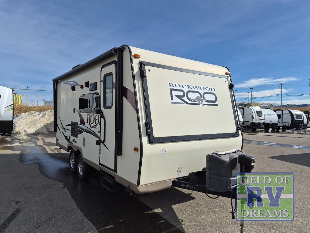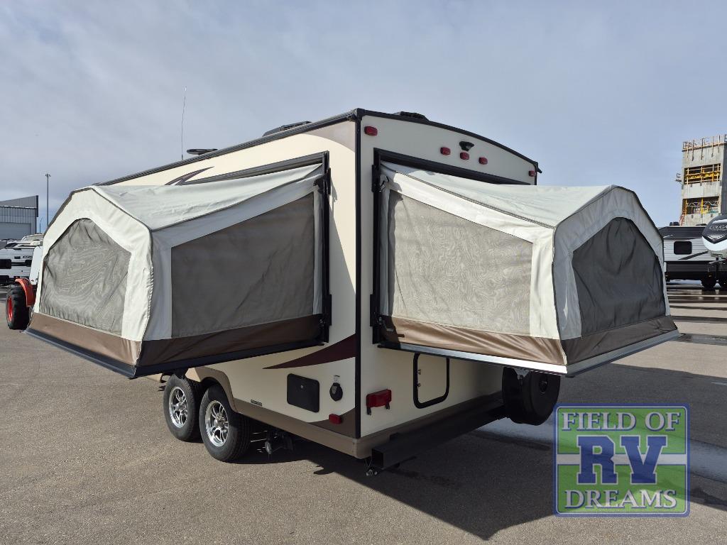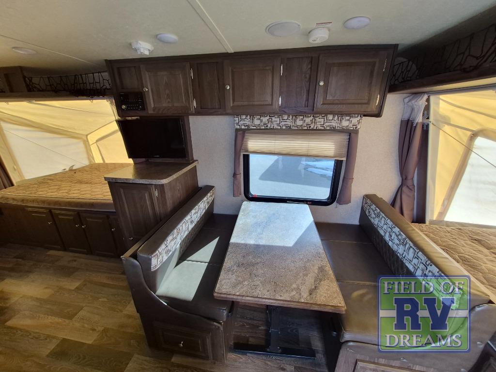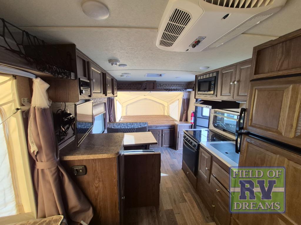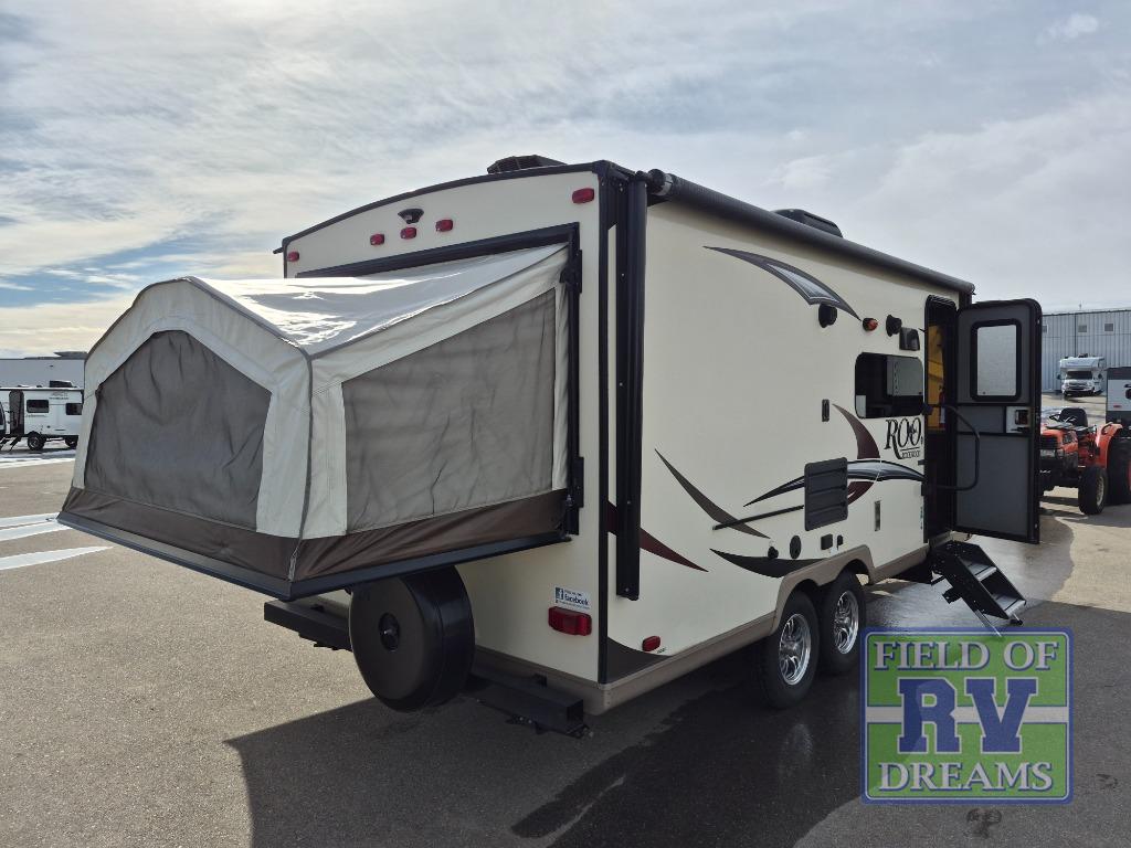 This Rockwood Roo 183 expandable travel trailer by Forest River offers plenty of sleeping space with three tent end beds. They are located in the front, rear, and along the road side wall. Shelf storage can be found above each tent opening, with a pantry below the road side bed opening.