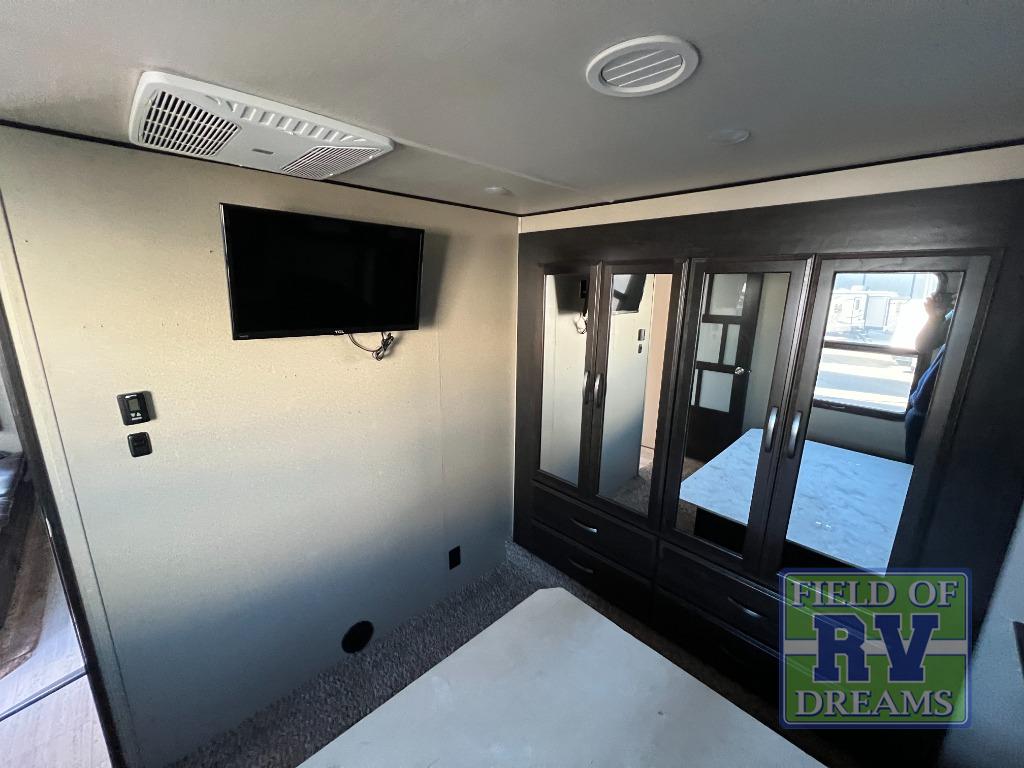 The private front bedroom is away from the main living space to give you a quiet retreat that includes a queen size bed or optional king, with nightstands on both sides of the bed. There is also overhead cabinets, and a slide out wardrobe with drawers for all of your clothing.