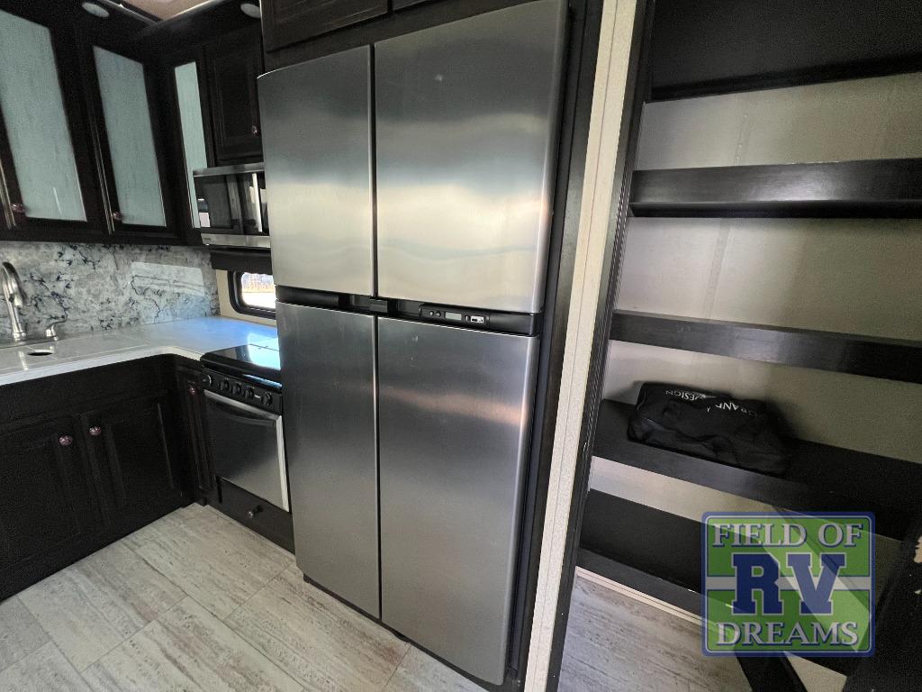 Cook up great food for the whole gang as you travel in this M-Class kitchen which features a large sink, counter space, three burner range, microwave, 18 cu. ft. refrigerator, and a walk-in pantry. The overhead cabinets and lower cupboards and drawers are perfect for all of your dishes and things.