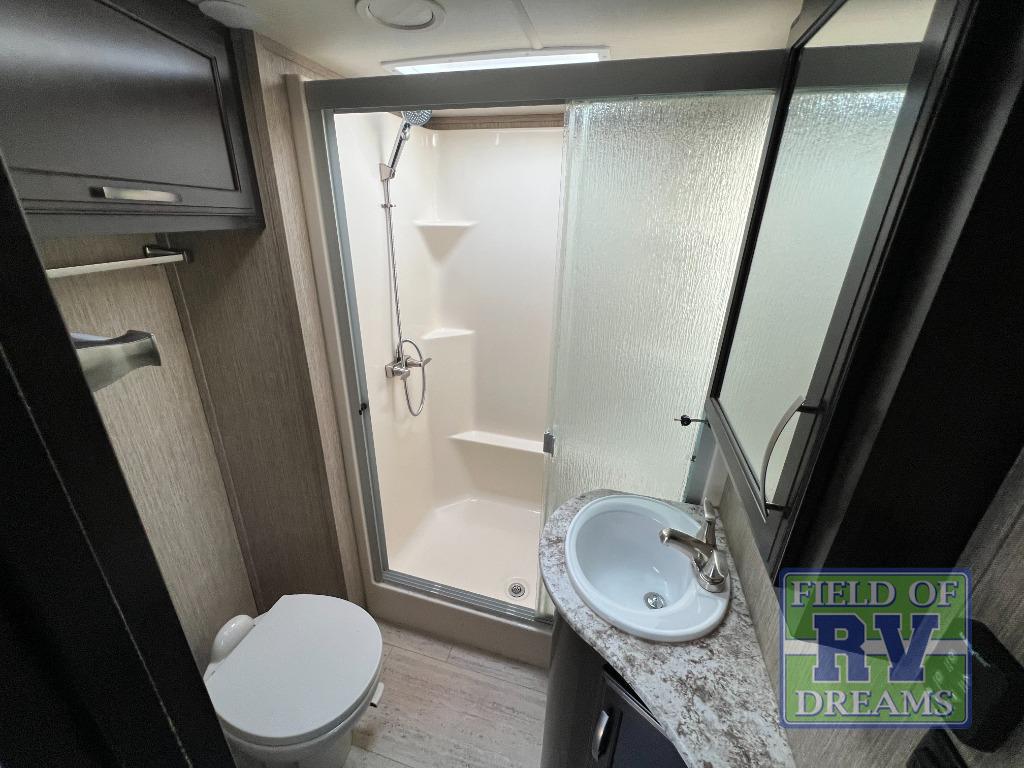 Head up the steps toward the front and find a side aisle bath with a toilet, sink, plus a shower with skylight and seat.