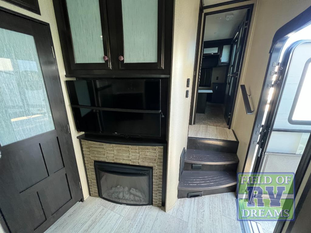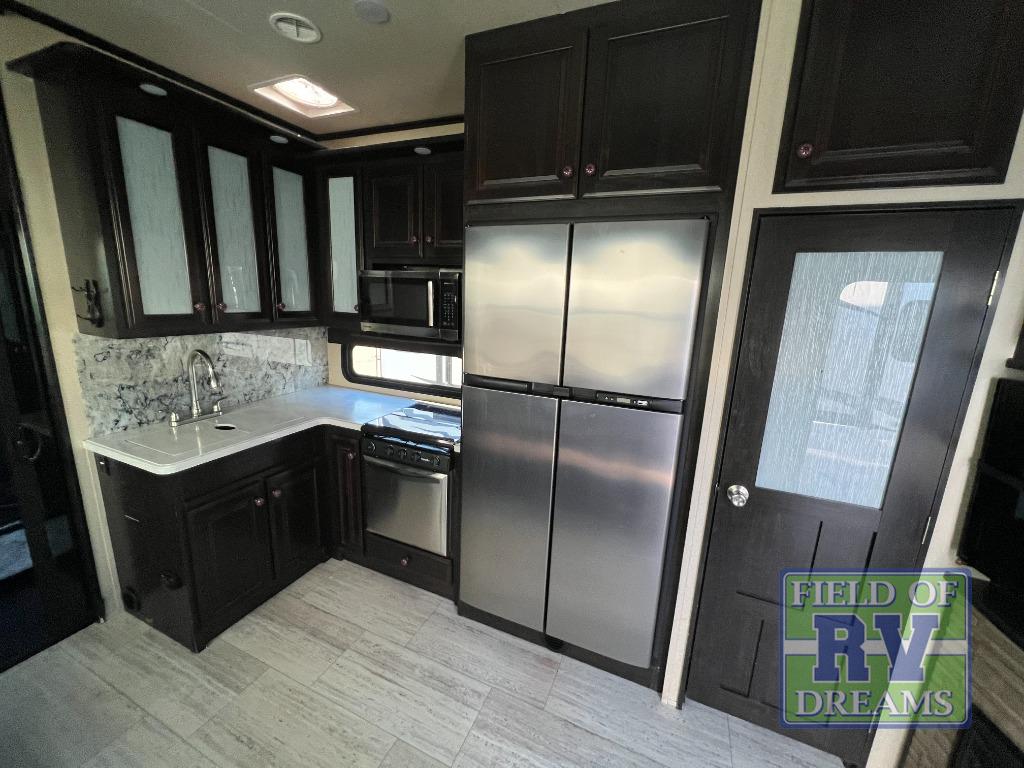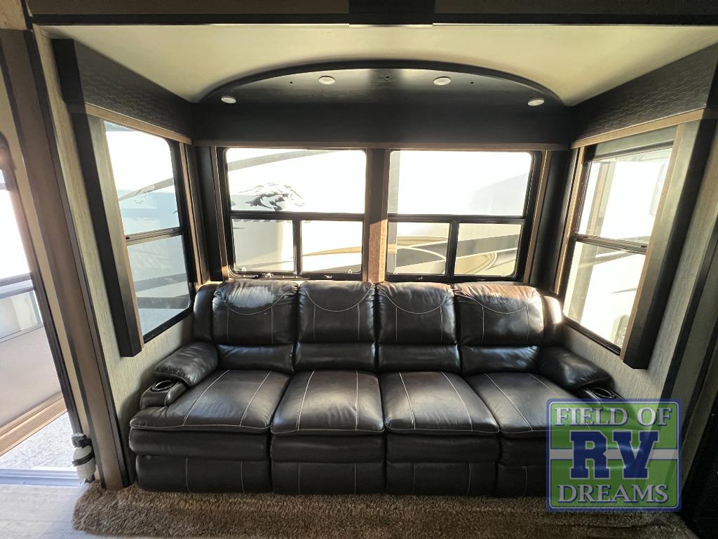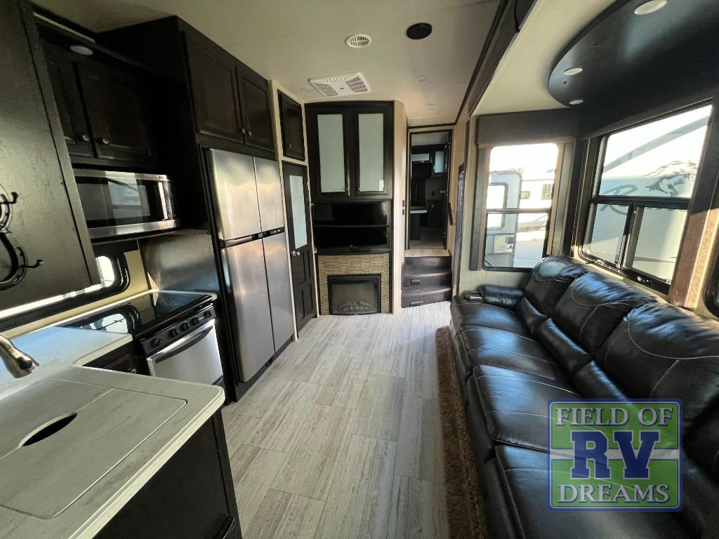 Step inside the main side entry door of the 328M and see just how spacious the interior is. To your left there is a large 4-seat sofa slide out with a stowable table for meals. You can choose a 4-seat sofa recliners/dinette option, or an optional smaller sofa recliner with a smaller dinette as well. A nearby entertainment center with LED TV is easily viewable.
