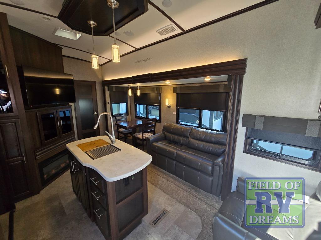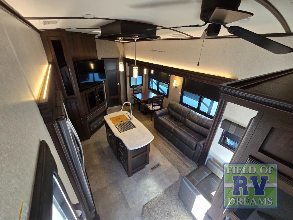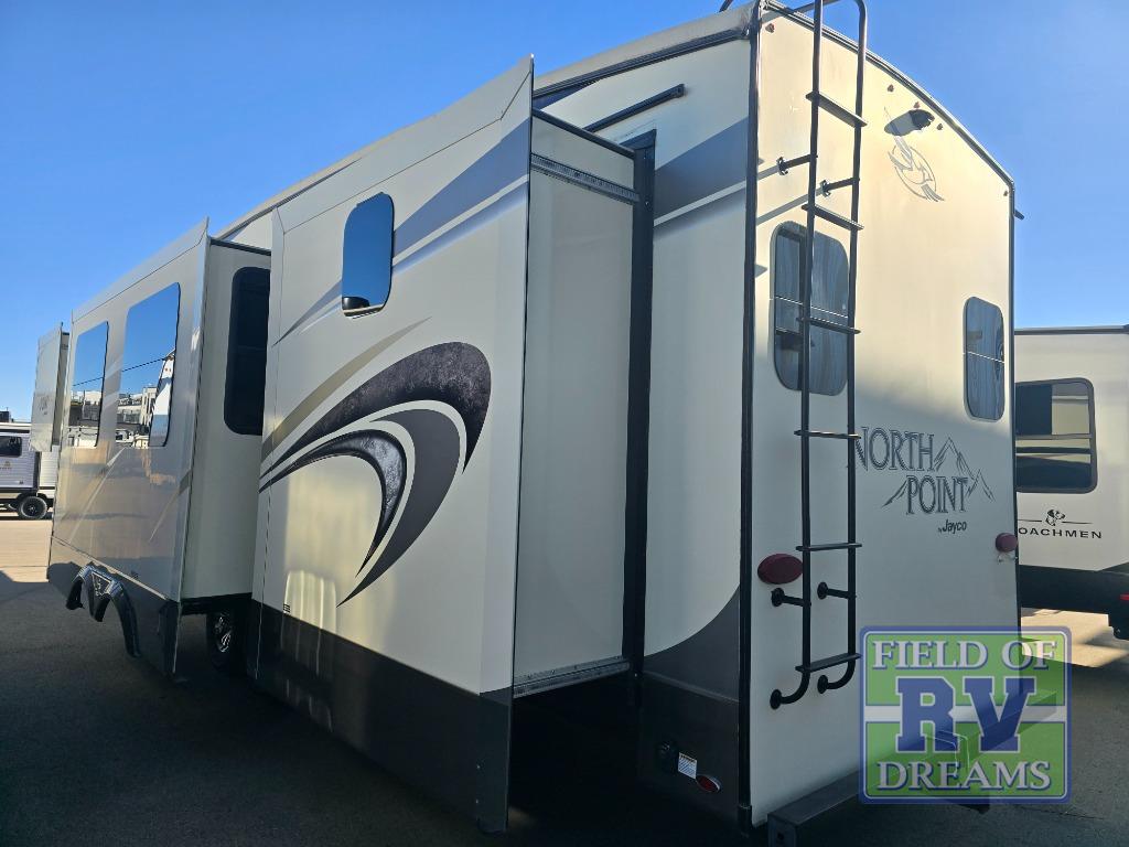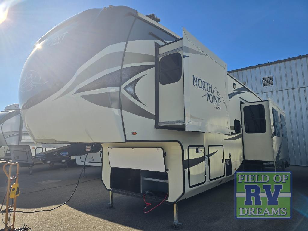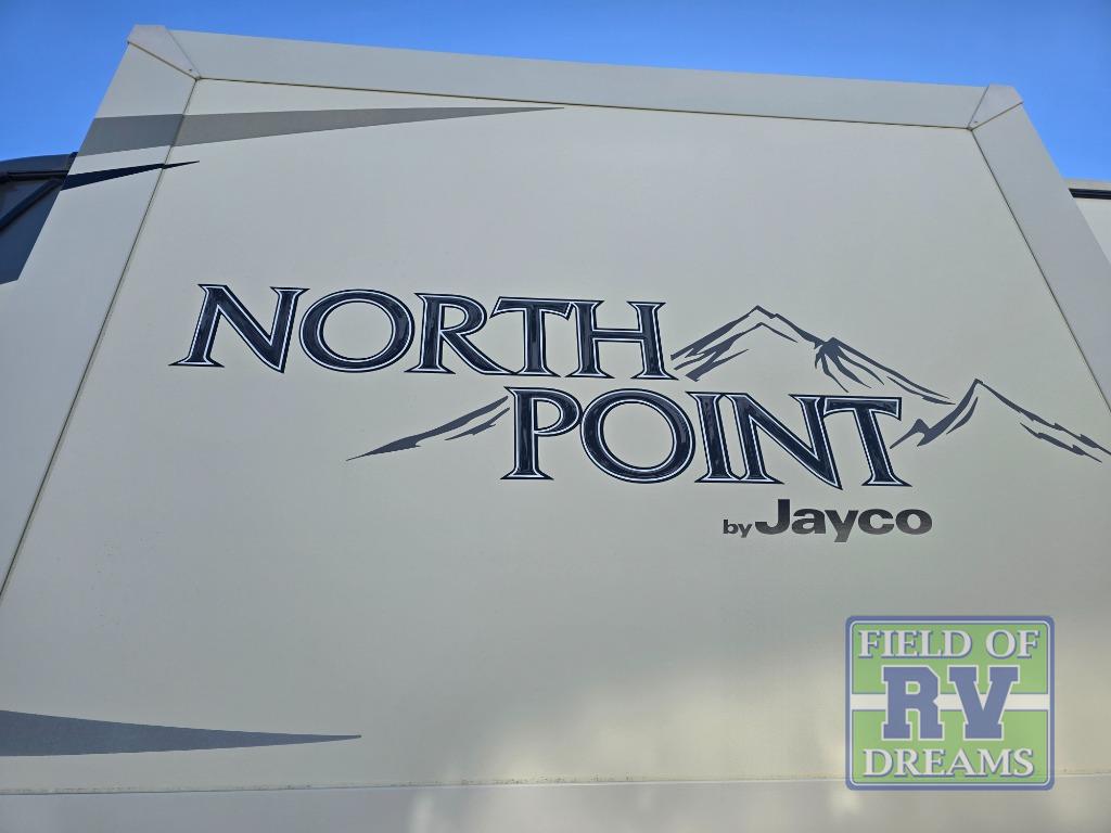 For any camping trip you will want a Jayco North Point fifth wheel. These models feature a Climate Shield which includes an enclosed, insulated, and heated underbelly, a high-BTU furnace, and Astrofoil in the roof and floors. Inside each model there is a Furrion Executive Chef gas cooktop, a stainless steel residential microwave, and USB charging centers in the living area, kitchen, and bedroom. The residential-grade wood-plank vinyl floor is easy to clean and will last for years to come. Now if that isn't enough to draw your attention, then you will like the mandatory North Point Luxury Package or the mandatory Customer Value Package which includes an arched interior ceiling, solid surface kitchen countertops, frameless G20 dark-tinted windows, slam-latch baggage doors and so much more!