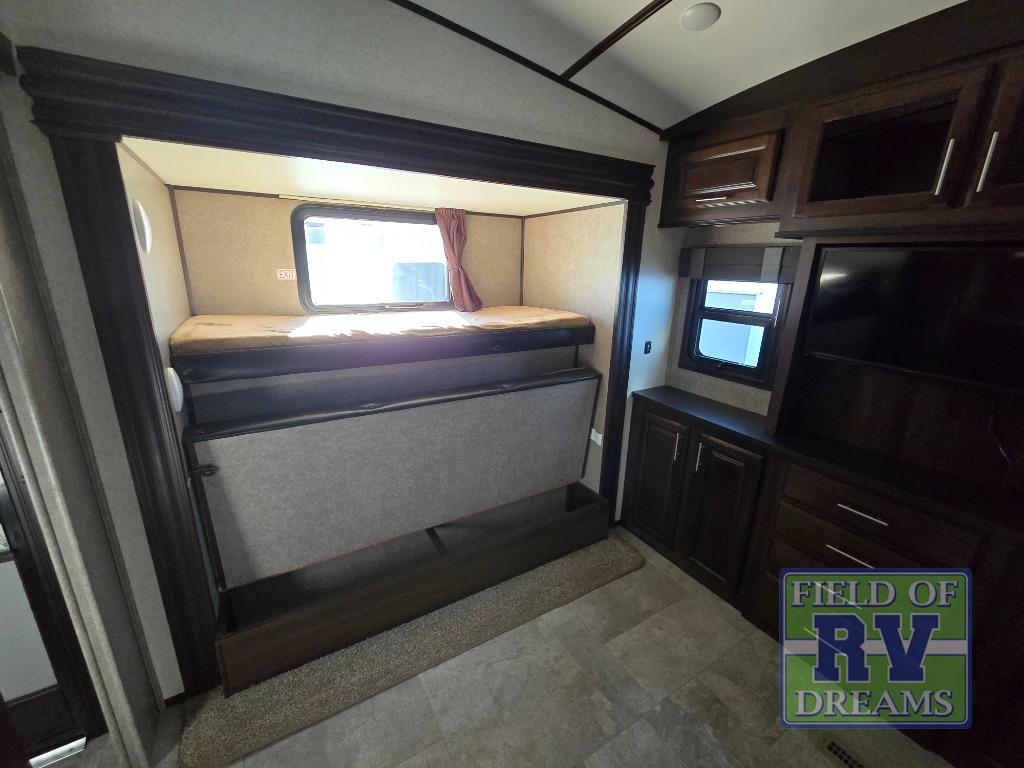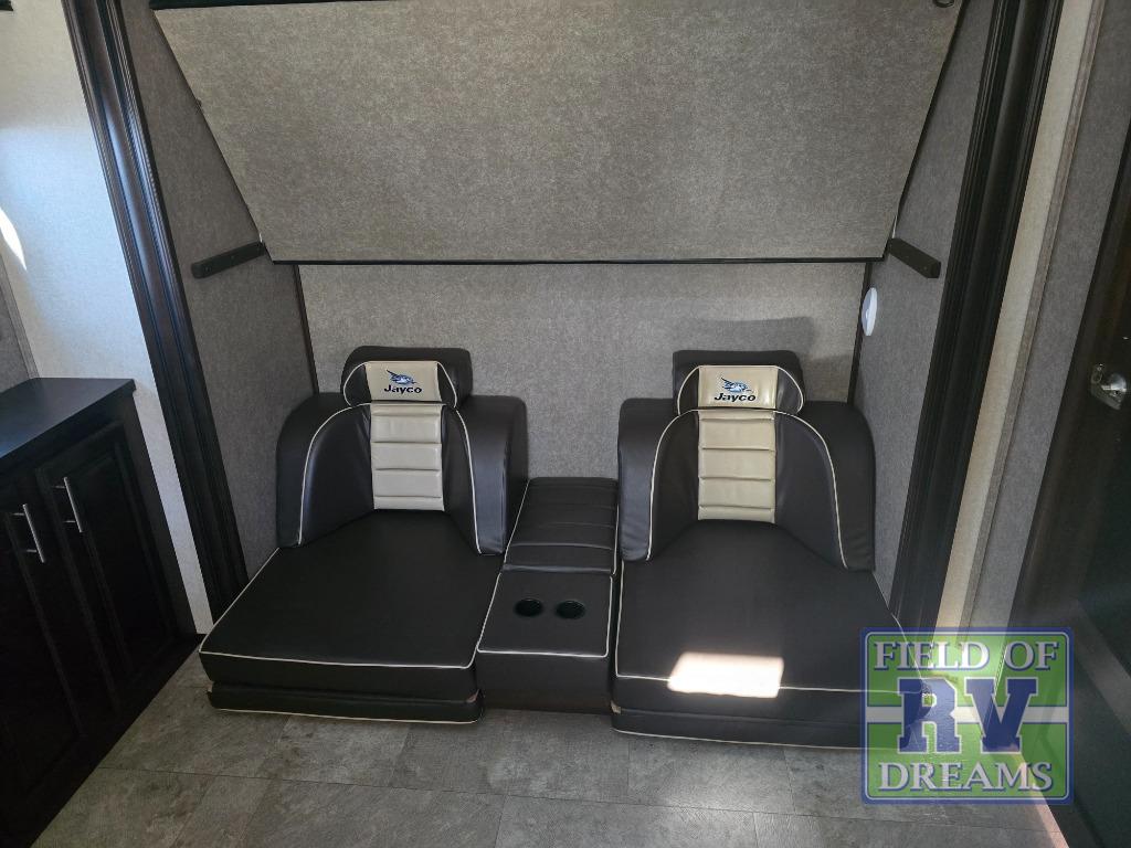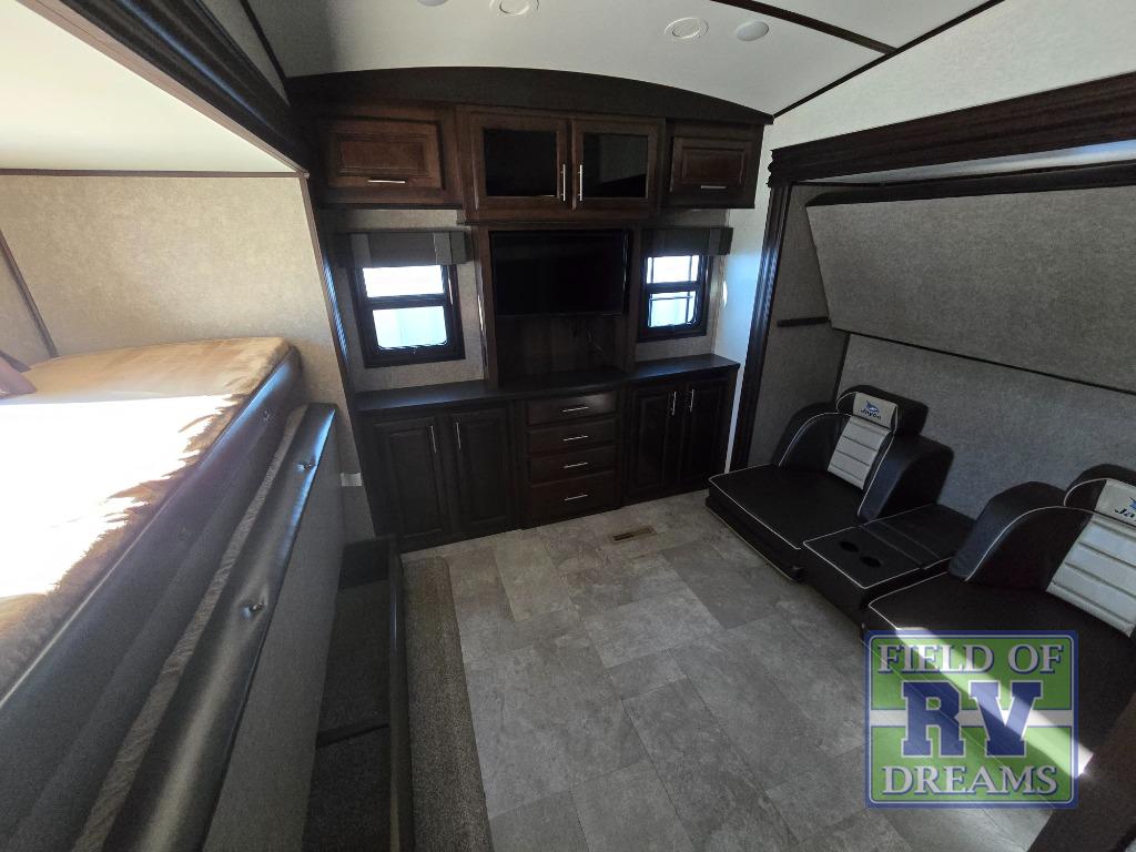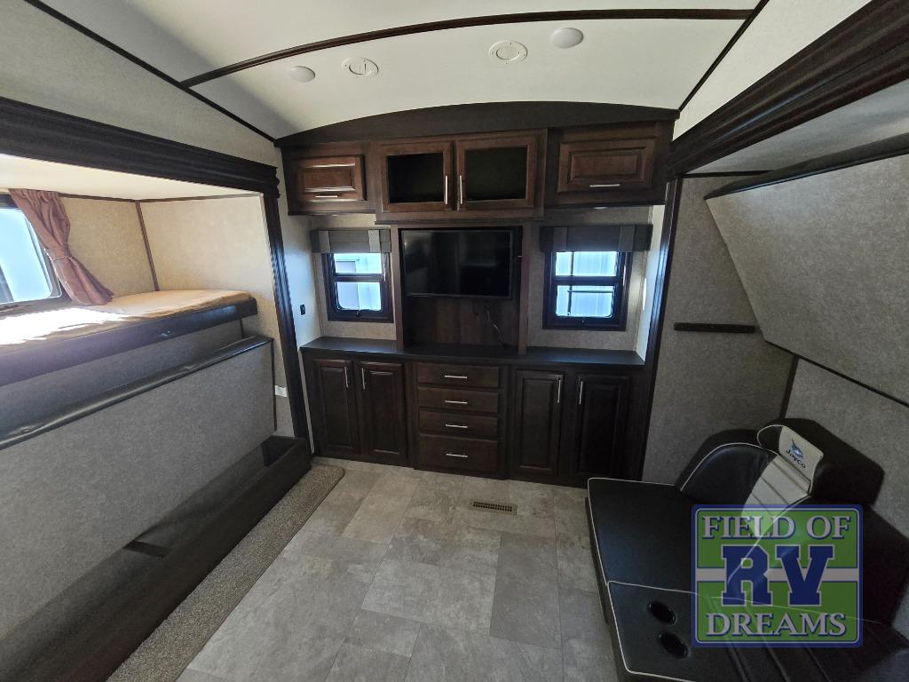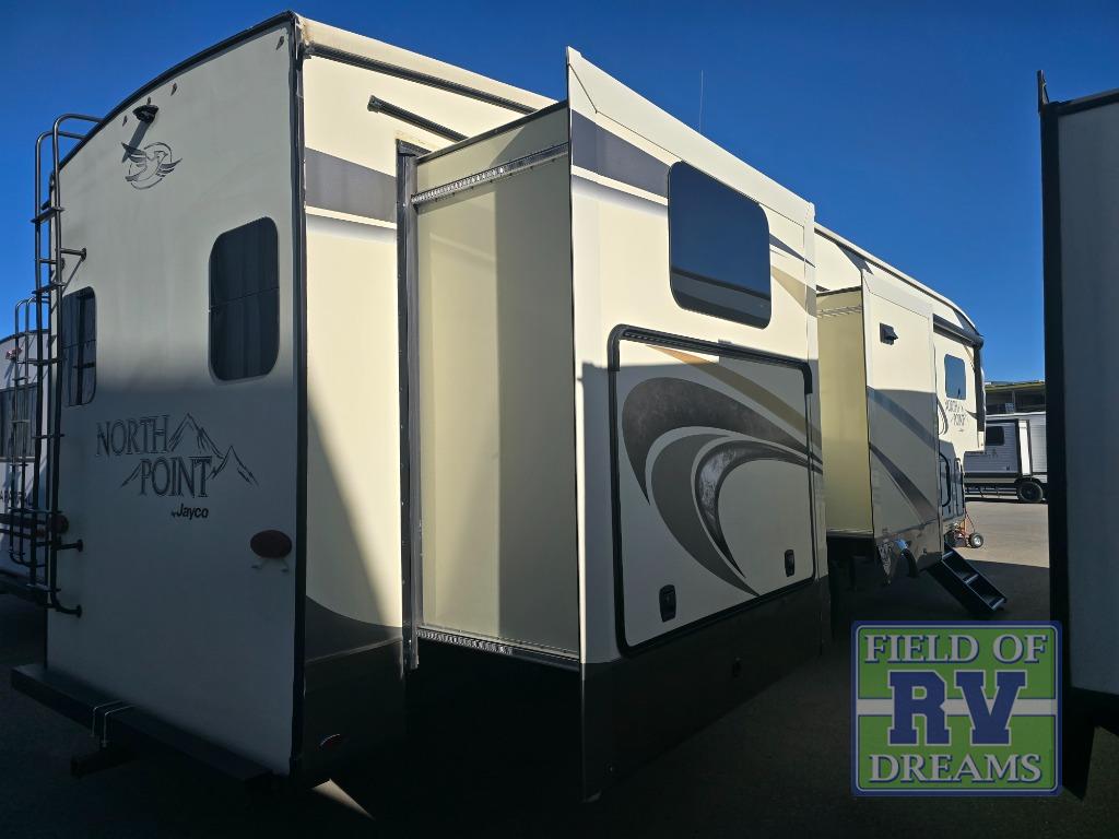 FIVE slide outs, an island with a double sink, a residential refrigerator, and an outdoor kitchen with TV are just some of the highlights throughout this North Point FW model 375BHFS by Jayco. You can easily enter this model from the two entry doors. The second door leads into the half bathroom. Your kids will enjoy their own space in the rear bunkhouse. Here you will find a set of game chairs and three bunk beds. In the private front bedroom you will find a queen bed, a walk-in closet for your hang up clothes plus there is a spot that has been prepped for a washer and dryer. If these are not enough features for you then come check out the options which include the following a king bed, a hide-a-bed in the bunkhouse, a free-standing table and chairs plus more!