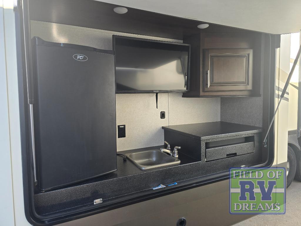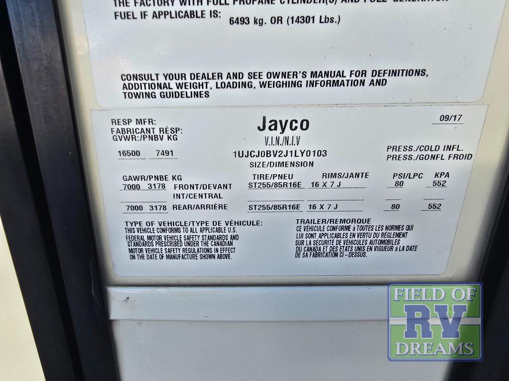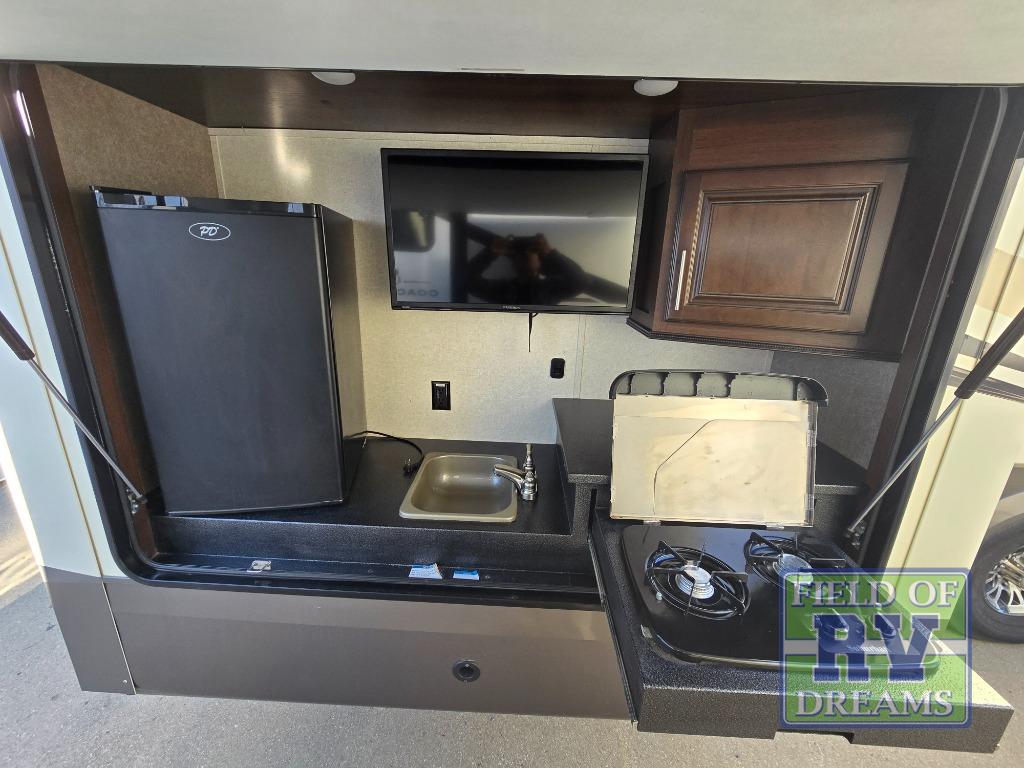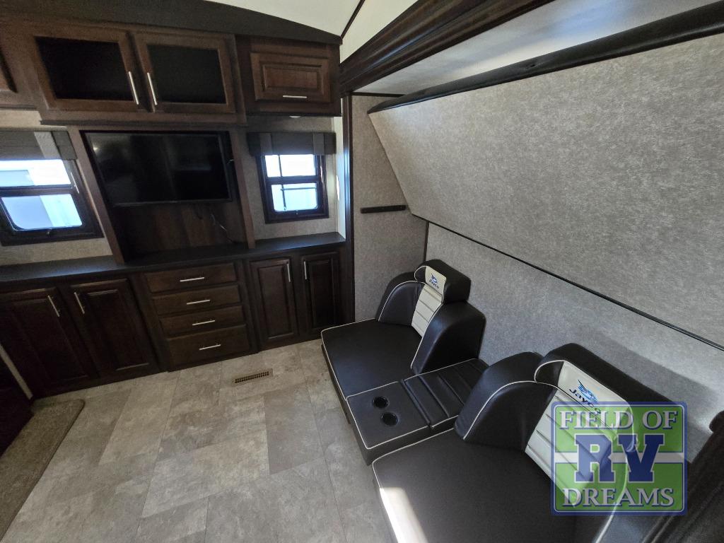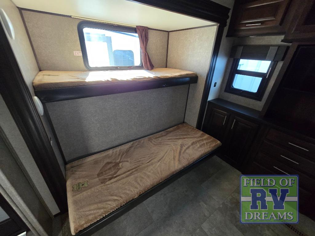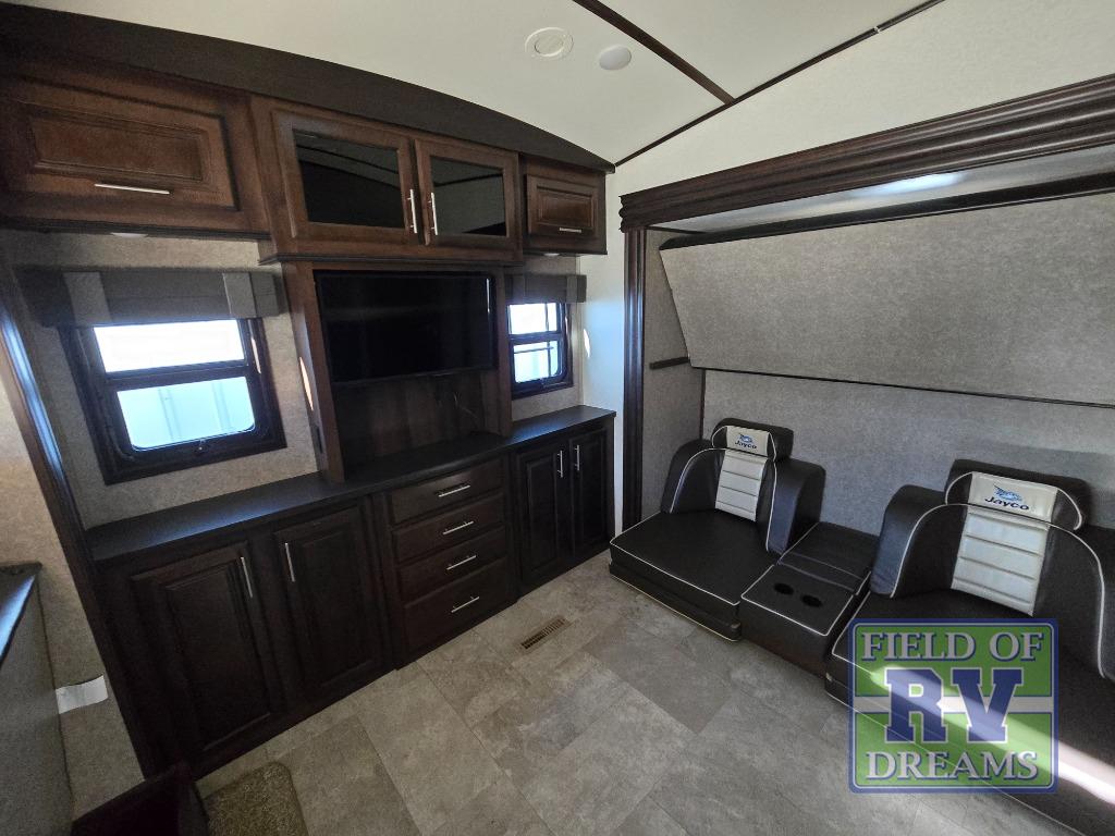 FIVE slide outs, an island with a double sink, a residential refrigerator, and an outdoor kitchen with TV are just some of the highlights throughout this North Point FW model 375BHFS by Jayco. You can easily enter this model from the two entry doors. The second door leads into the half bathroom. Your kids will enjoy their own space in the rear bunkhouse. Here you will find a set of game chairs and three bunk beds. In the private front bedroom you will find a queen bed, a walk-in closet for your hang up clothes plus there is a spot that has been prepped for a washer and dryer. If these are not enough features for you then come check out the options which include the following a king bed, a hide-a-bed in the bunkhouse, a free-standing table and chairs plus more!