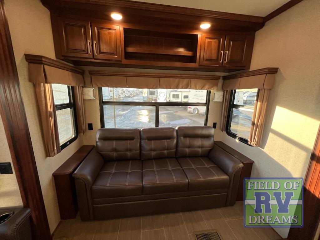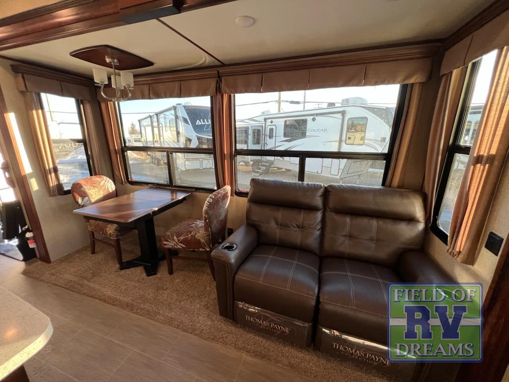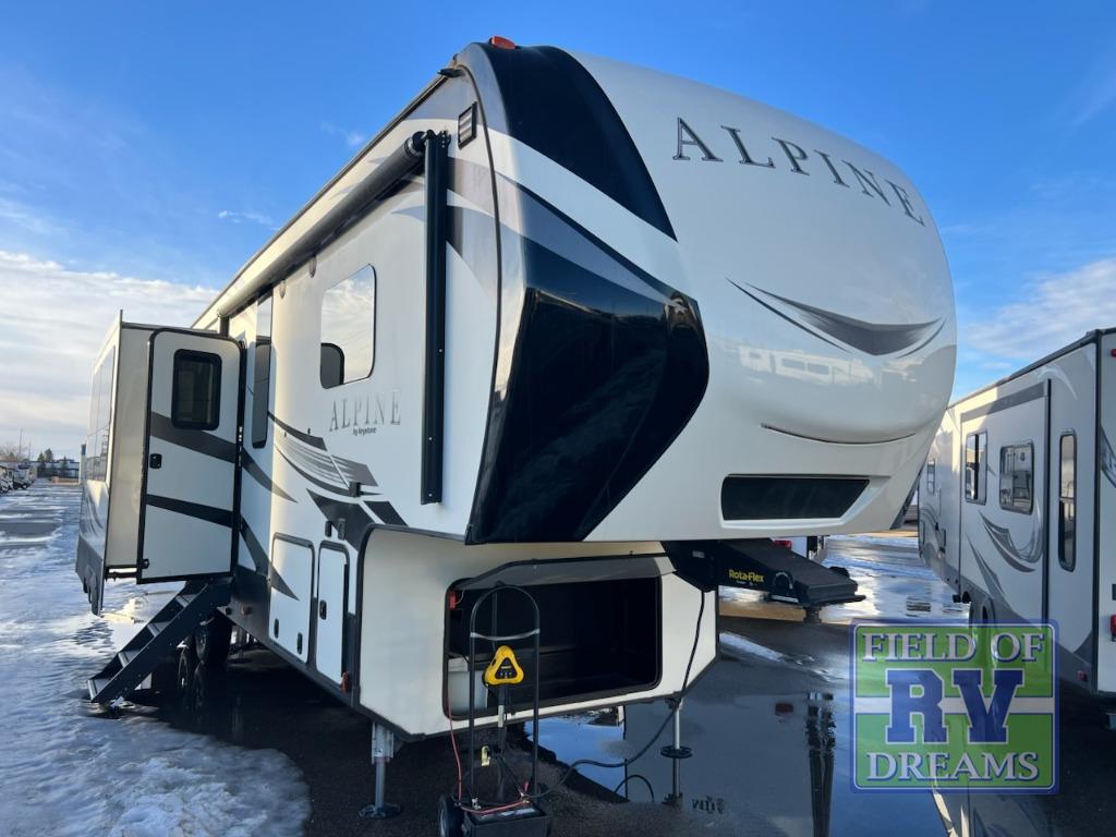 Are you ready for a cozy weekend away with this Alpine 3400RS fifth wheel at your favorite destination? Throughout this model, you will enjoy all of the livable space with triple slide outs. In the evenings plan to have a fire in the fireplace and relax on the tri-fold sofa or the lounge chairs and watch a movie on the 50" LED TV. Your meals can be enjoyed at the free-standing table, and meal prep is easy with the kitchen island, two burner range, and there is a large refrigerator for your food storage. The front bedroom has a king bed with storage below, plus more storage can be found in the closet and chest of drawers.
