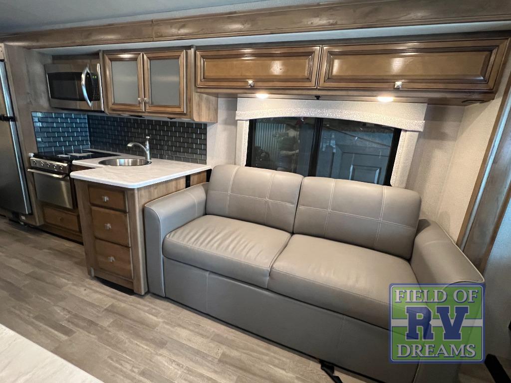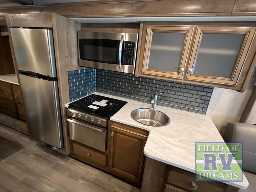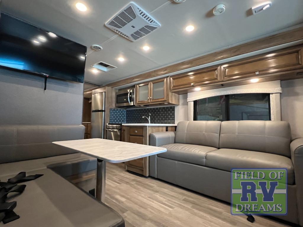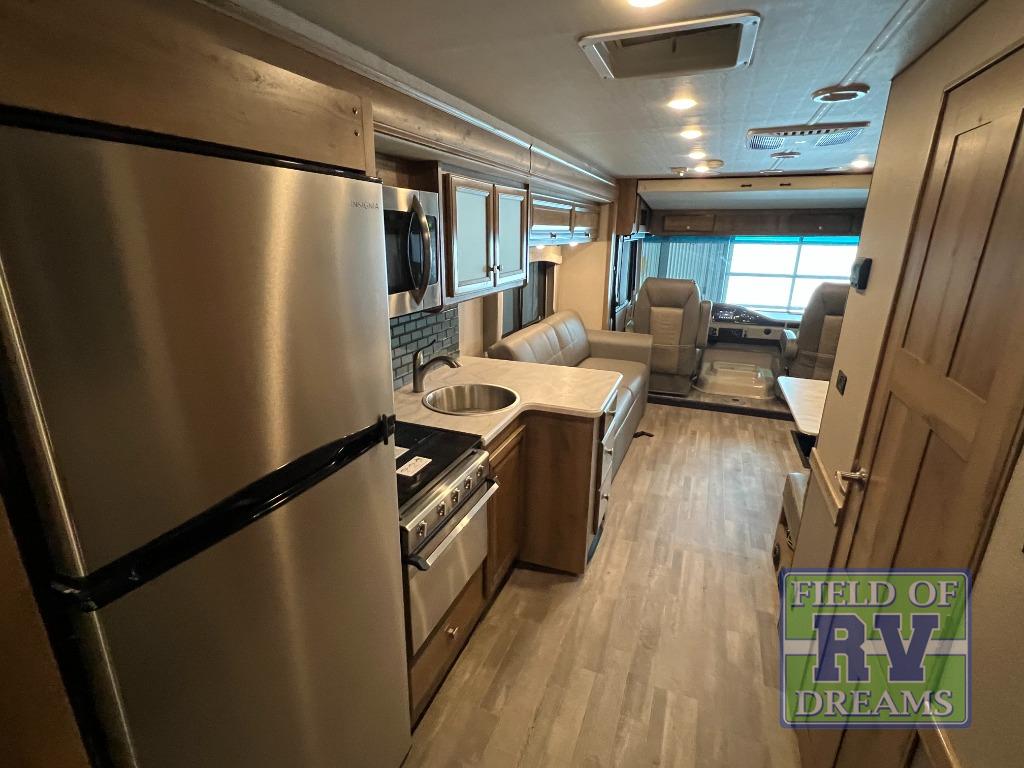 For a little rest and relaxation you will want this Flair motorhome to travel in. There is plenty of interior space thanks to the full wall slide that gives a more at-home feel. This model has seating space on the 74" jack knife sofa, plus you can enjoy family dinners at the 64" x 42" L-shaped dinette. After a long day of driving to your destination, turn in for the night in the rear bedroom that includes a Serenity Series king bed, a wardrobe, and a 32" TV. You will love being able to store food for the week with a residential refrigerator in this unit, plus plenty of counter space for meal prepping. This motorhome also features a true exterior kitchen for cooking outdoors and enjoying the mountain air!