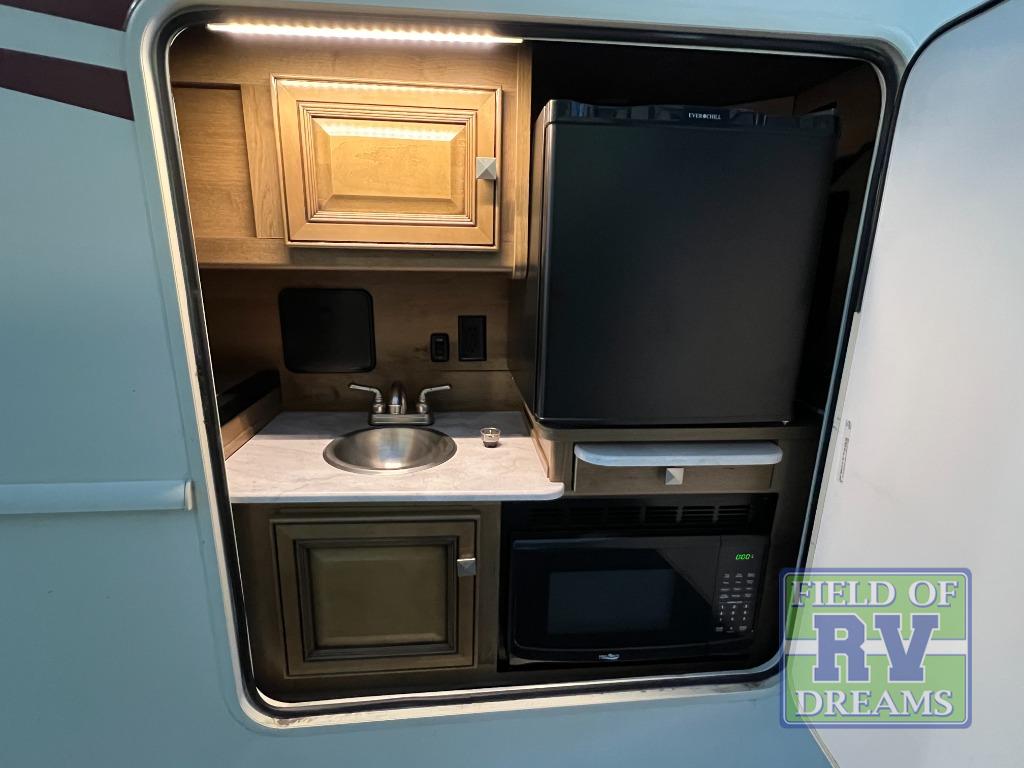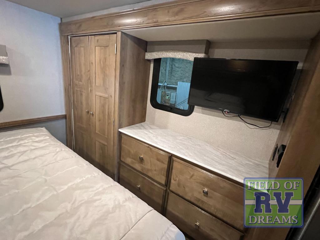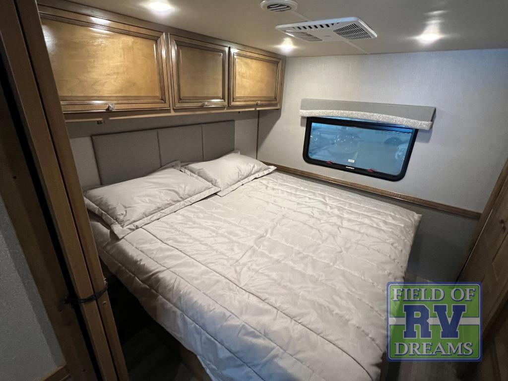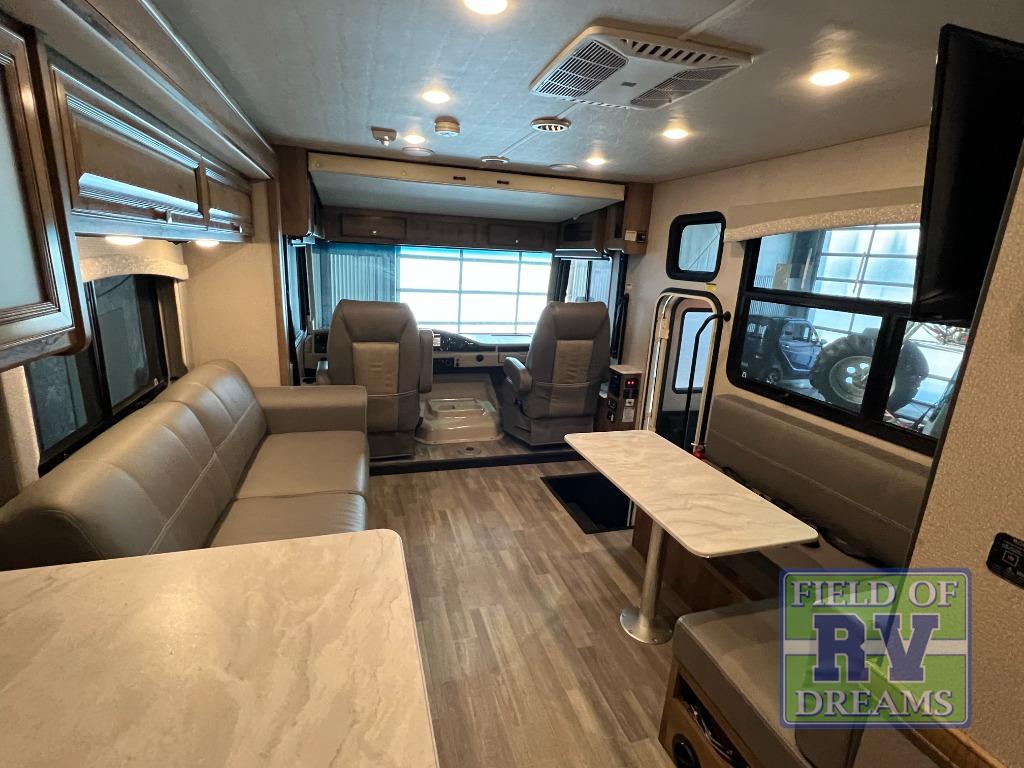 For a little rest and relaxation you will want this Flair motorhome to travel in. There is plenty of interior space thanks to the full wall slide that gives a more at-home feel. This model has seating space on the 74" jack knife sofa, plus you can enjoy family dinners at the 64" x 42" L-shaped dinette. After a long day of driving to your destination, turn in for the night in the rear bedroom that includes a Serenity Series king bed, a wardrobe, and a 32" TV. You will love being able to store food for the week with a residential refrigerator in this unit, plus plenty of counter space for meal prepping. This motorhome also features a true exterior kitchen for cooking outdoors and enjoying the mountain air!