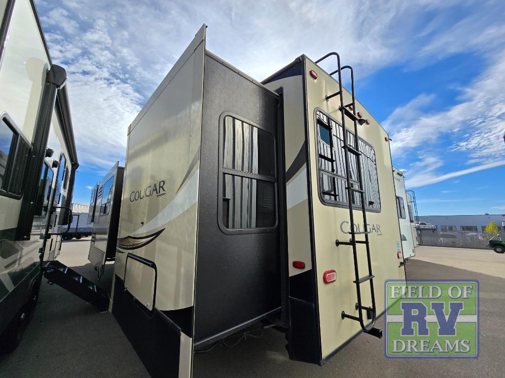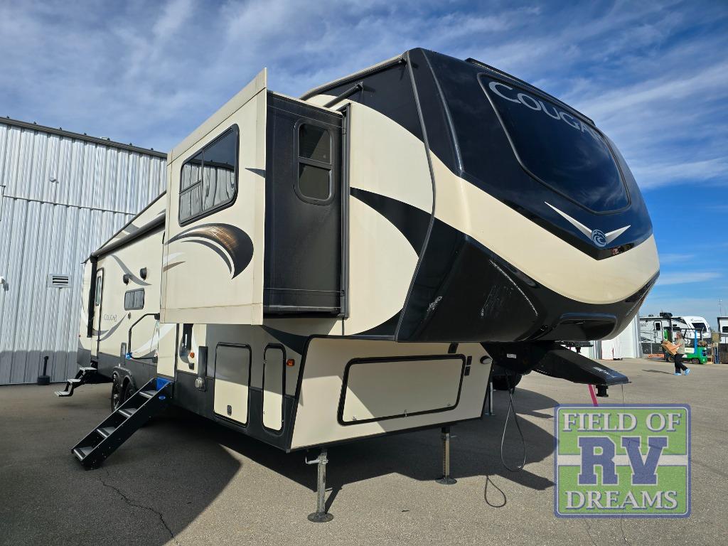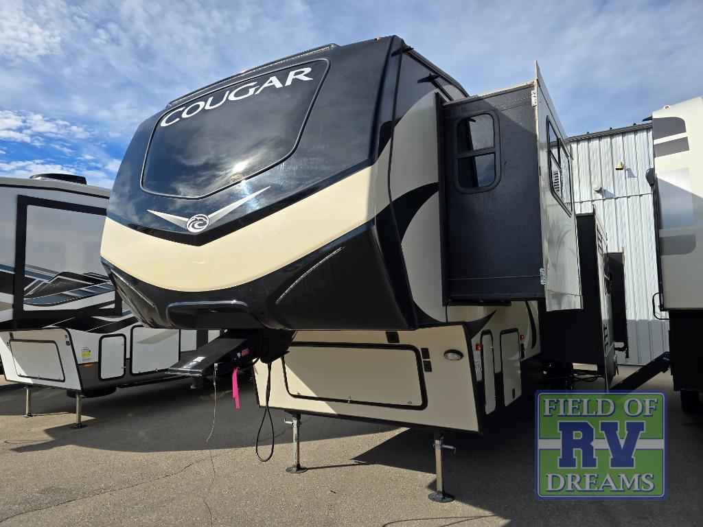 This Cougar will have you traveling every chance you get or maybe even turn you into a full-timer. From the front Patent-pending windshield design giving you amazing views while entertaining guests in the separate living area up front to the dual entry, you will love this fifth wheel. There is plenty of seating for everyone in the separate living area, and you will find a dinette in the kitchen. The convenient double entry bath allows hallway access for your friends and bedroom access for you. The bedroom also includes a slide and the second entry into the unit. You will find plenty of storage for your things inside, and the exterior unobstructed pass-through storage allows you to bring along larger items such as your outdoor mat and table, grilling utensils, and fishing rods. You can even entertain outdoors under the 20 foot awning. Take one look, and you will be hooked!