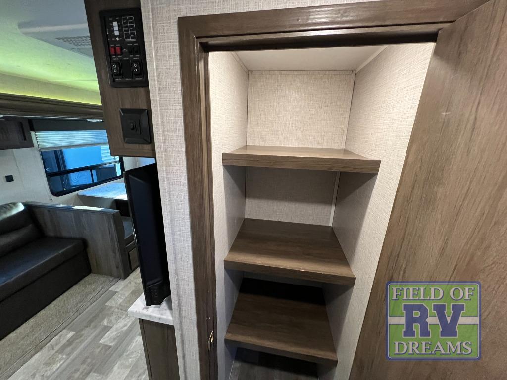 From its full rear bathroom with a 30" x 36" shower and linen closet to its front private bedroom with a king-size bed, under-bed storage, and bedside wardrobes, this Della Terra travel trailer allows you to live just as comfortably as you do at home! The large slide creates extra floor space in the main living area so that you can gather together on the sofa and booth dinette without feeling cramped, and you will be able to grab your favorite snacks from the walk-in pantry before sitting down for a night full of games. And the kitchen offers everything you will need to keep your bellies full including a 10 cu. ft. stainless steel refrigerator.