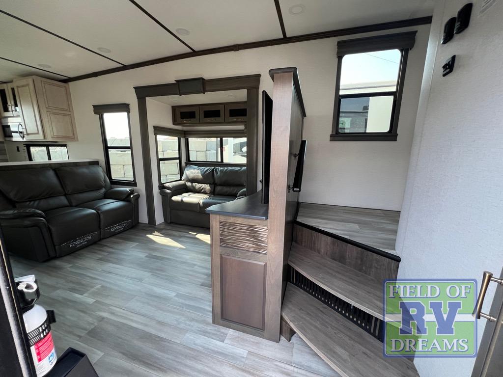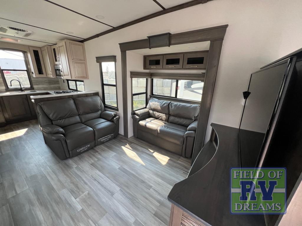 This Paradigm fifth wheel has an amazing rear kitchen that will make it both easy and enjoyable to prepare dinner each evening! The Insignia microwave, Insignia four-burner range, 3.73 cubic foot oven, 18 cubic foot refrigerator, and preparations for a dishwasher are just a few of the features that truly make this kitchen great. You can sit down at the floating dinette table with chairs to enjoy that meal, or you can head into the living room to sit back on the sleeper sofas or the dual recliner love seat. The dimmable LED lighting makes it easy to adjust the brightness level of the interior, and the two Smart TVs are super convenient to have when you have to stay inside because of the rain.