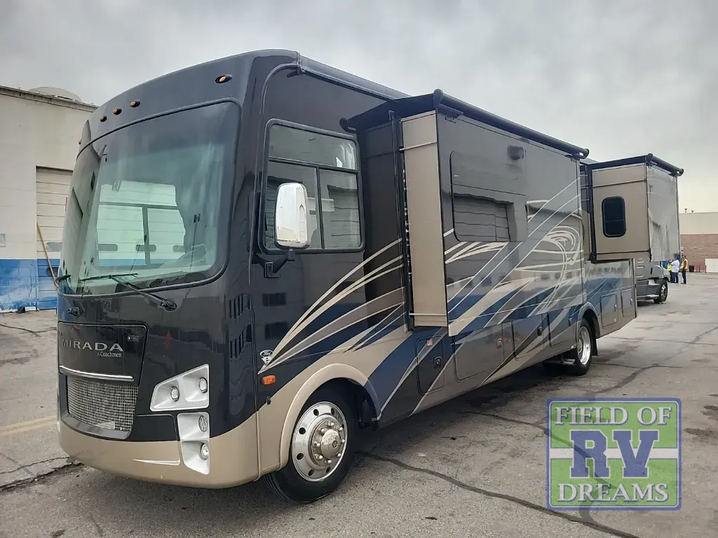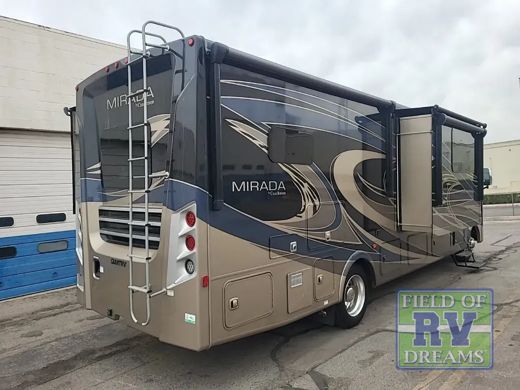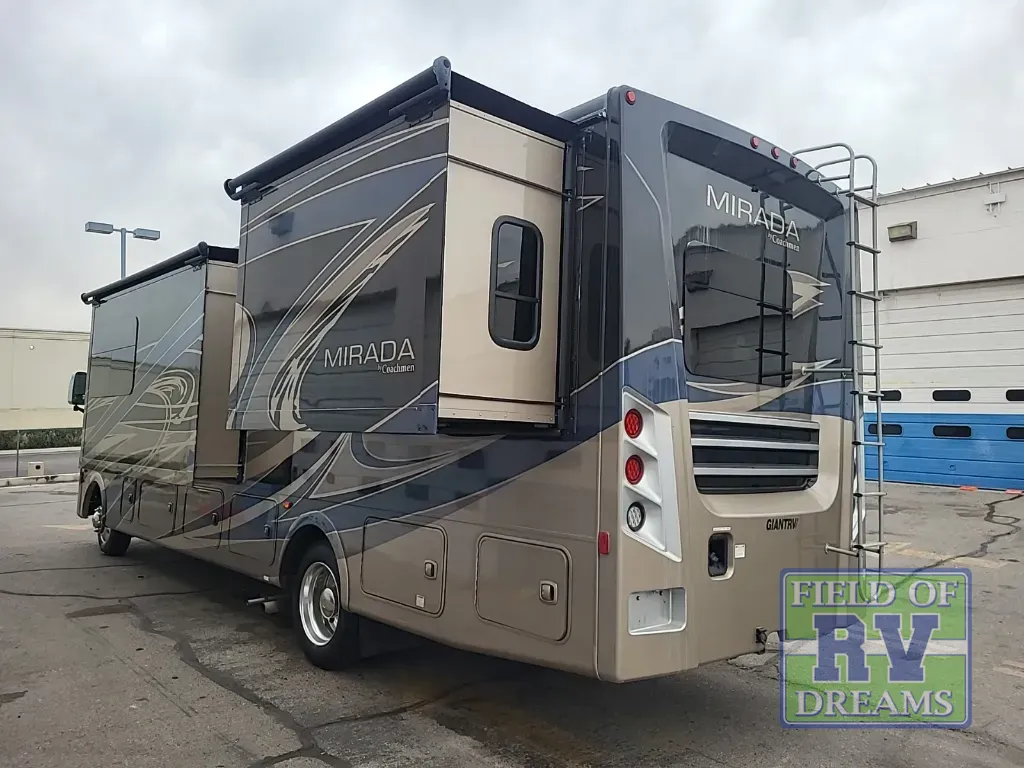 If you're looking for more space and more comfort, you've found it in this Mirada motorhome! The dual opposing slides in the main living area give you extra floor space and you'll find a third slide out in the rear private bedroom. Once you arrive at your destination you can relax on the sofa or booth dinette, and there is a 50" TV on a lift so the kids can watch their favorite shows. The adults may want to head outside to relax under the power awning and watch the game on the exterior LED TV. This model features a private toilet and sink, with the shower right across the hall so two people can clean up at once, and there is a convenient linen closet right next to the shower for fresh towels. When it's time to call it a night, the kids can sleep on the drop-down overhead bunk or on the comfortable furniture. You and your spouse will love the rear private bedroom with a king bed slide out, a wardrobe for your clothes, and a 32" LED TV so you can watch the late-night news. There is even a space prepped to add an optional washer and dryer if you choose!