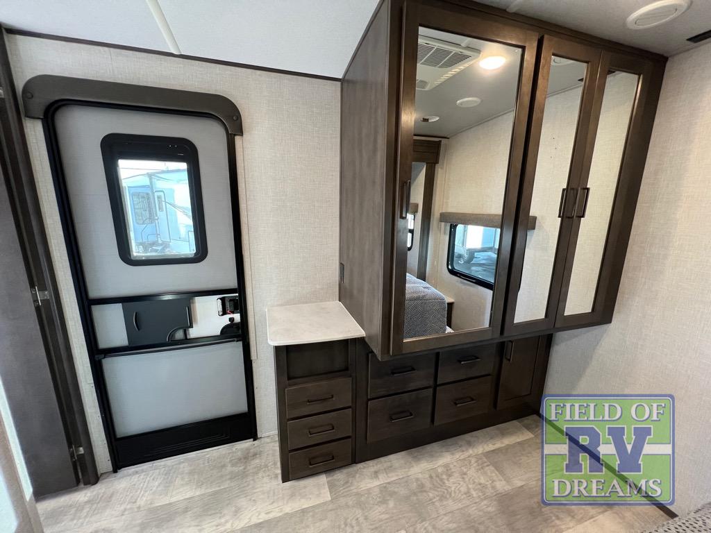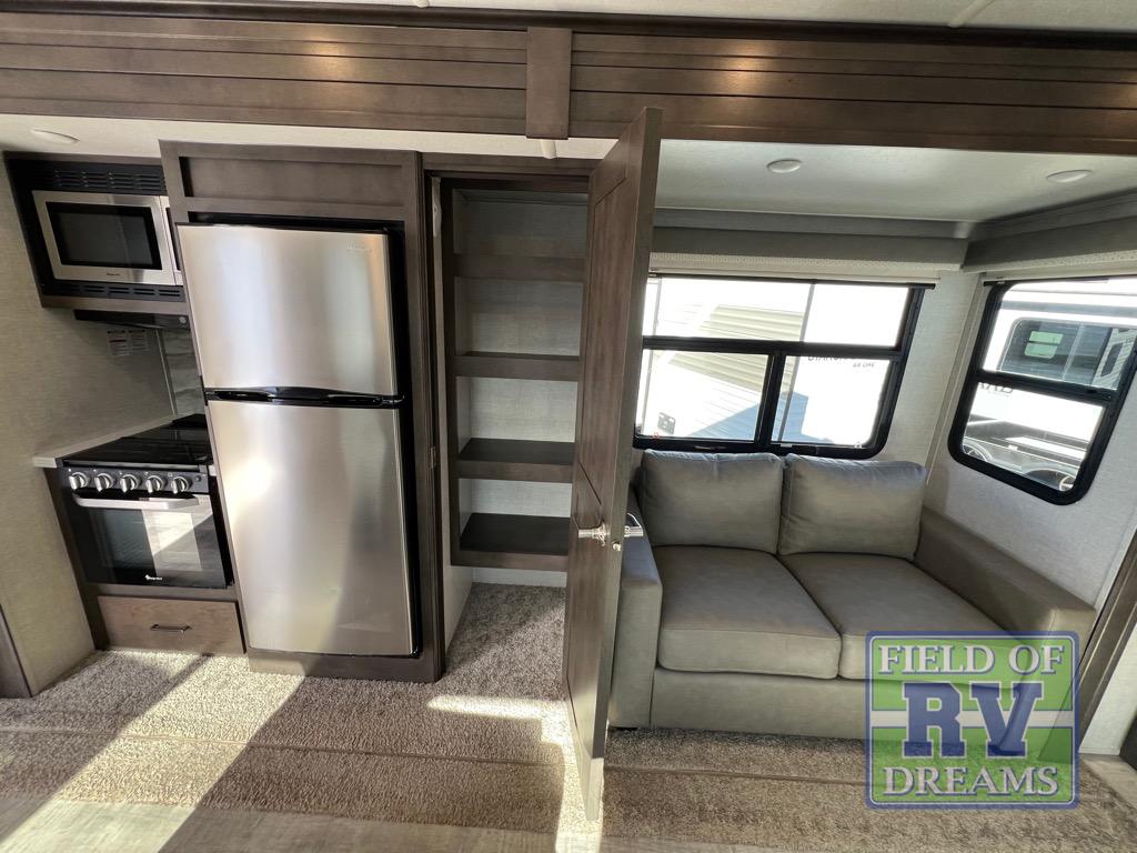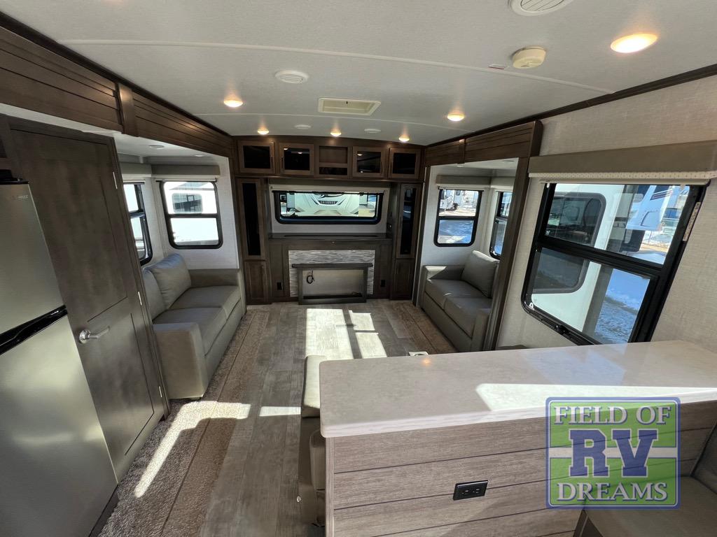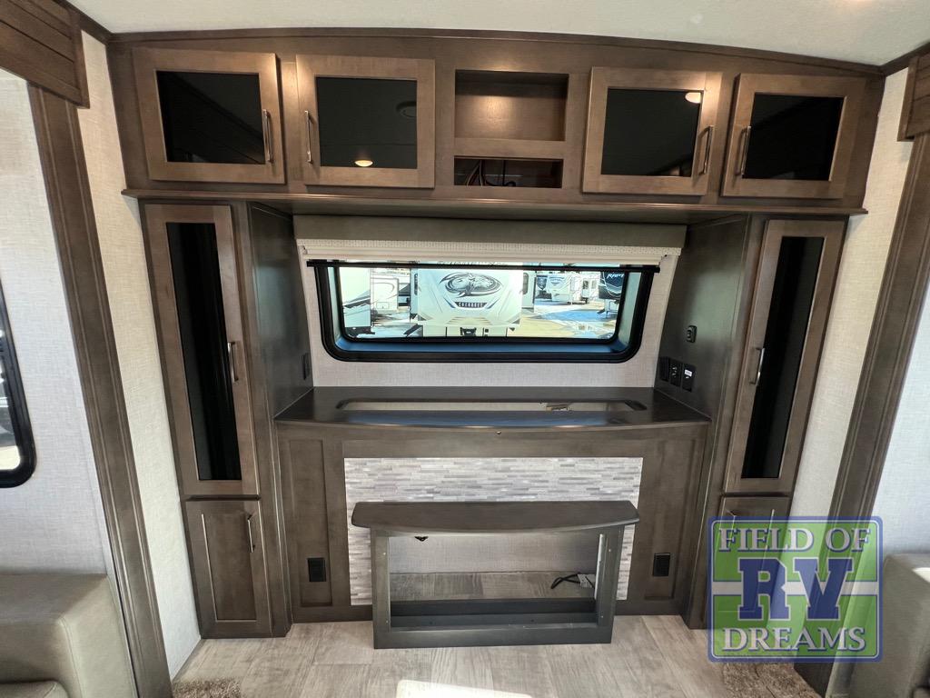 This dual entry travel trailer is the one you've been looking for! Easily set up the 20' power awning before stretching your legs around the campsite. There is a three burner range, a microwave oven, plus a 21' gas oven to prepare meals each day, and you can dine at the table and chairs that include bench seating on one side. If it's a rainy day you will probably find the kids in the front living area that includes a front entertainment center with a fireplace, dual hide-a-bed-sofas, plus a theater seat directly across from the LED TV. The rear master suite is packed with features such as, a king bed slide out, a large wardrobe, and its own exterior entry door!
