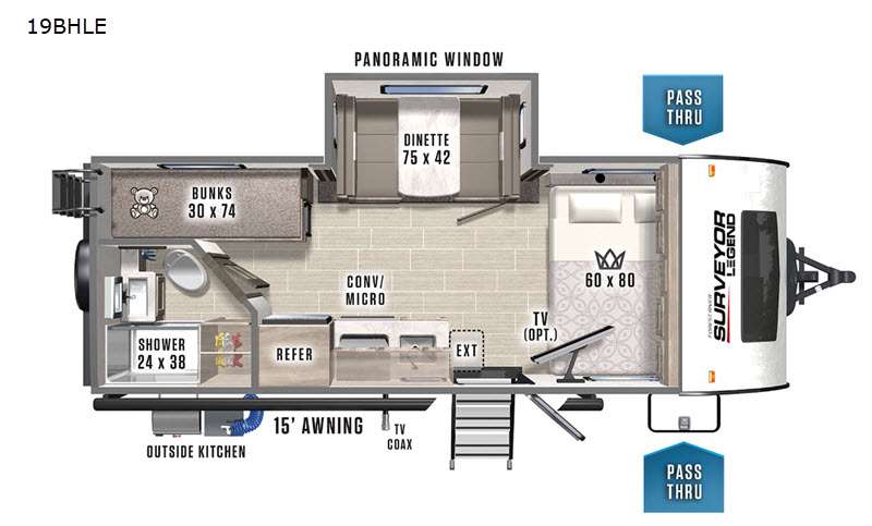 For a truly fun and relaxing camping trip, choose this Surveyor Legend Sub-4,000LB travel trailer that includes bunk beds for the kids. The queen bed at the front of the trailer is just the right size for a good night's rest. Everyone can gather at the booth dinette within the slide out for a meal together, and the dinette can also transform into an extra sleeping space at night. This trailer includes multiple overhead compartments and an exterior pass-through storage for your larger camping gear. After a long day of exploring, clean up in the full bath before heading outside to sit under the 15' electric awning with family or use the outdoor kitchen to create something delicious.