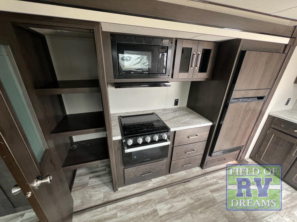 With a private bedroom up front and a full bathroom in the back, this Transcend Xplor travel trailer gives you a very comfortable layout for your travels! Right in the heart of the trailer is where you will find your main living area, and the theater seating and booth dinette provide great places to sit down and reminisce about the day's events. Just across from those pieces of furniture is the kitchen, so you can stay involved in the conversation even while you prepare dinner on the three-burner range with oven. There is also a pet drawer beneath the double-door refrigerator so that your furry friend can eat their dinner too.