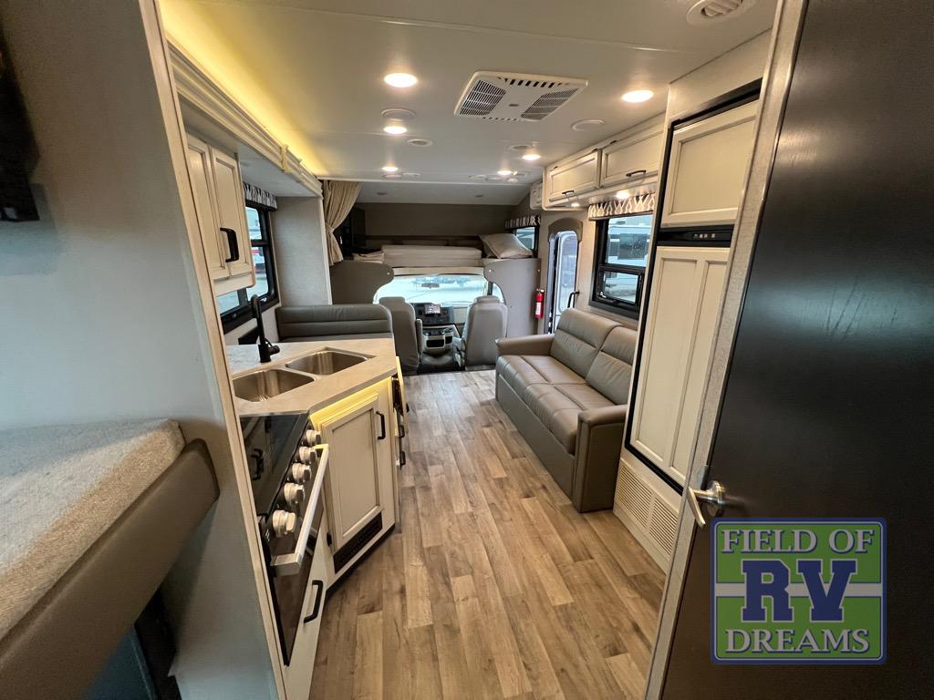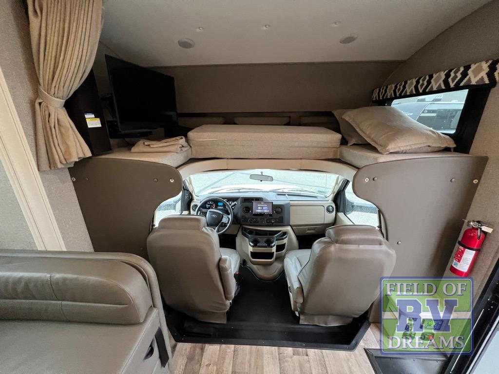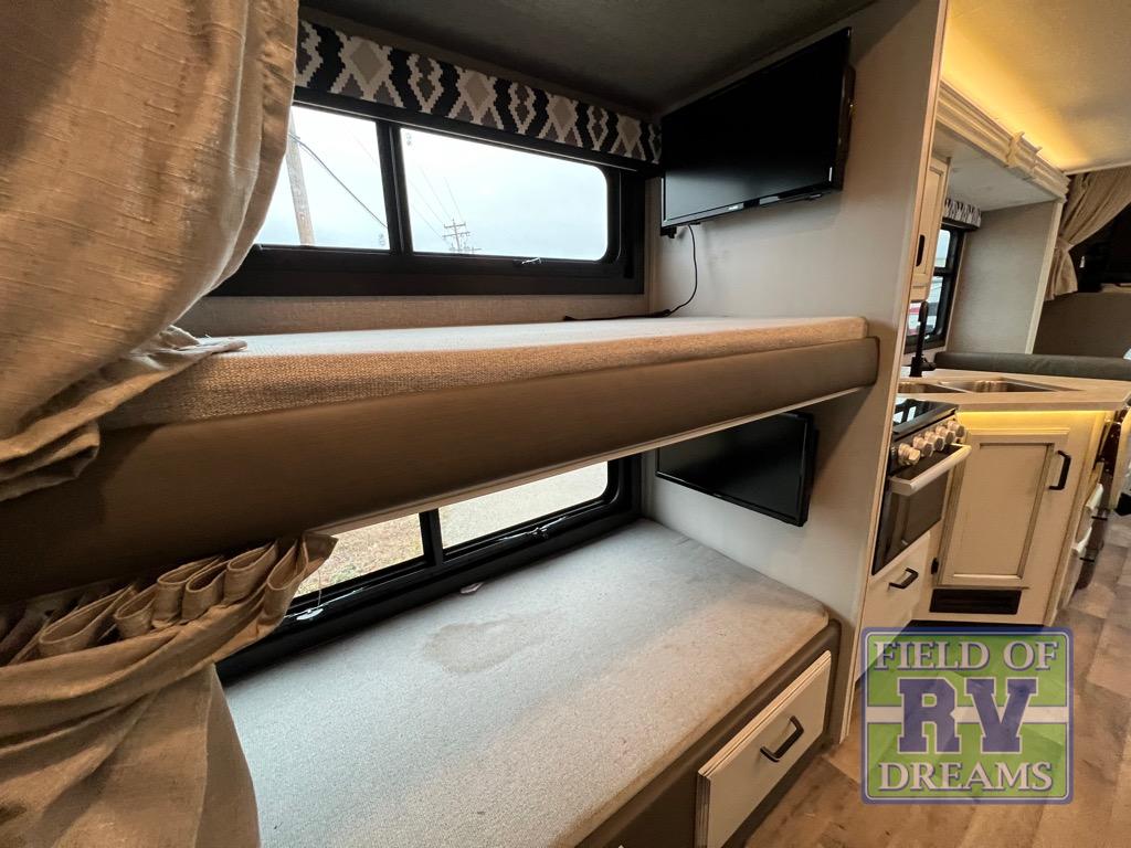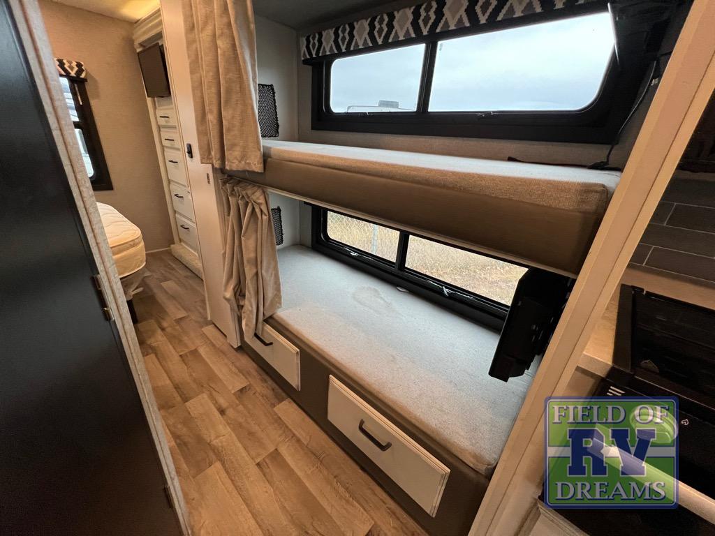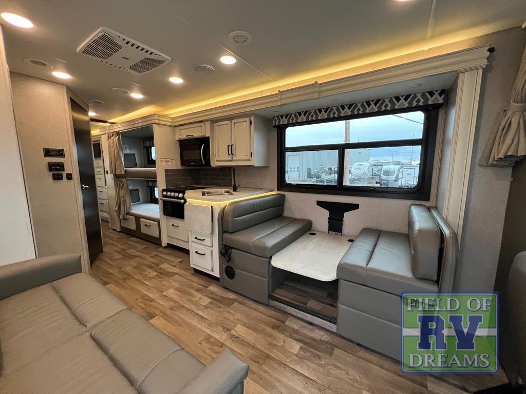 The grandkids will love this motorhome that includes bunk beds, plus a cab-over bunk for added fun. The full-wall slide will provide tons of interior space, and you'll find plenty of seating space on the sofa, the booth dinette, and the swivel captain's seats. This model includes a 40" Furrion fireplace under the LED HDTV for a more at-home feel, plus a dual entry bath that will create a rear master bedroom you and your spouse are sure to love. Whether you're prepping dinner on the countertop extension, relaxing under the 16' electric awning, or taking a rest on the walk-around queen bed, you will truly love this motorhome!