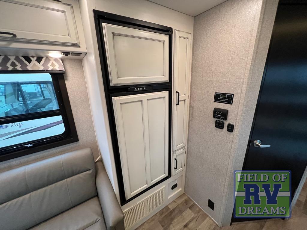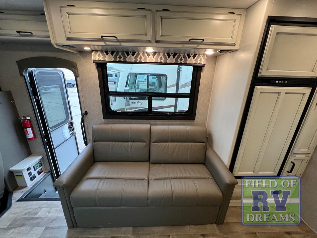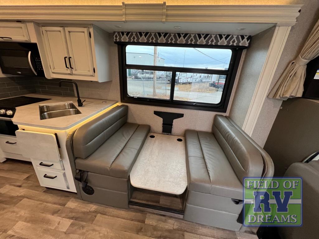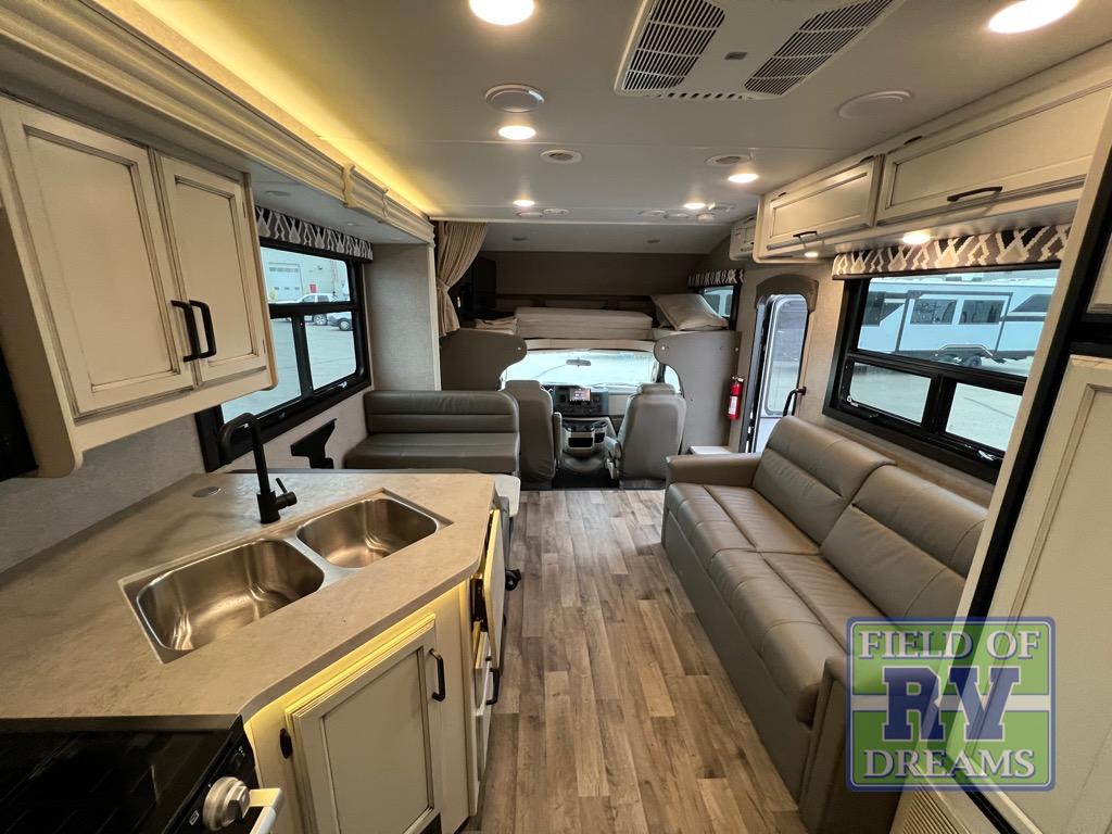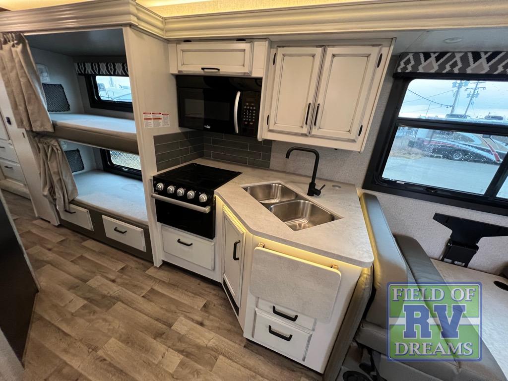 The grandkids will love this motorhome that includes bunk beds, plus a cab-over bunk for added fun. The full-wall slide will provide tons of interior space, and you'll find plenty of seating space on the sofa, the booth dinette, and the swivel captain's seats. This model includes a 40" Furrion fireplace under the LED HDTV for a more at-home feel, plus a dual entry bath that will create a rear master bedroom you and your spouse are sure to love. Whether you're prepping dinner on the countertop extension, relaxing under the 16' electric awning, or taking a rest on the walk-around queen bed, you will truly love this motorhome!