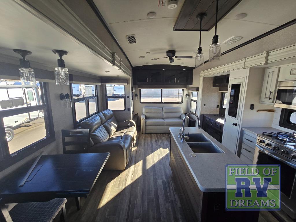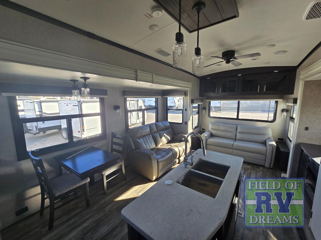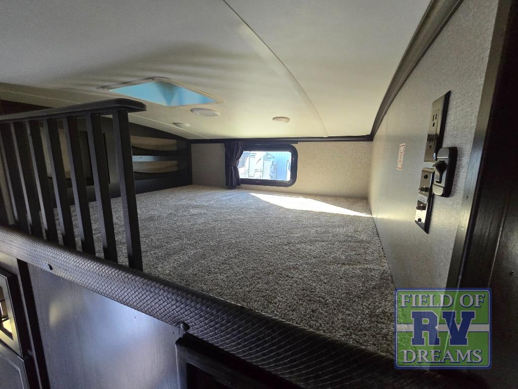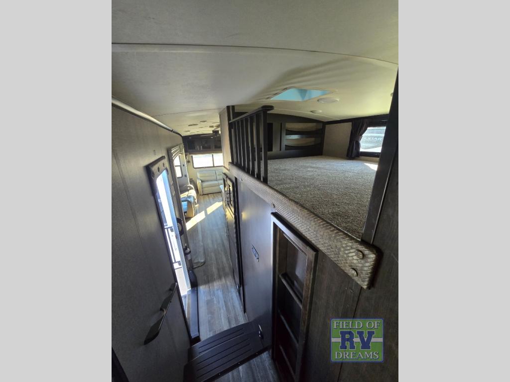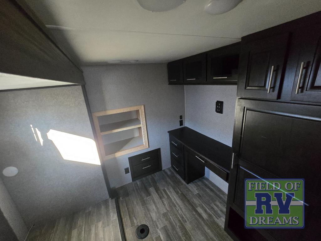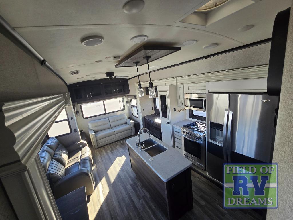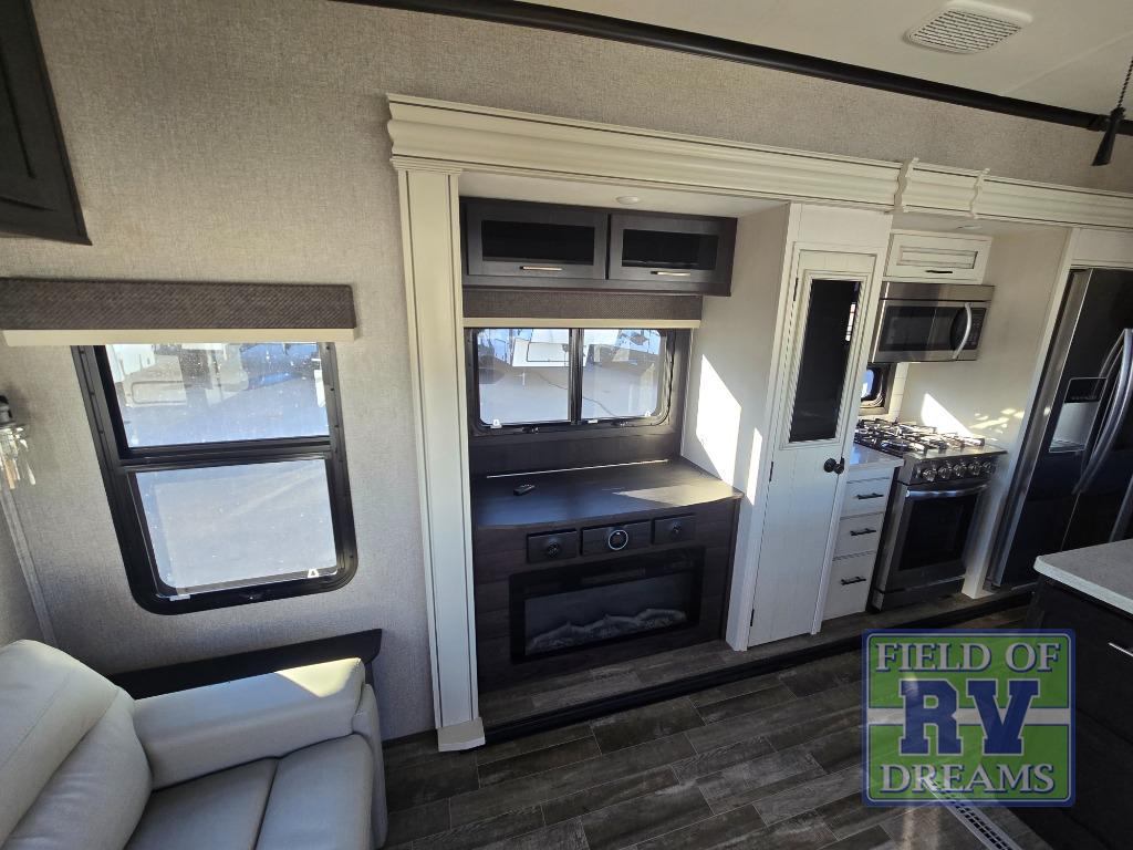 You can bring the whole family with two bedrooms in this fifth wheel! The front private bedroom features a queen bed, a front wall walk-in closet with a hamper and a space prepped to add the optional washer and dryer, and a flip-up dresser with a 32" TV. The second room can be used as a den, an office or a guest room with an overhead loft above a flip-up bunk that has a tri-fold sofa below it, and a desk with a TV. The kitchen is decked out in at-home features like the kitchen island with a double sink and prepped for the optional dishwasher, the large pantry, and a 21 cu. ft. refrigerator to keep your perishables fresh. You can wind down each night by relaxing in the rear living area on either the tri-fold hide-a-bed sofa with flip top side tables to set your drink on or the theater seat which are directly across from the fireplace with a TV on a lift. You can even choose to add the optional tailgate TV next to the outside kitchen with a 17' electric awning with LED lights to keep you protected!