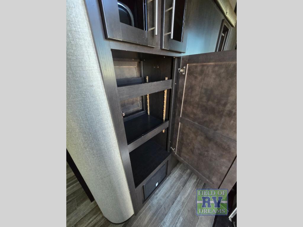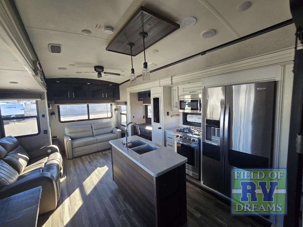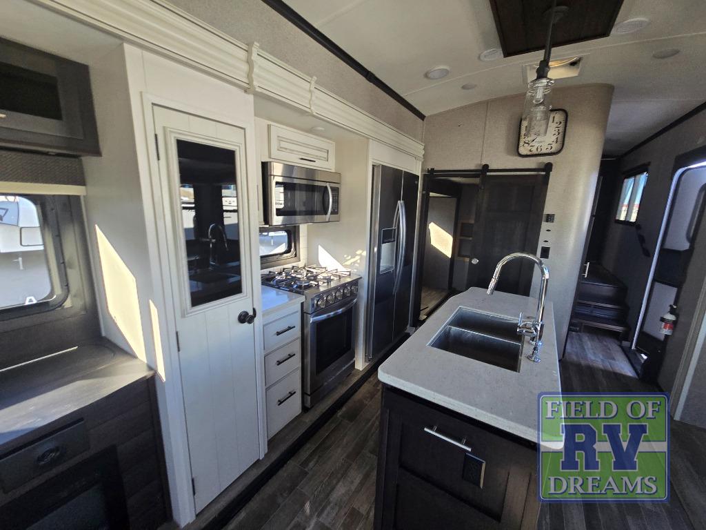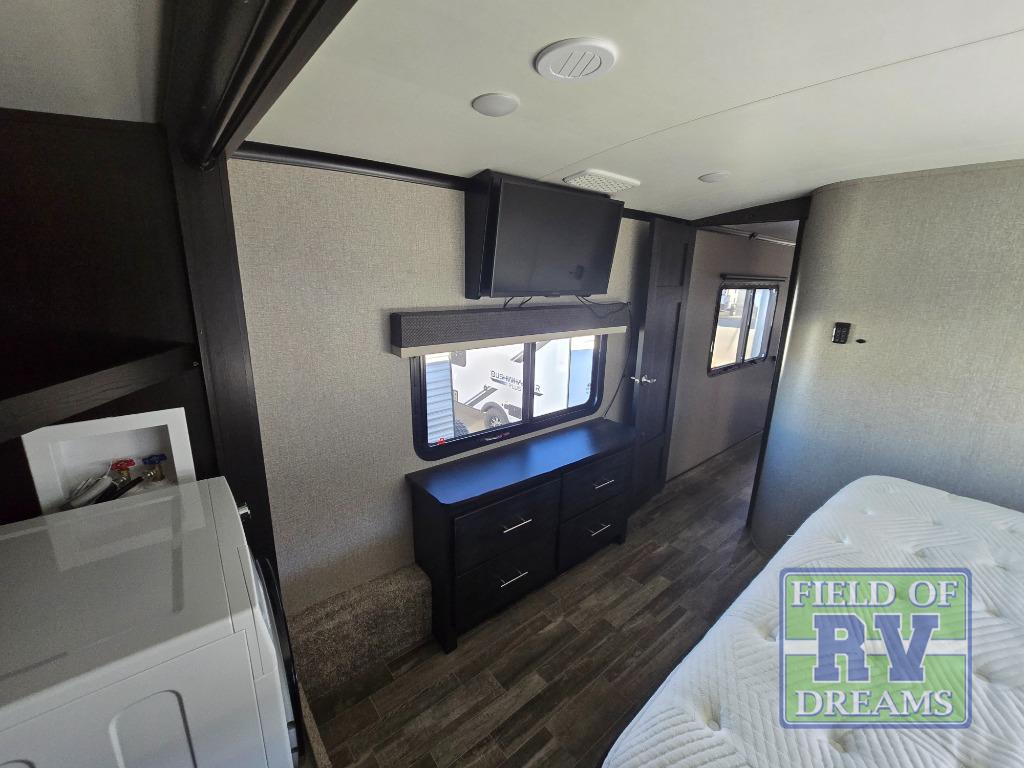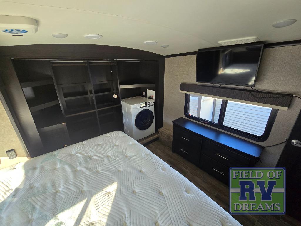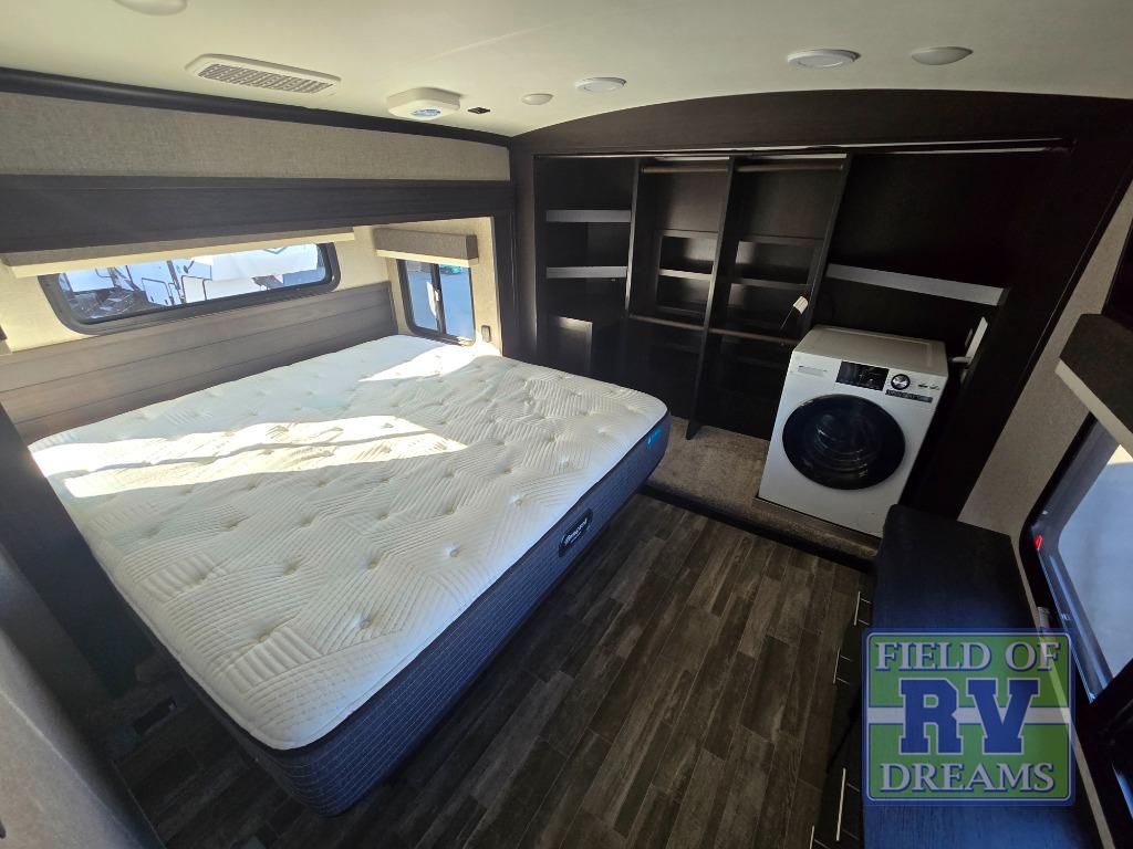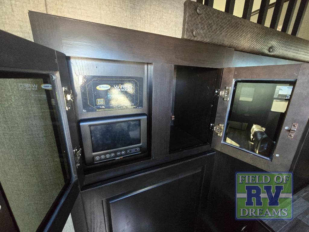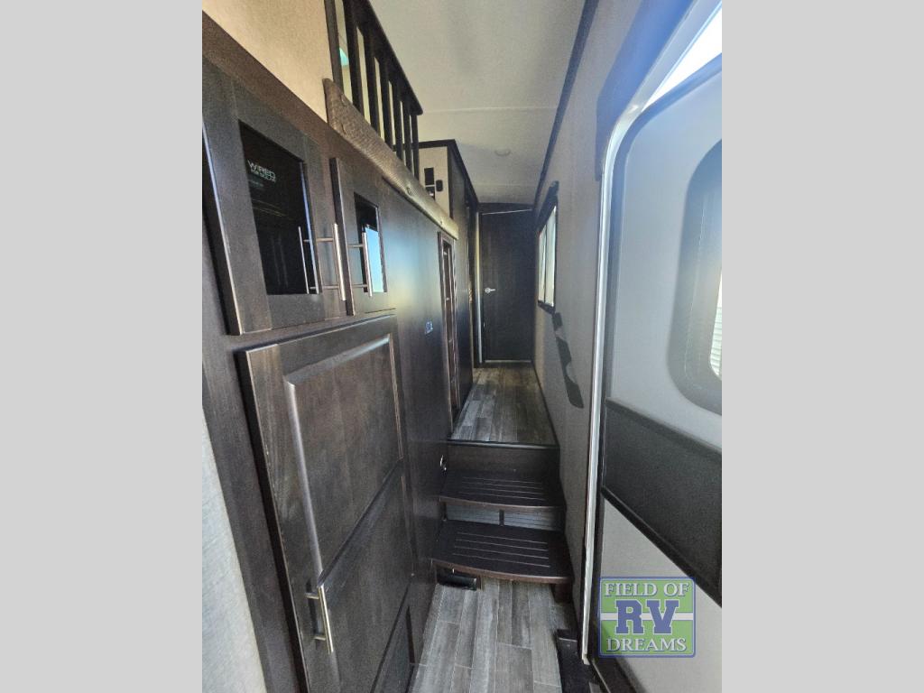 You can bring the whole family with two bedrooms in this fifth wheel! The front private bedroom features a queen bed, a front wall walk-in closet with a hamper and a space prepped to add the optional washer and dryer, and a flip-up dresser with a 32" TV. The second room can be used as a den, an office or a guest room with an overhead loft above a flip-up bunk that has a tri-fold sofa below it, and a desk with a TV. The kitchen is decked out in at-home features like the kitchen island with a double sink and prepped for the optional dishwasher, the large pantry, and a 21 cu. ft. refrigerator to keep your perishables fresh. You can wind down each night by relaxing in the rear living area on either the tri-fold hide-a-bed sofa with flip top side tables to set your drink on or the theater seat which are directly across from the fireplace with a TV on a lift. You can even choose to add the optional tailgate TV next to the outside kitchen with a 17' electric awning with LED lights to keep you protected!