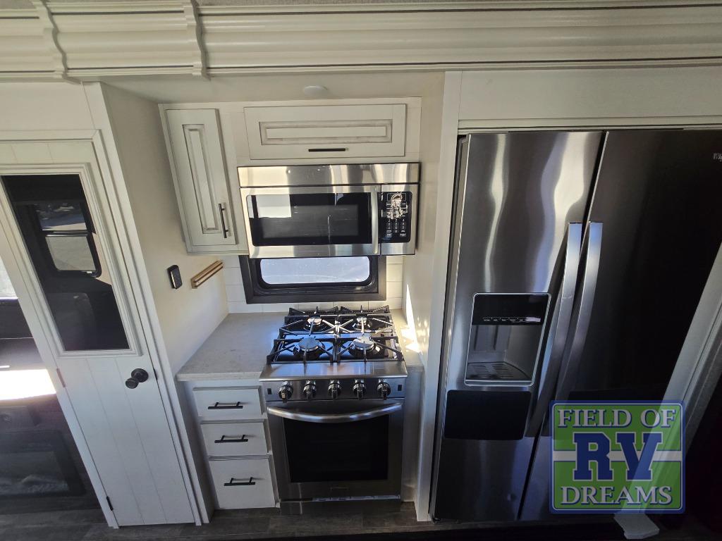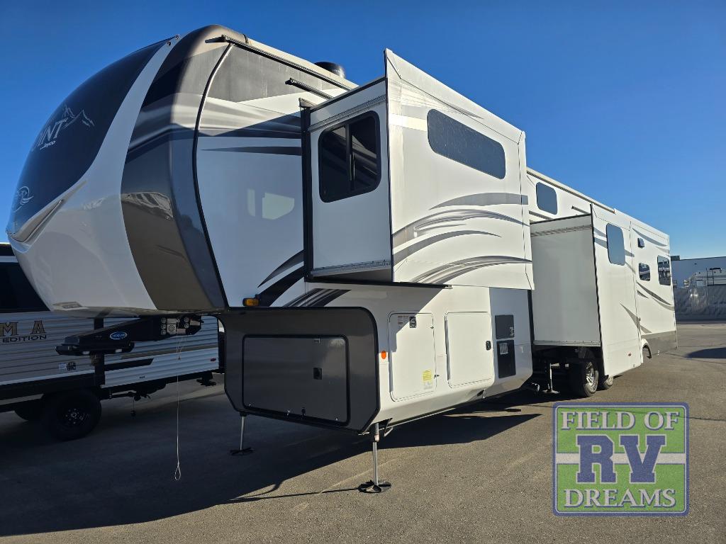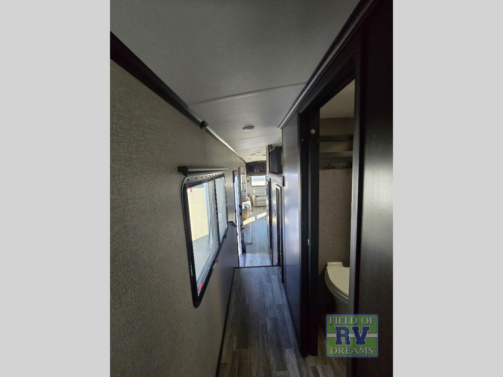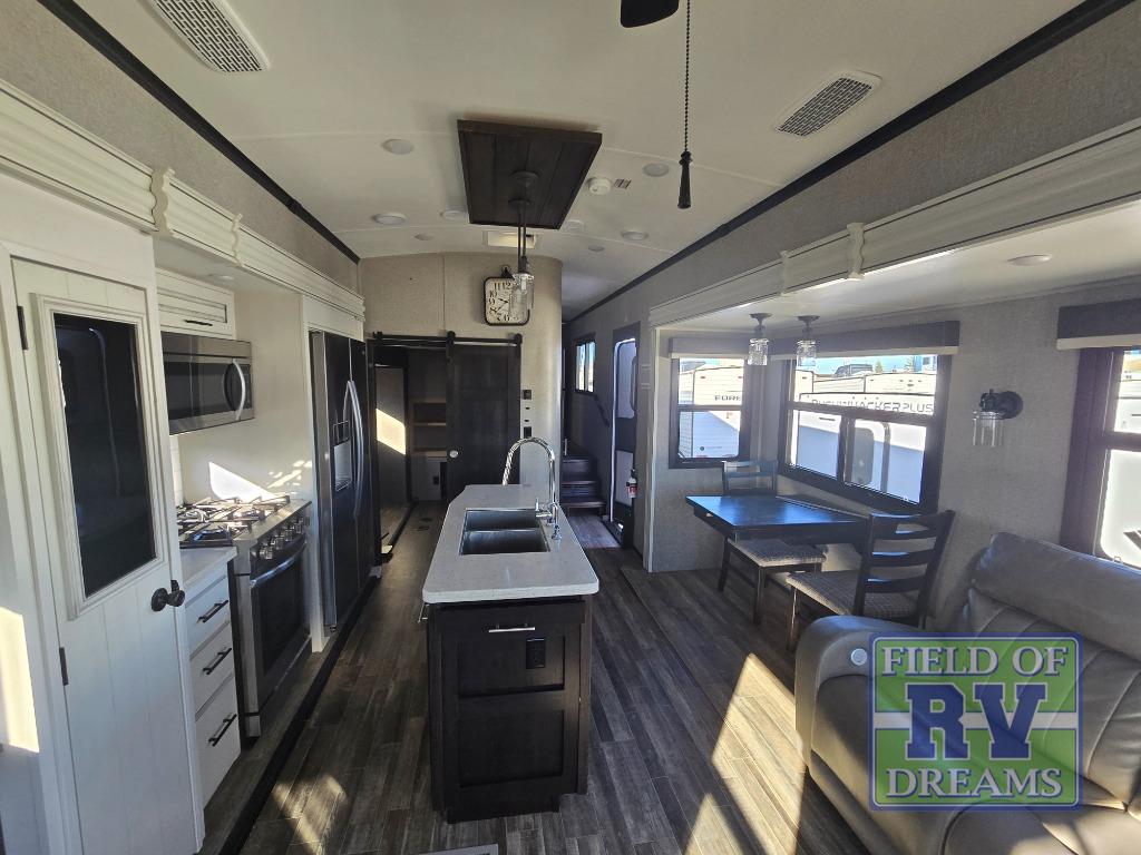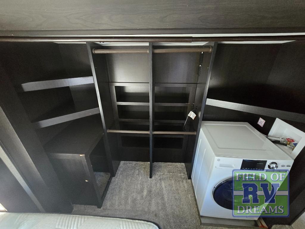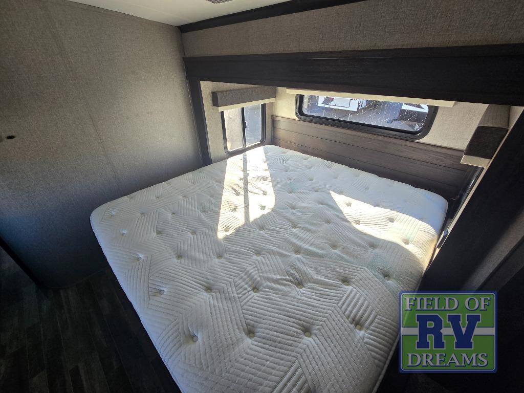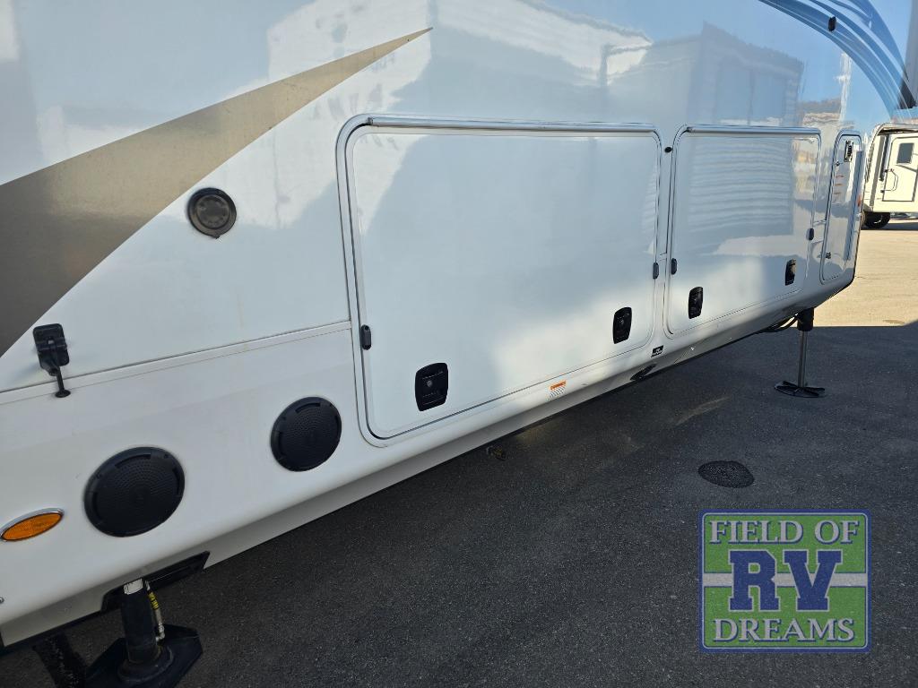 You can bring the whole family with two bedrooms in this fifth wheel! The front private bedroom features a queen bed, a front wall walk-in closet with a hamper and a space prepped to add the optional washer and dryer, and a flip-up dresser with a 32" TV. The second room can be used as a den, an office or a guest room with an overhead loft above a flip-up bunk that has a tri-fold sofa below it, and a desk with a TV. The kitchen is decked out in at-home features like the kitchen island with a double sink and prepped for the optional dishwasher, the large pantry, and a 21 cu. ft. refrigerator to keep your perishables fresh. You can wind down each night by relaxing in the rear living area on either the tri-fold hide-a-bed sofa with flip top side tables to set your drink on or the theater seat which are directly across from the fireplace with a TV on a lift. You can even choose to add the optional tailgate TV next to the outside kitchen with a 17' electric awning with LED lights to keep you protected!