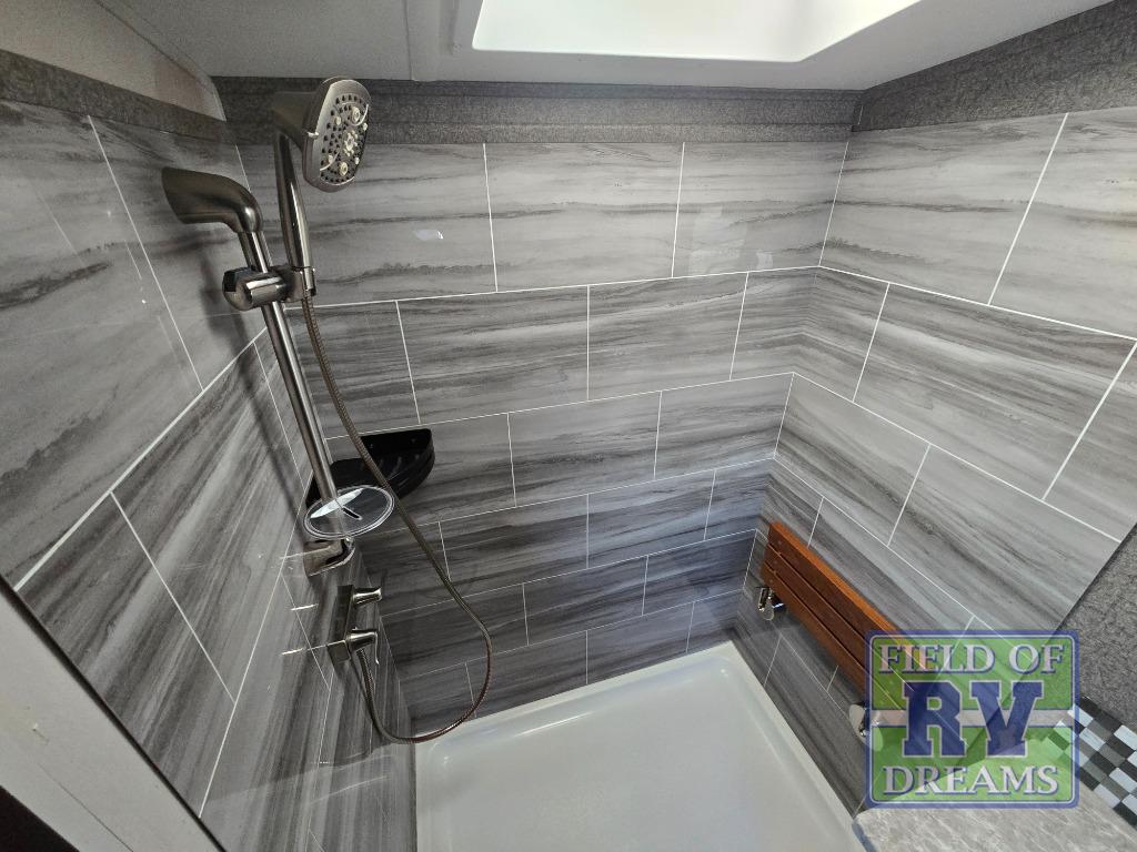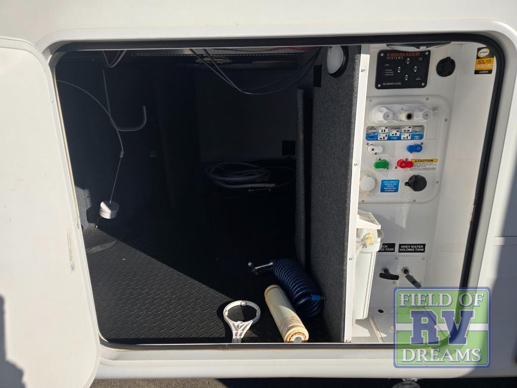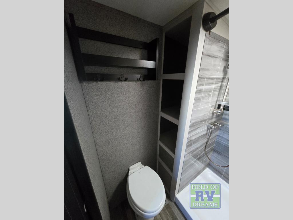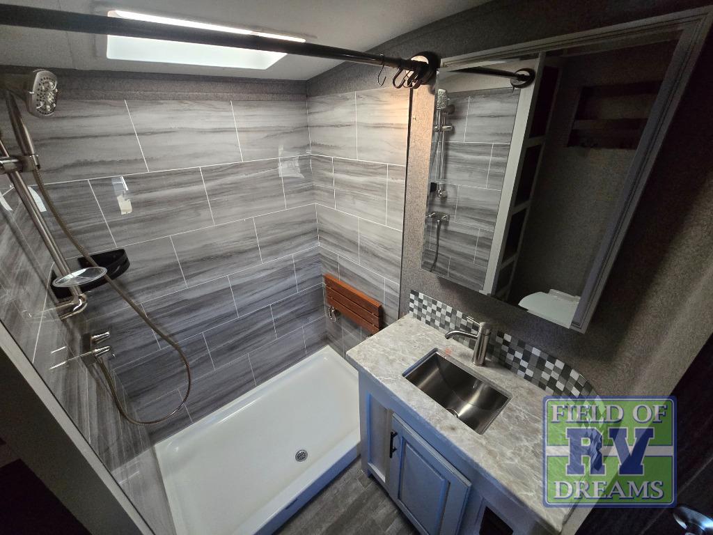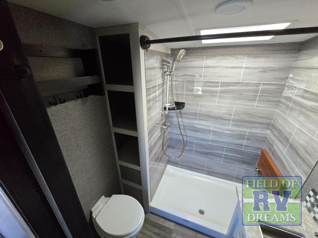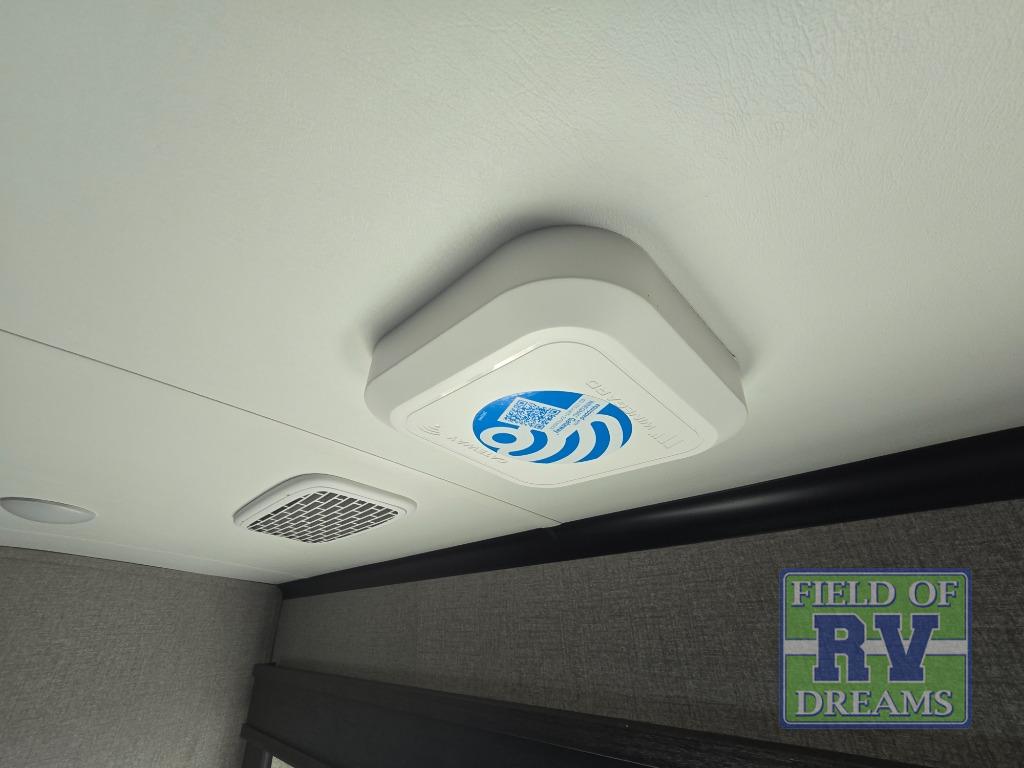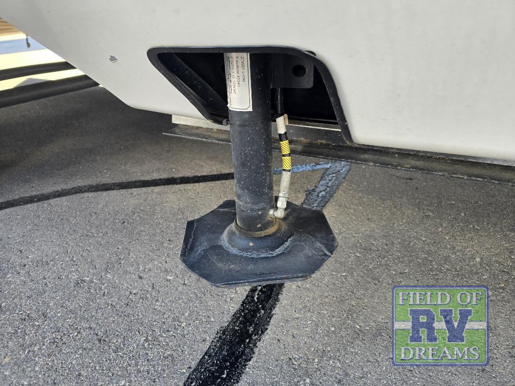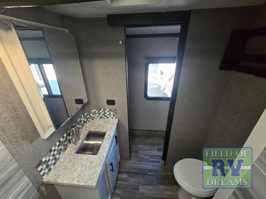 You can bring the whole family with two bedrooms in this fifth wheel! The front private bedroom features a queen bed, a front wall walk-in closet with a hamper and a space prepped to add the optional washer and dryer, and a flip-up dresser with a 32" TV. The second room can be used as a den, an office or a guest room with an overhead loft above a flip-up bunk that has a tri-fold sofa below it, and a desk with a TV. The kitchen is decked out in at-home features like the kitchen island with a double sink and prepped for the optional dishwasher, the large pantry, and a 21 cu. ft. refrigerator to keep your perishables fresh. You can wind down each night by relaxing in the rear living area on either the tri-fold hide-a-bed sofa with flip top side tables to set your drink on or the theater seat which are directly across from the fireplace with a TV on a lift. You can even choose to add the optional tailgate TV next to the outside kitchen with a 17' electric awning with LED lights to keep you protected!