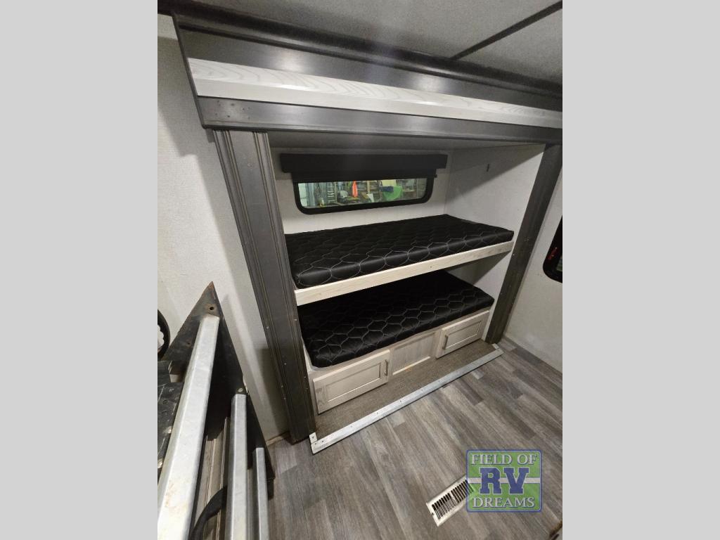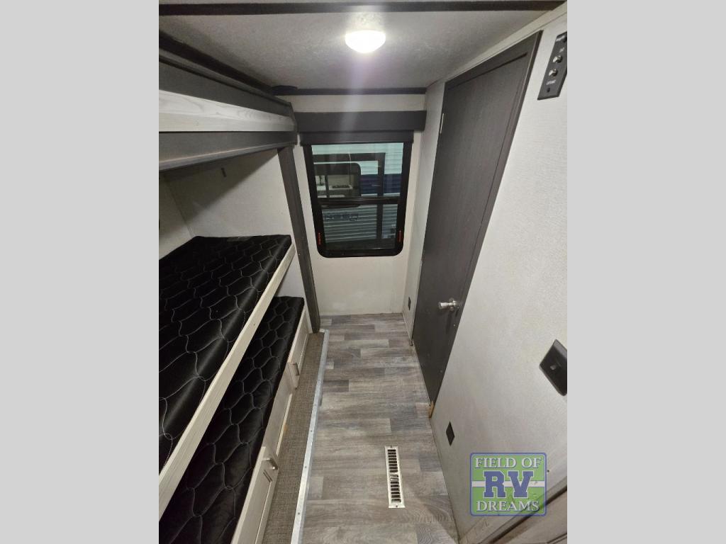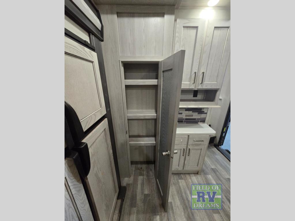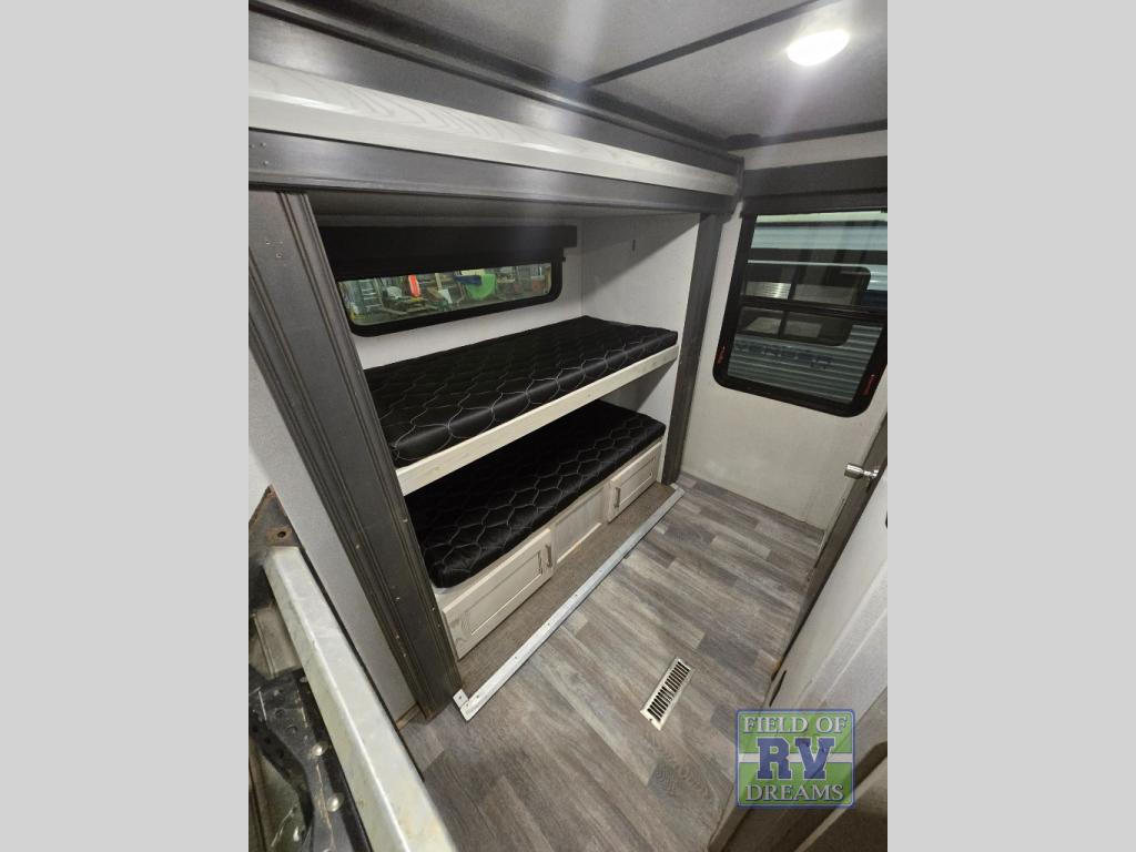 This unique layout allows you to enter into the front living area or straight into the rear private bunkhouse thanks to having two exterior entry/exit doors. The kids will have their own entry as well as bunk beds within a slide out, a half bath, and a wardrobe. There is a loft area above the bunkhouse that includes three bunk mats for more sleeping space. While the kids are playing, the adults can prepare dinner using the range with glass top, enjoy a cold drink together, and relax on the power theater seating. This kitchen is made complete with a center island, a coffee station, a pantry. Mom and dad will enjoy some privacy in the front master suite that includes a queen bed, access into the dual entry bath, and plenty of dresser and closet space for all their clothes.