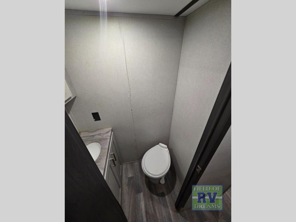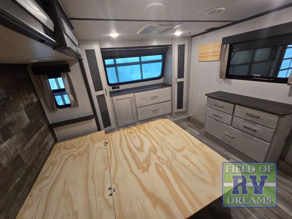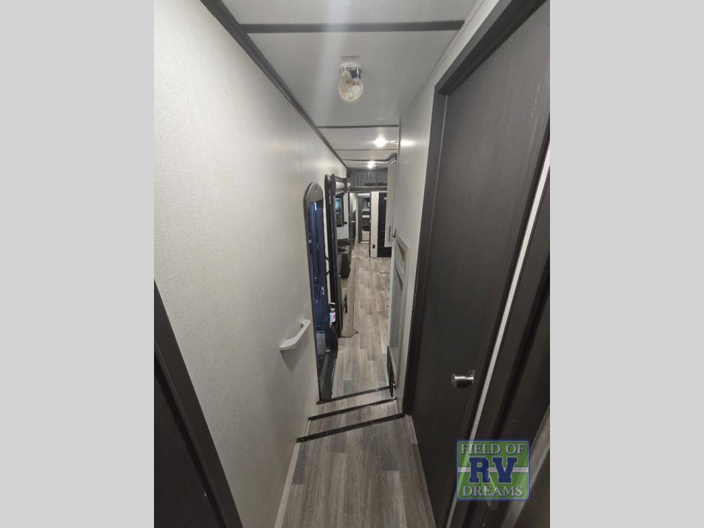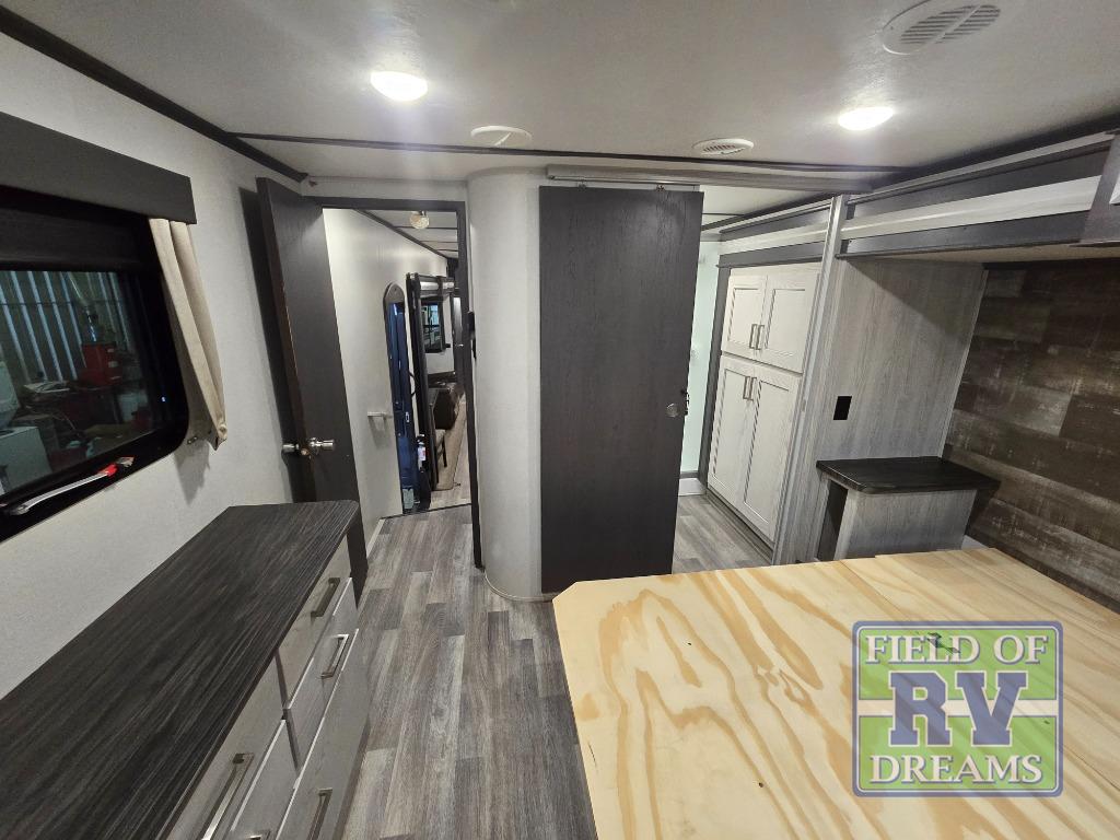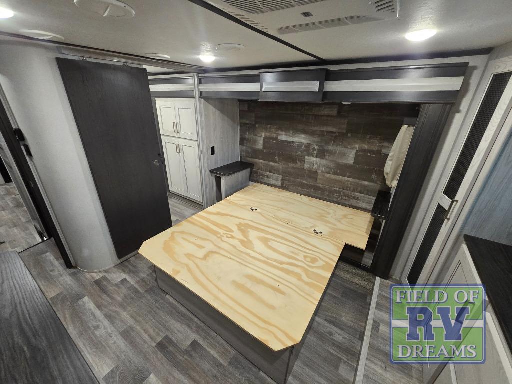 This unique layout allows you to enter into the front living area or straight into the rear private bunkhouse thanks to having two exterior entry/exit doors. The kids will have their own entry as well as bunk beds within a slide out, a half bath, and a wardrobe. There is a loft area above the bunkhouse that includes three bunk mats for more sleeping space. While the kids are playing, the adults can prepare dinner using the range with glass top, enjoy a cold drink together, and relax on the power theater seating. This kitchen is made complete with a center island, a coffee station, a pantry. Mom and dad will enjoy some privacy in the front master suite that includes a queen bed, access into the dual entry bath, and plenty of dresser and closet space for all their clothes.