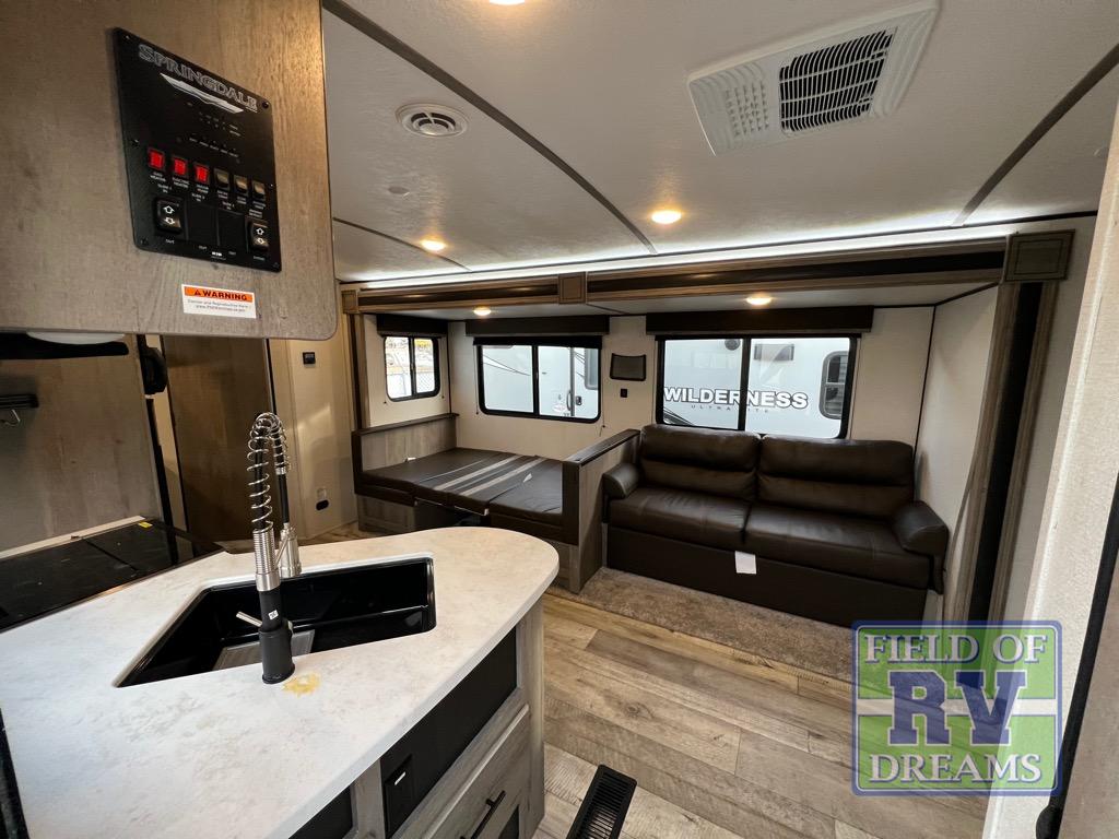 It will be so easy to host parties with this Springdale travel trailer because the outdoor kitchen and 21' power awning will provide an exceptional space to enjoy the outdoors while visiting with other RVers and cooking! This trailer is even better on the inside! The entertainment center and fireplace will draw you and your friends in to sit back on the sofa and booth dinette which are both situated on the large slide. You might even like to add the optional TV. The single slide provides more interior walking space even when gathered together, and the two full pantries keep the snacks ready and available so that you can grab the party bowls when they're running low. You can even turn those party guests into overnight guests by offering them a night of rest on the double-size bunks or furniture.