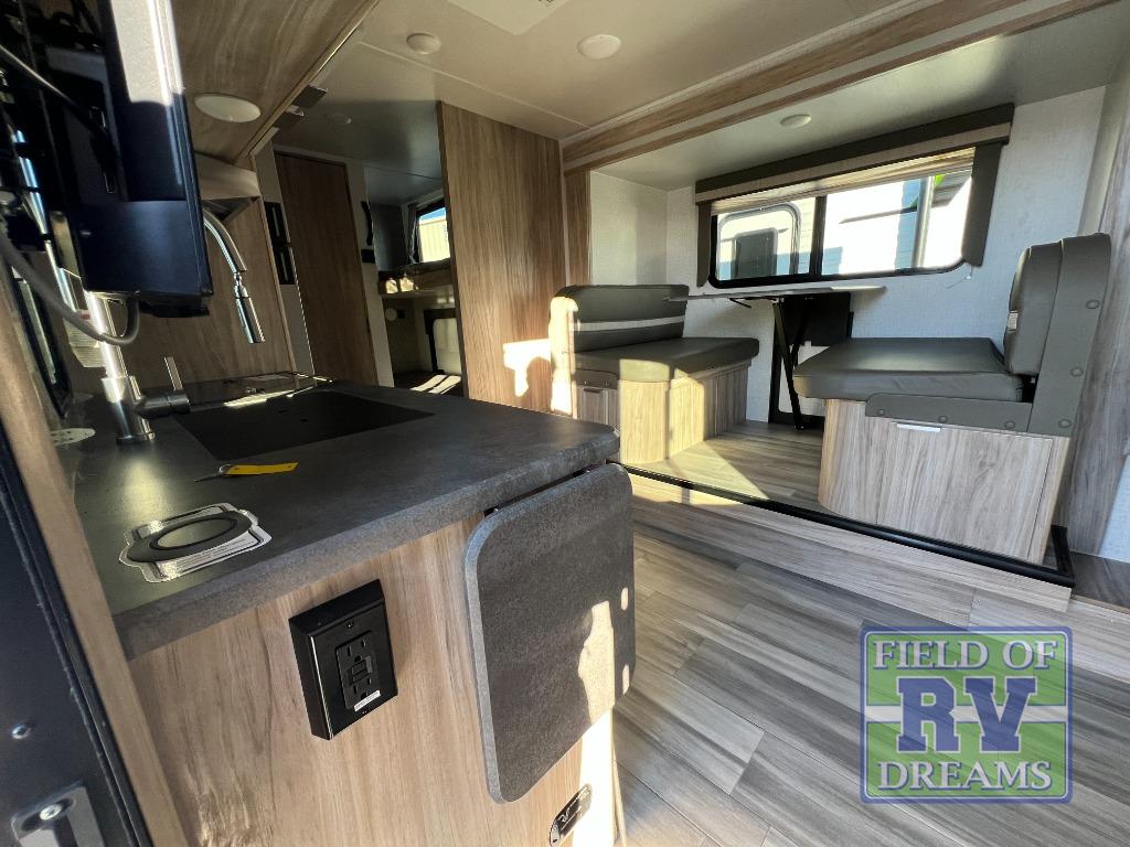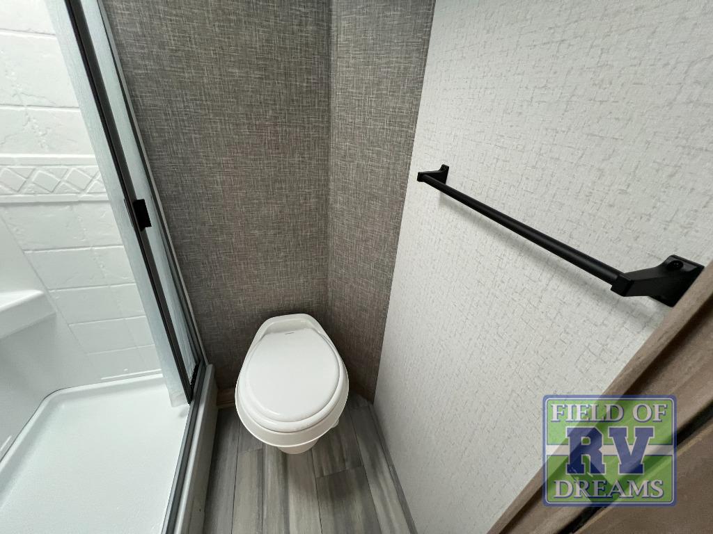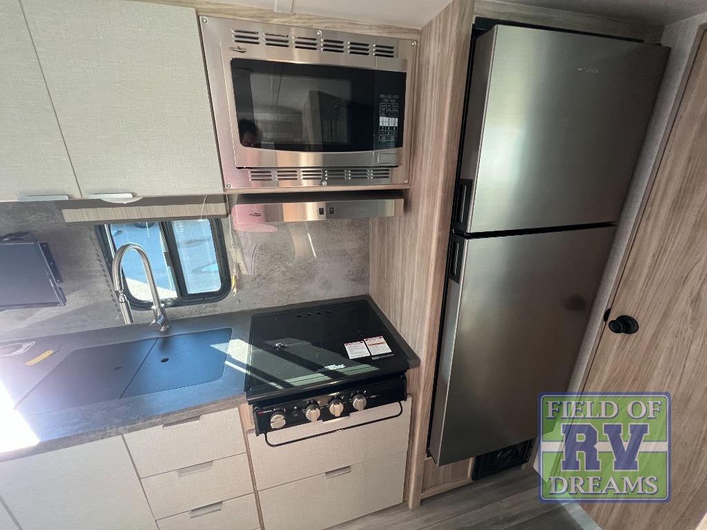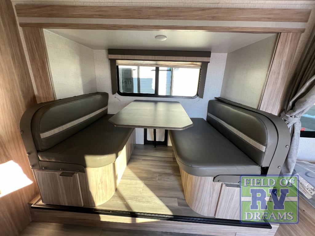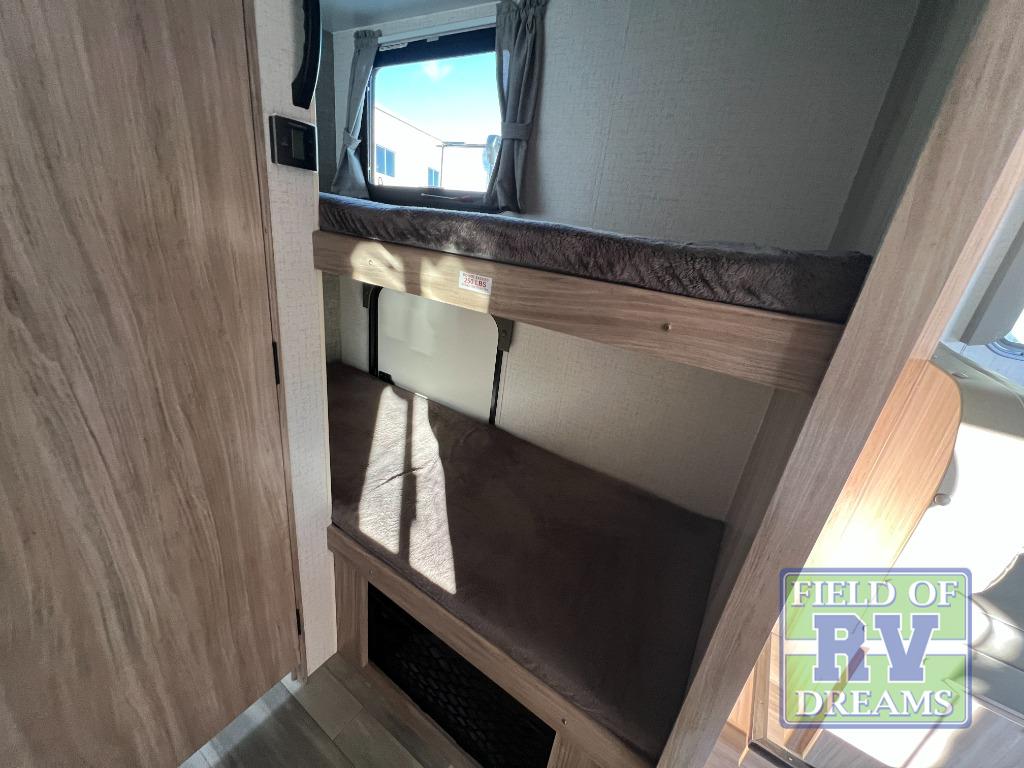 Get ready for a fun family weekend in the great outdoors with this trailer only steps away to enjoy inside comforts! The cook will love having everything to make warm meals and store leftovers in the double door refrigerator, plus the flip-up counter gives them more space to prep or dry the dishes. The front 54" x 74" full bed has a divider curtain for privacy at night and the rear corner 28" x 72" bunk beds are conveniently next to the private toilet and shower room. There is even a skylight above the shower for added natural lighting as you get ready each morning. The booth dinette slide gives you a place to dine as well as sleep one more person, plus you will love the extra floor space that it provides. You might like to choose the sofa and table option in its place, the option is yours!