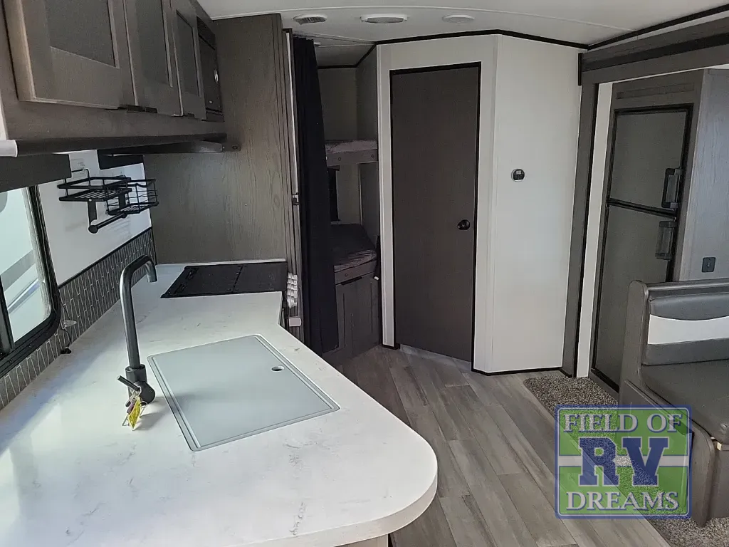 Get the whole crew together for trips in this single slide out travel trailer! The little ones will love the double-size bunks, and you'll have your own private bedroom up front. If you have any other guests, they can sleep on the U-shaped dinette when it's not being used for meal times or game night. The chef can cook indoors on the three burner cooktop, or outdoors on the outside kitchen. There is also a 19' power awning with LED lights here to keep them in the shade. Storage space in this model is found in the overhead compartments, the dual bedroom wardrobes, and the exterior full belly storage system!