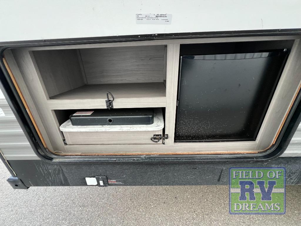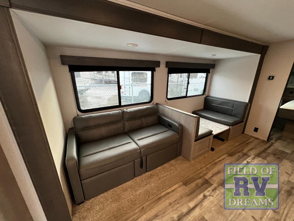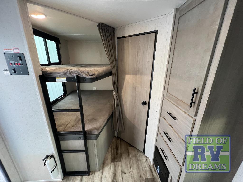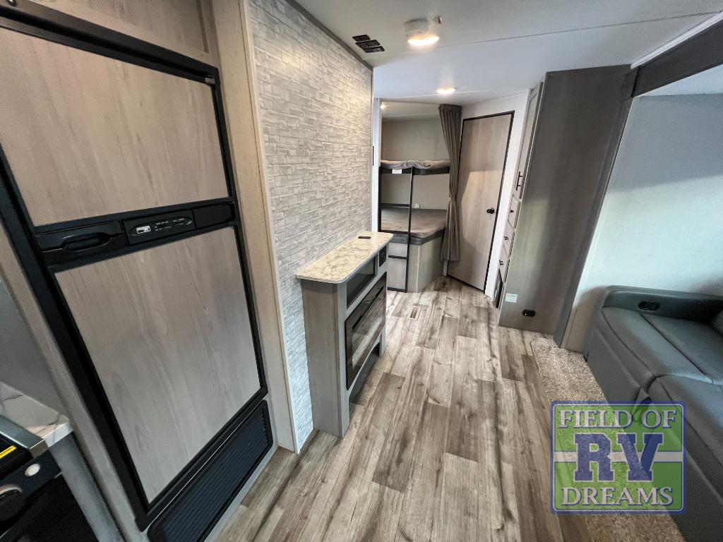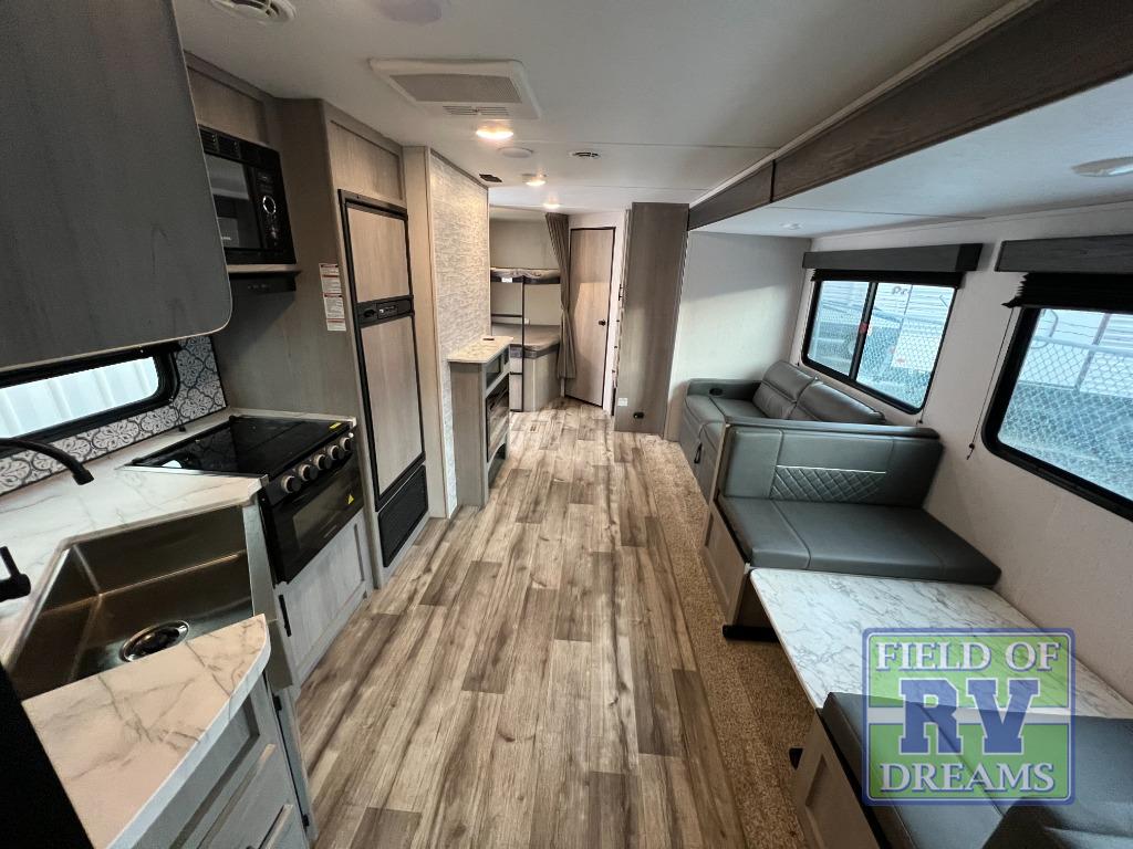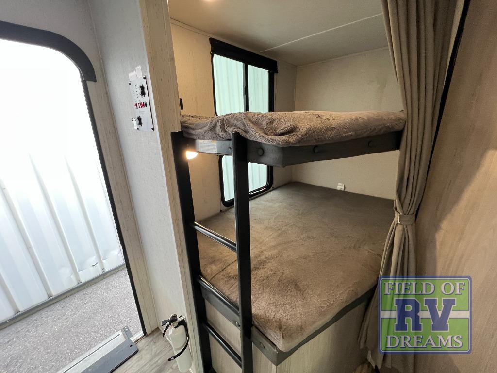 Looking for adventure and new scenery and want conveniences of home in a trailer for when you are ready to relax? Well this trailer allows you to make meals indoors with the kitchen appliances and outdoors on the outside kitchen, to relax on your own reclining sofa or at the booth dinette, and to get clean up in your own full bathroom. And the dual entry doors allow you access to the main area and the double-size bunk beds as well as the front bedroom. The cook will enjoy having a farm style sink with high rise faucet, and an L-shaped counter top to prepare and serve meals as well as a 7 cu. ft. refrigerator to store leftovers. And when you all are ready for bed, four can claim the double-size bunks, two can enjoy privacy in the bedroom on a queen bed, and some will enjoy staying in the main area to sleep on the furniture. There are many more features to enjoy such as the power tongue jack when setting up, the outside shower when your shoes are too dirty to bring inside, and the USB ports when you cellphone battery is low.