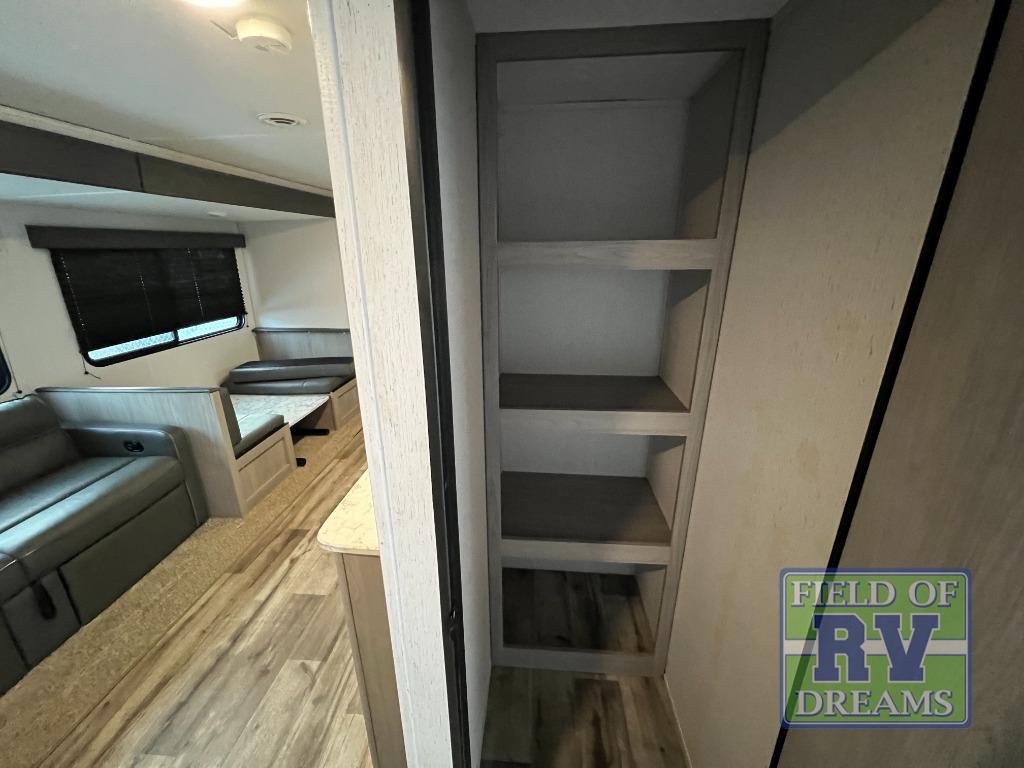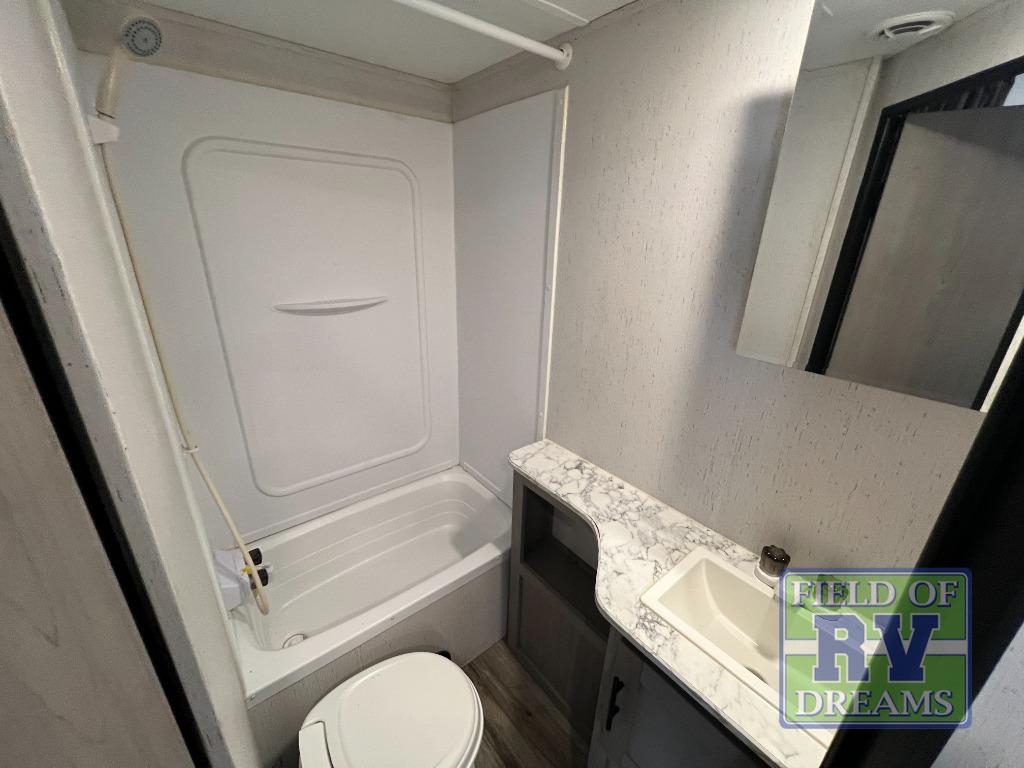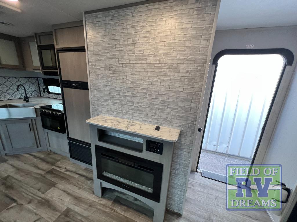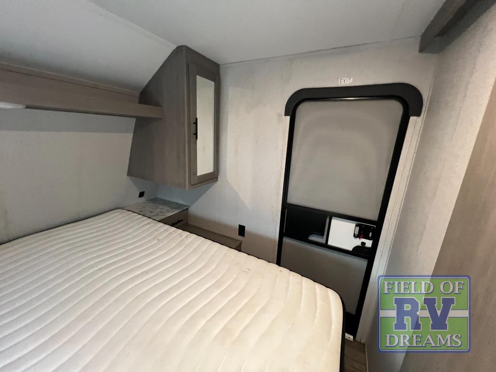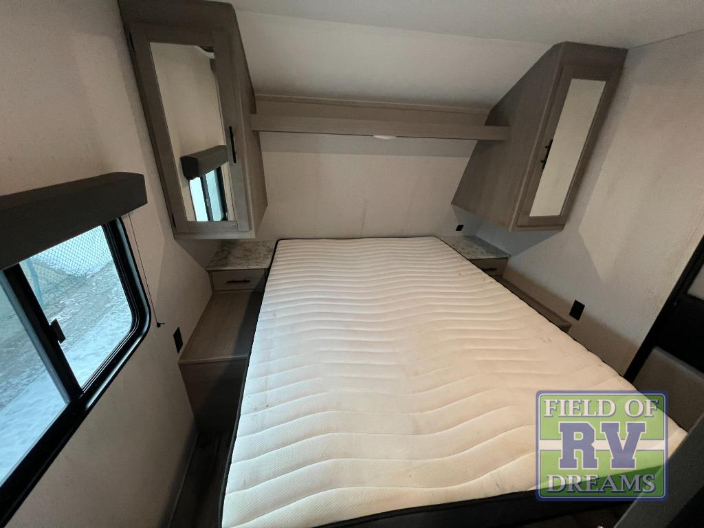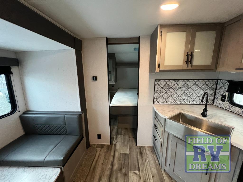 Looking for adventure and new scenery and want conveniences of home in a trailer for when you are ready to relax? Well this trailer allows you to make meals indoors with the kitchen appliances and outdoors on the outside kitchen, to relax on your own reclining sofa or at the booth dinette, and to get clean up in your own full bathroom. And the dual entry doors allow you access to the main area and the double-size bunk beds as well as the front bedroom. The cook will enjoy having a farm style sink with high rise faucet, and an L-shaped counter top to prepare and serve meals as well as a 7 cu. ft. refrigerator to store leftovers. And when you all are ready for bed, four can claim the double-size bunks, two can enjoy privacy in the bedroom on a queen bed, and some will enjoy staying in the main area to sleep on the furniture. There are many more features to enjoy such as the power tongue jack when setting up, the outside shower when your shoes are too dirty to bring inside, and the USB ports when you cellphone battery is low.