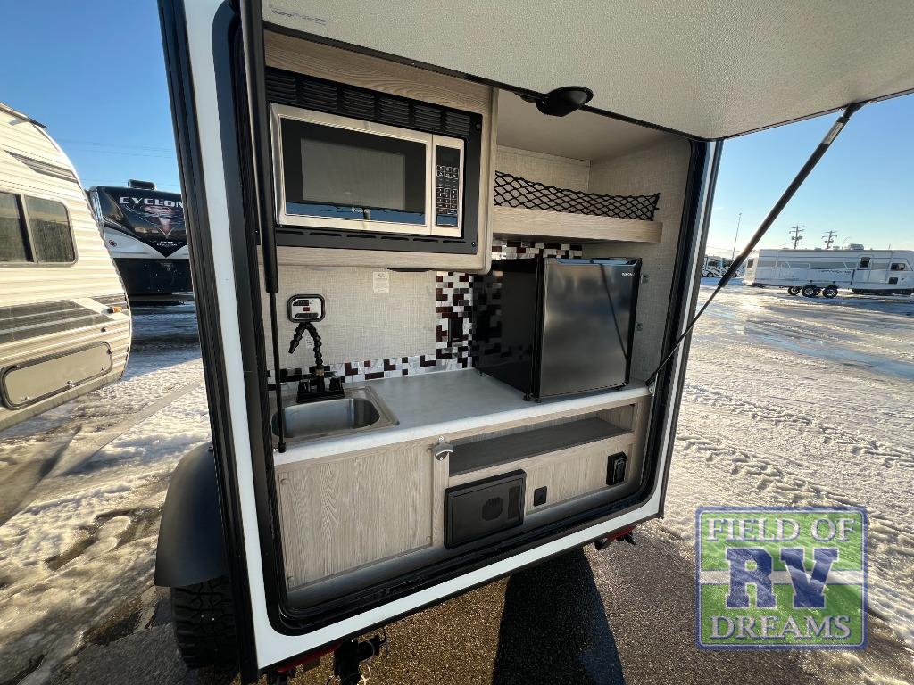 All of your needs will be met with this small, basic travel trailer that can be towed by a small vehicle! You will start each morning feeling rested and ready to go after sleeping on the 54" x 74" bed. Breathe in some fresh air and take in your beautiful scenery while you cook at the outside griddle, and store any leftovers inside the electric refrigerator. When you're ready to wind down your nights, pop a bag of popcorn into the microwave and watch your favorite movie on the 12V TV with the DVD player. Or you may just want to add the optional 7' awning for evenings outdoors!