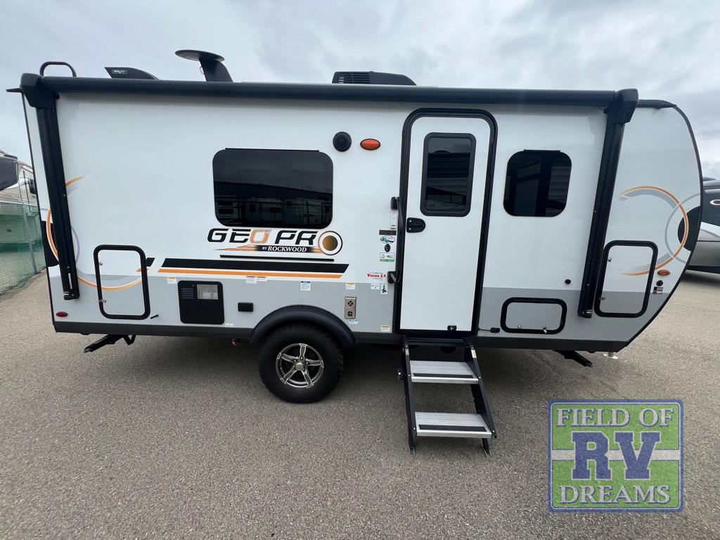 The Rockwood GEO Pro travel trailers and toy hauler by Forest River are ready for all your adventures. The interior and exterior Azdel construction, along with the vacuum laminated roof and walls provide a durable trailer, and the Dexter torsion axles with aluminum wheels make towing easier than ever. There are many convenient amenities, like the 13,500 BTU A/C, the Bluetooth system control panel, and the all-in-one Teton HD TV/WiFi/FM antenna with LTE prep. Each model includes frameless windows, fabric valances and roller shades, and a modern interior that will make you feel right at home. Everything you're looking for in your next RV is in a Rockwood GEO pro by Forest River!