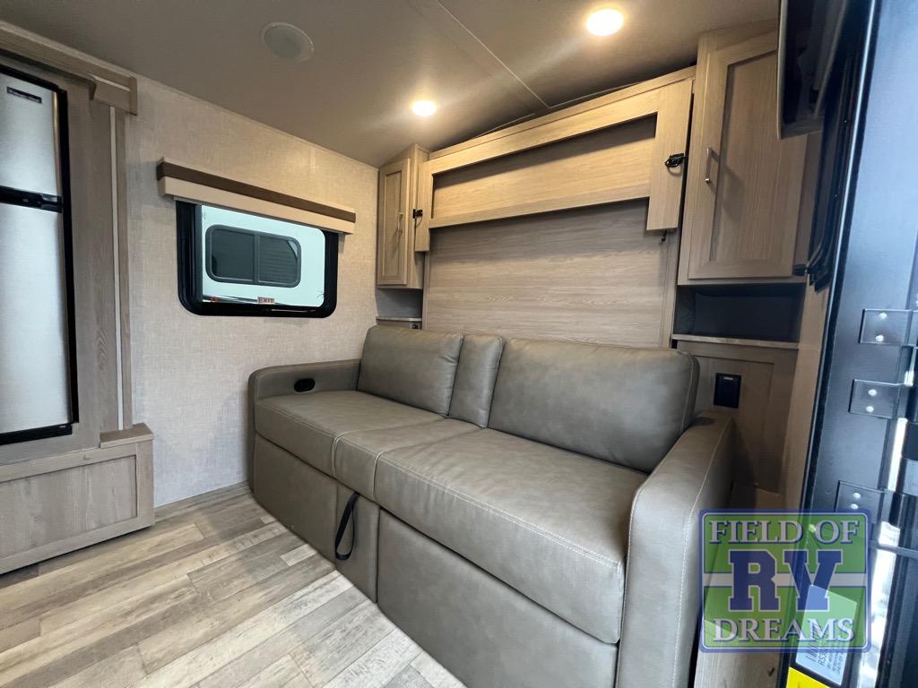 Comfortable sleeping space, convenient seating space, and a full rear bath makes this couple's trailer the one! You will love being able to relax on the sofa during the day, and sleep on the Murphy bed at night. There is a single slide out that will provide you more space to move around or cook meals, and the full bath includes a large shower so you won't feel cramped. If it's a rainy day you can watch movies on the 12V TV, and if it's nice out, sit under the 14' power awning and cook lunch on the outside griddle. The possibilities are endless with this couple's trailer!