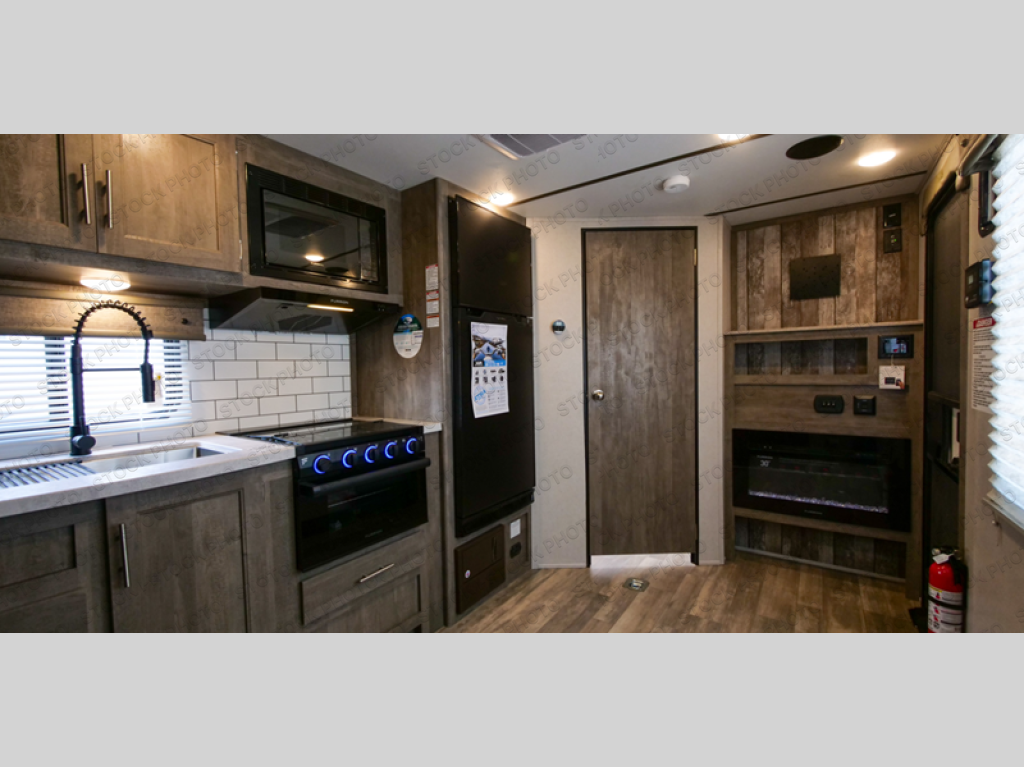 With 14' 6" total garage space, you can bring along your favorite ride-on toys for trail riding fun! Once the bikes are unloaded, set up the patio deck and relax with a cold drink. You'll also find Sit N Sleep sofas below the Sleep N Store manual bed system for more seating and sleeping space. Since this model doesn't include chairs in the main living area, you'll have more space to cook in the full kitchen, and easily head to the walk-through bath to freshen up. An RV queen bed will provide a great night's rest, and you'll find plenty of storage space for your belongings. This model also includes a 5,000 BTU fireplace, making it feel a little more like home!