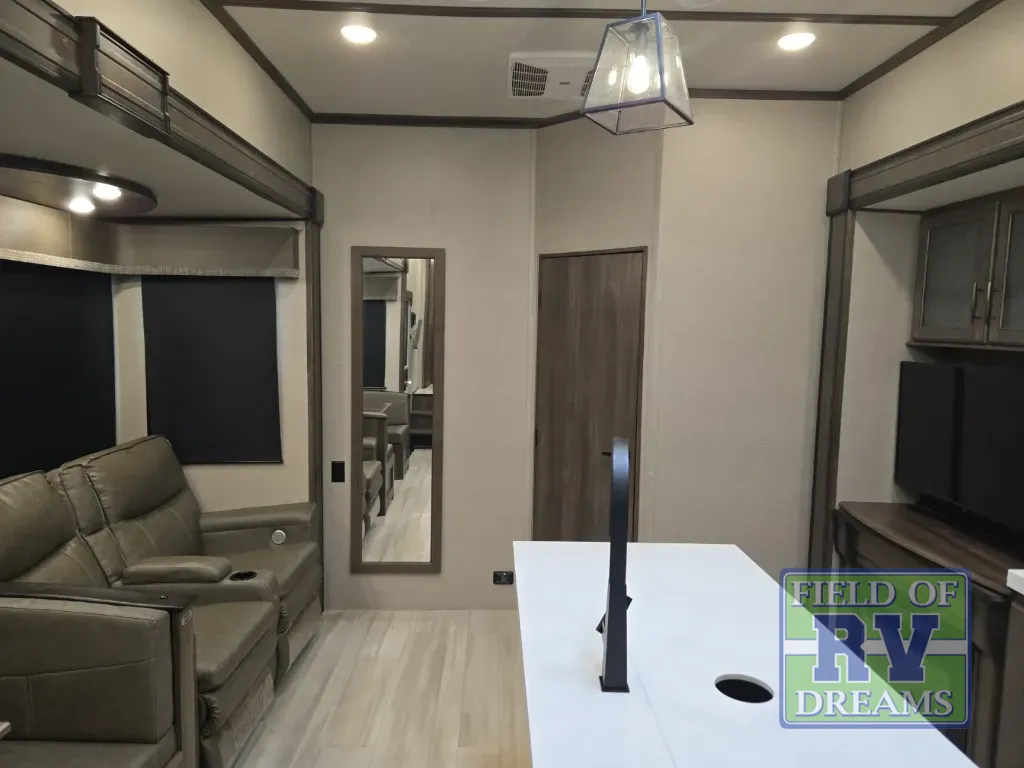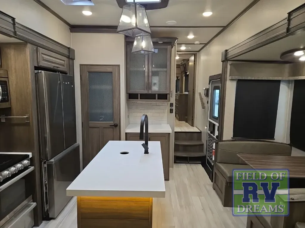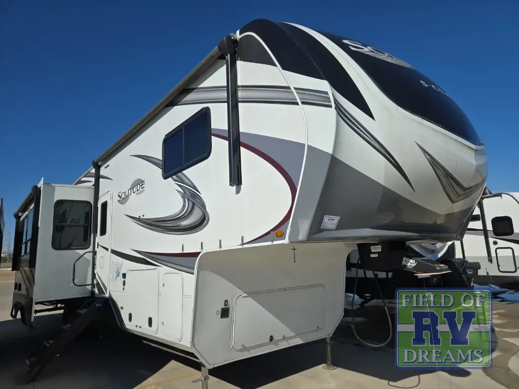 With any Solitude S-Class fifth wheel by Grand Design you will appreciate the Max Built Construction Package that features a 101" wide-body, gel coat exterior sidewalls, heavy-duty 7,000 lb. axles, plus many more durable construction materials. The self-adjusting brakes and the MORryde CRE3000 suspension system will provide a smooth towing experience, and each model includes heavy duty 17.5" H-rated tires with NitroFill. Some of the features you are sure to love are included in the Residential Living Package, like the solid surface countertops and sink covers, the hardwood cabinet doors, the night stands with USB ports, and the Rockford Fosgate stereo entertainment system with HDMI and App controls. These fifth wheels are extended-stay approved thanks to the Weather-Tek Package with a 35,000 BTU high-capacity furnace, the Stealth A/C system, and many high-end residential finishes to make you feel like you taken home with you!