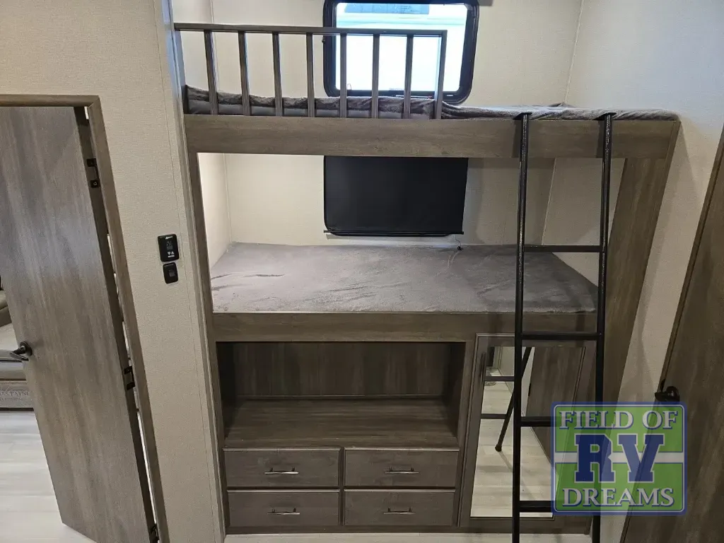 One look at this spacious fifth wheel and you'll be hooked! There are two full baths; one up front by the private bedroom, and one in the private bunkhouse. The rear bath also features a unique rear entry door for convenience. The chef of your group will love the outdoor kitchen that includes a beverage cooler, a sink, and an outdoor griddle for hot dogs and burgers. If the weather is raining on your parade, take the conversations inside to relax on the theatre seating or play a game at the free-standing dinette. There is also an LED TV here and a fireplace. This model includes plenty of storage space, including a large bedroom closet, a pantry in the kitchen, plus an exterior pass-through storage for larger camp gear!