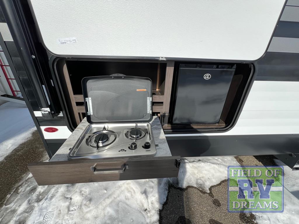 Head to the lake for unforgettable camping trips in this dual-entry travel trailer. The private bunkhouse suite includes four bunks, two drawers to store belongings, plus a half bath for convenience. Everyone will love to gather in the main living area that includes a tri-fold sofa or optional theatre seating, a booth dinette, plus a 32" LED HDTV on a swing arm for a perfect view. You'll find plenty of storage space, including a wardrobe/pantry, a broom closet, plus plenty of overhead compartments for your valuables. This model also includes a full indoor kitchen, as well as an outdoor kitchen with a two-burner cooktop, an exterior spray port, plus a 1.6-cu. ft. refrigerator for cold drinks.