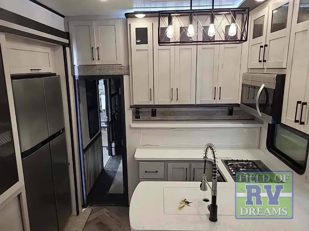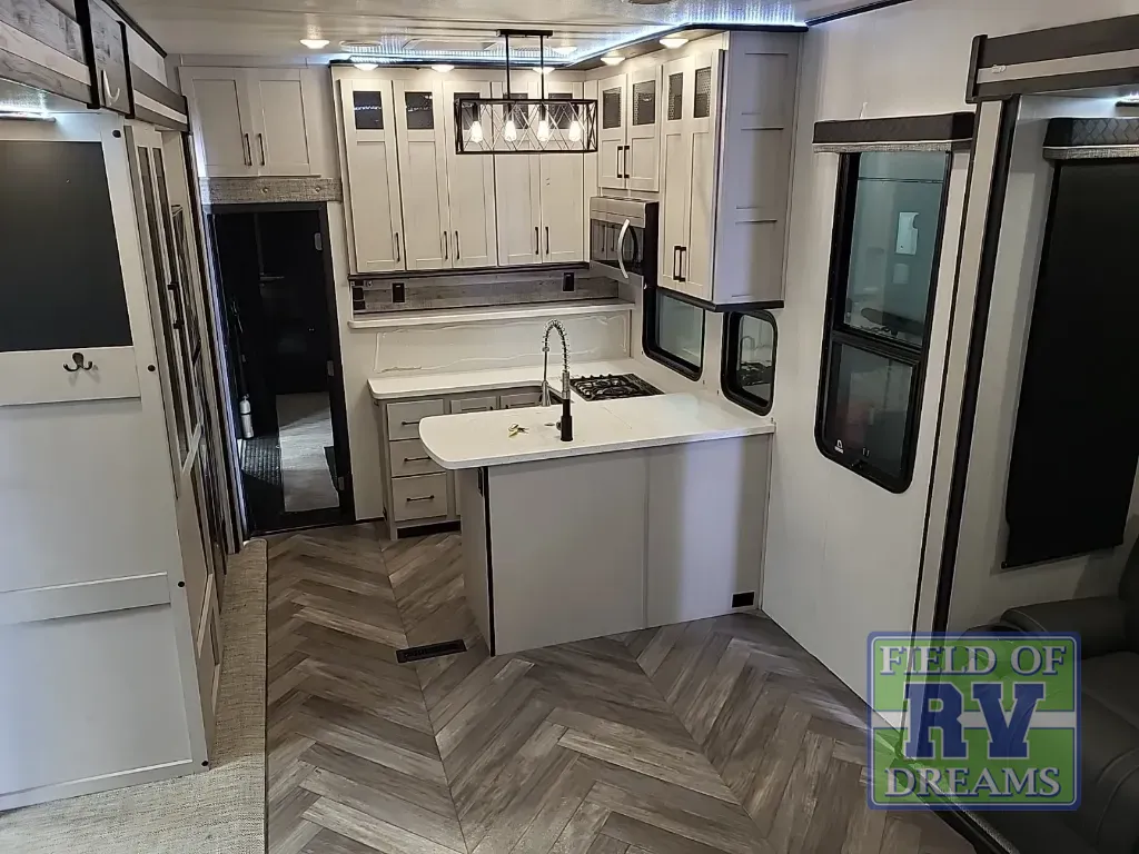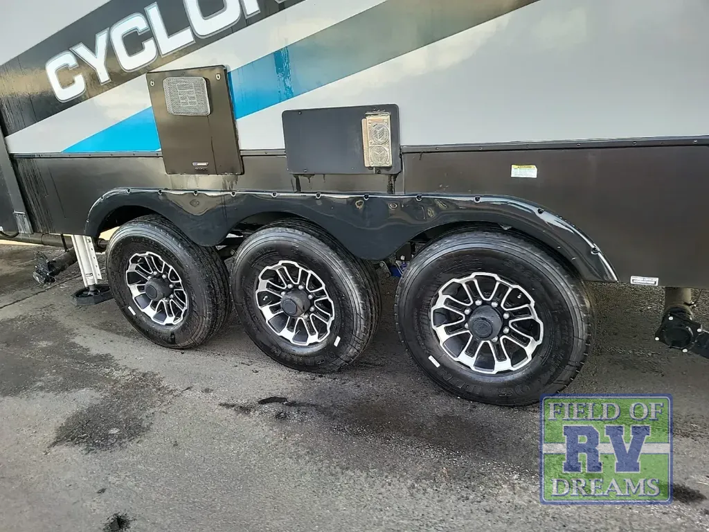 Satisfy your wanderlust with a Heartland Cyclone fifth wheel toy hauler! You won't have to sacrifice any luxury either with indulgent features like the king bedroom suite with a "swift space" work station that pulls out from the dresser, a Stor-Mor three-sided access to the basement with 30% more storage capacity, and Step Caddy folding patio step for better stability as you enter or exit the patio. The industry first Grill and Go 25" residential pull out 3 burner griddle combo comes on models with an exterior kitchen for an easier cooking experience. Full height shaker cabinetry provides 25% more storage space so you can bring more camping necessities with you. If you like to dry camp longer then you will appreciate the industry's largest 150 gallons fresh water tanks. Come find the perfect model for you today!