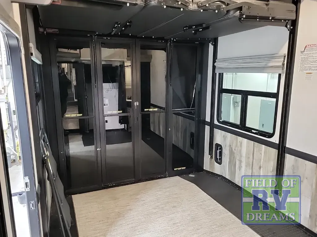 Everyone will have a comfortable place to sit in this toy hauler with the dual opposing theater seating slides and the third theater seating across from the 50" LCD HDTV! The 3,000 lb. weather resistant 8' ramp door makes it easy to load your toys into the 13' garage and then unload them once you have arrived and set up the electric queen bed above the split bench seating, the loft, the half bathroom, and there is even an area prepped to add an optional washer and dryer. There is plenty of countertop space in the U-shaped kitchen to prepare your best home cooked meals, and you even have an outside refrigerator to enjoy a cold beverage underneath the two awnings!
