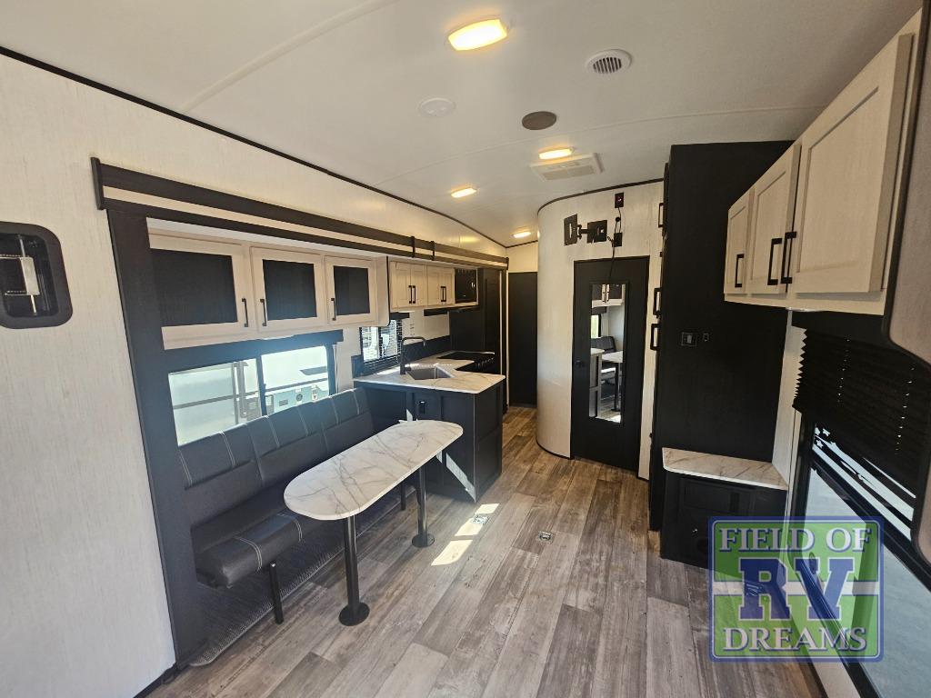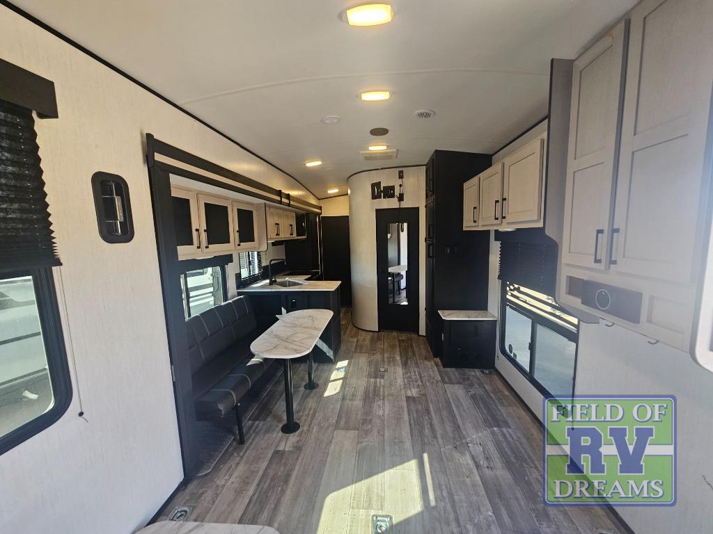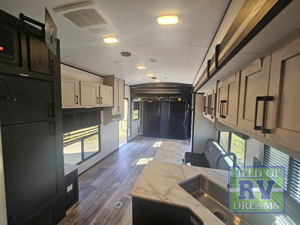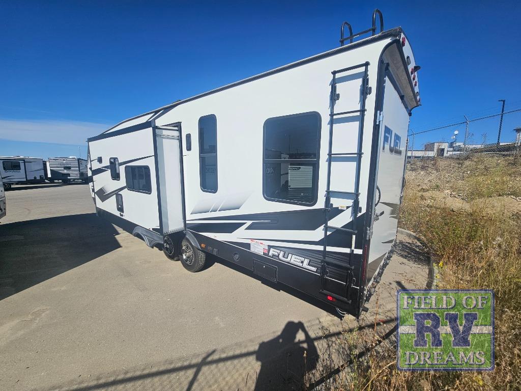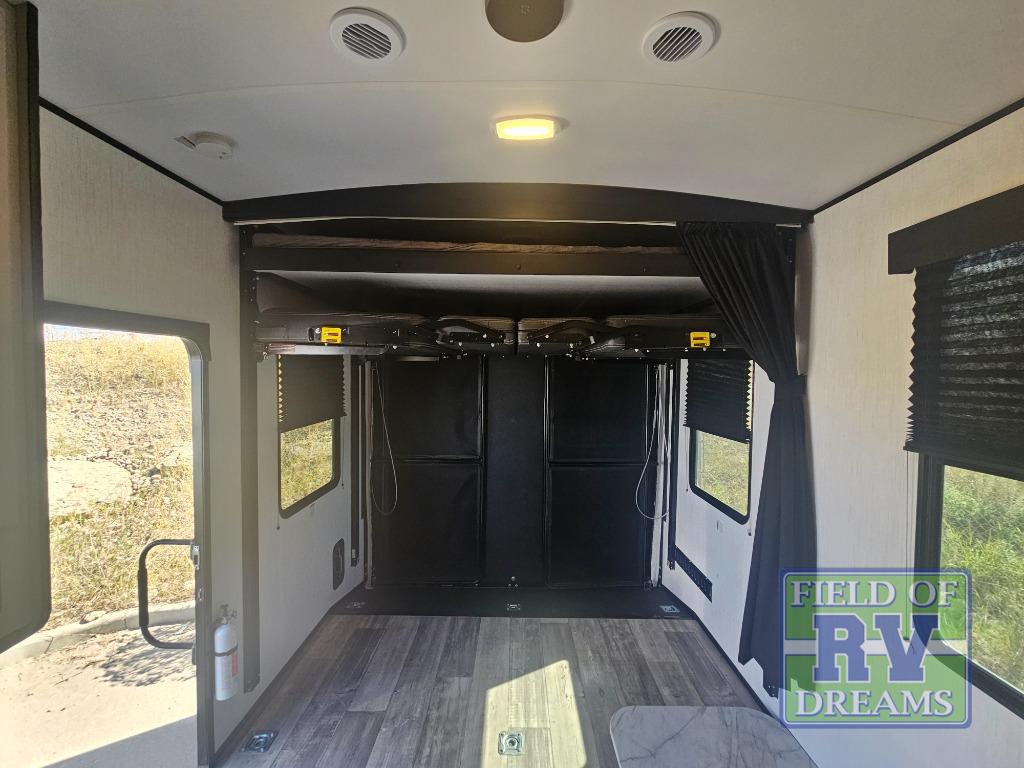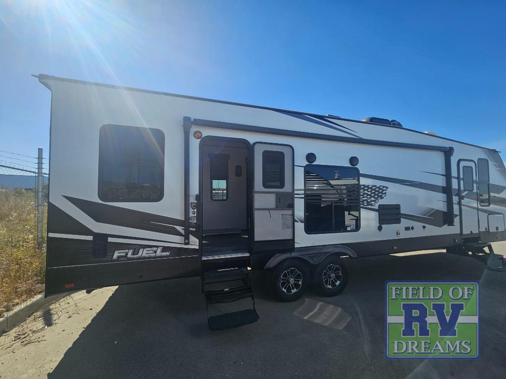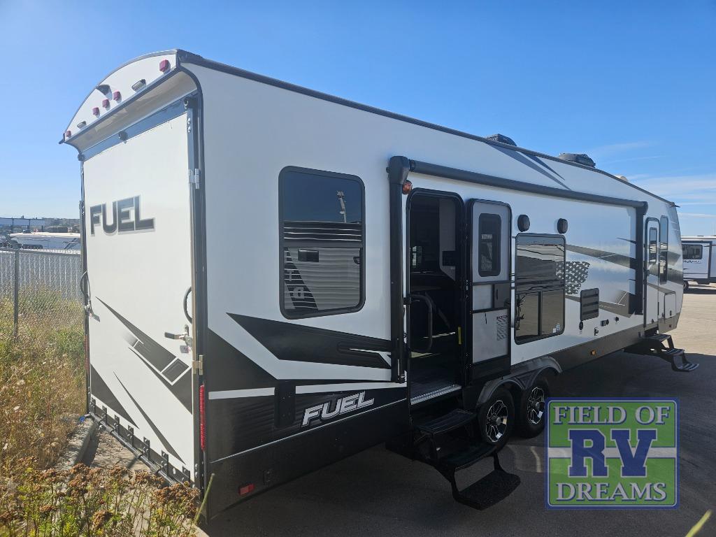 This 35' 11" Fuel toy hauler has lots of space and lots of convenience, so you'll never be at a loss when you're out having fun! You can enter and exit this unit easily because of the two entry doors, and one of those doors leads directly into the front master suite. Since the bedroom has a private entrance into the dual-entry bathroom, you'll also be right next to the bathroom when you use the second exterior entrance. The sofa has a table in front of it so that you can sit down with a hot meal after all of that outdoor fun, and you also have two lounge chairs that you can sit in instead. The power queen bunk sits above the opposing sofas with dinette, so you will have a second location to eat your meals.