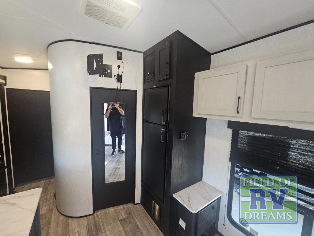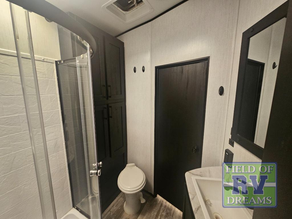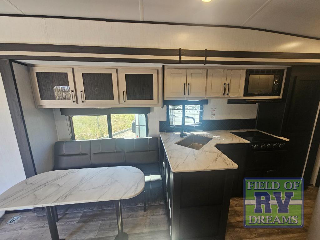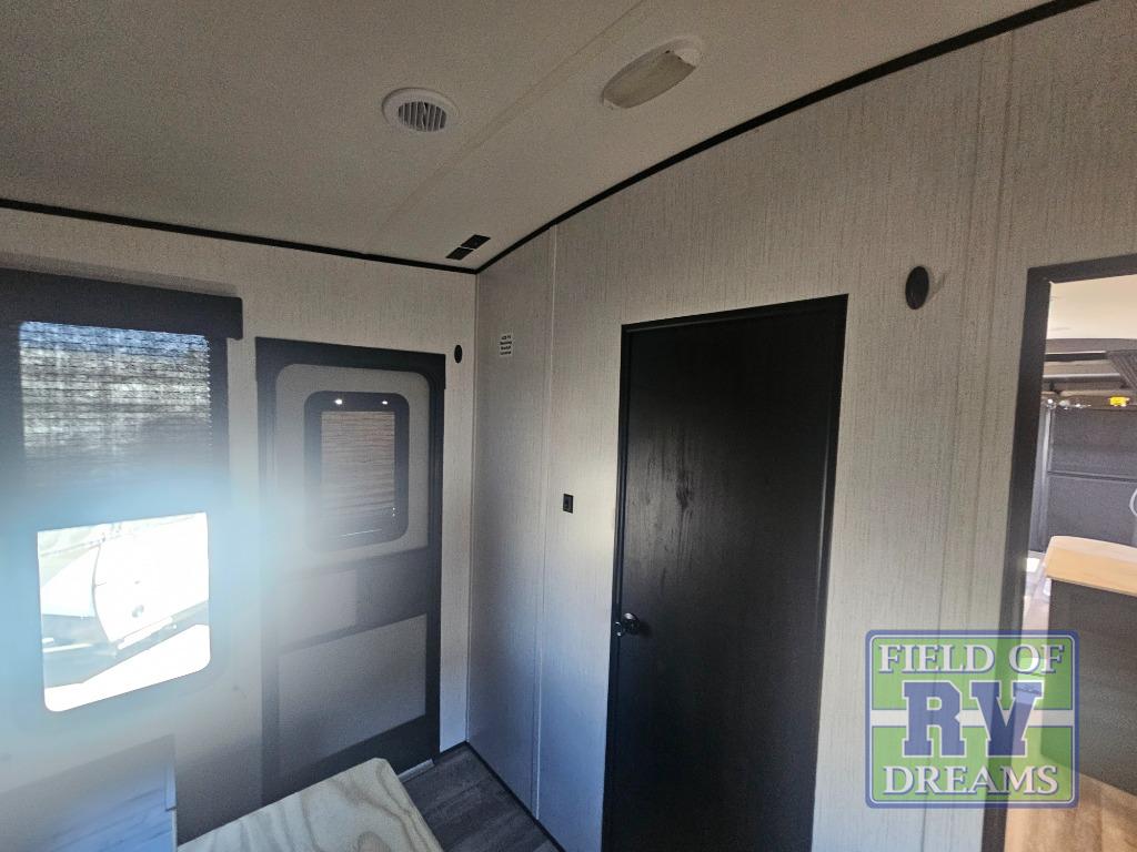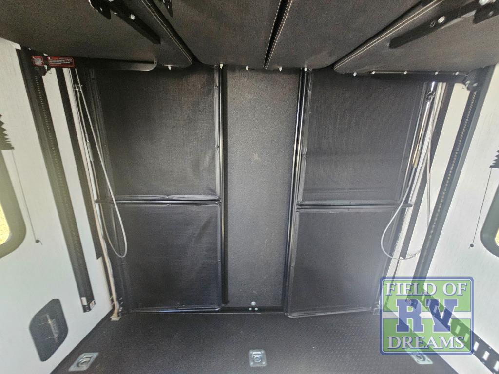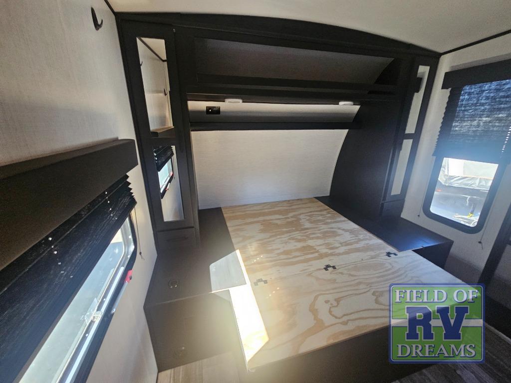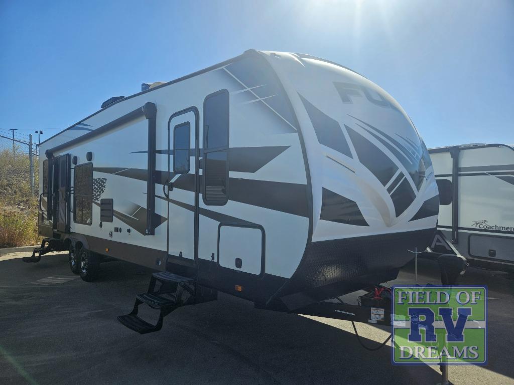 This 35' 11" Fuel toy hauler has lots of space and lots of convenience, so you'll never be at a loss when you're out having fun! You can enter and exit this unit easily because of the two entry doors, and one of those doors leads directly into the front master suite. Since the bedroom has a private entrance into the dual-entry bathroom, you'll also be right next to the bathroom when you use the second exterior entrance. The sofa has a table in front of it so that you can sit down with a hot meal after all of that outdoor fun, and you also have two lounge chairs that you can sit in instead. The power queen bunk sits above the opposing sofas with dinette, so you will have a second location to eat your meals.