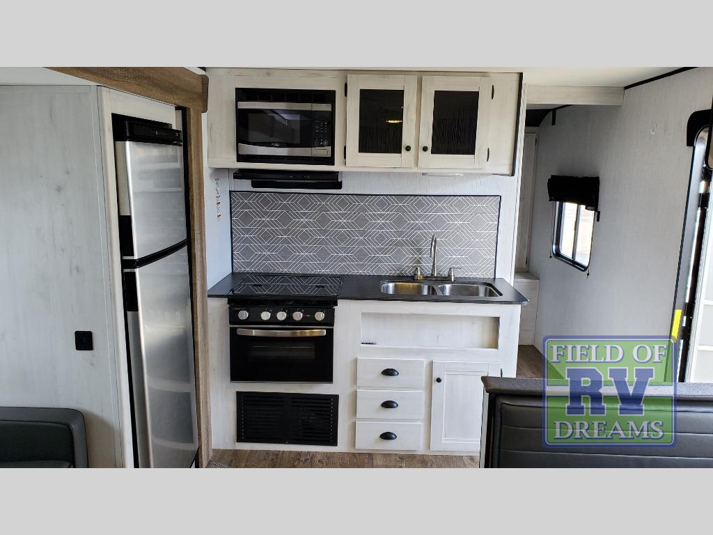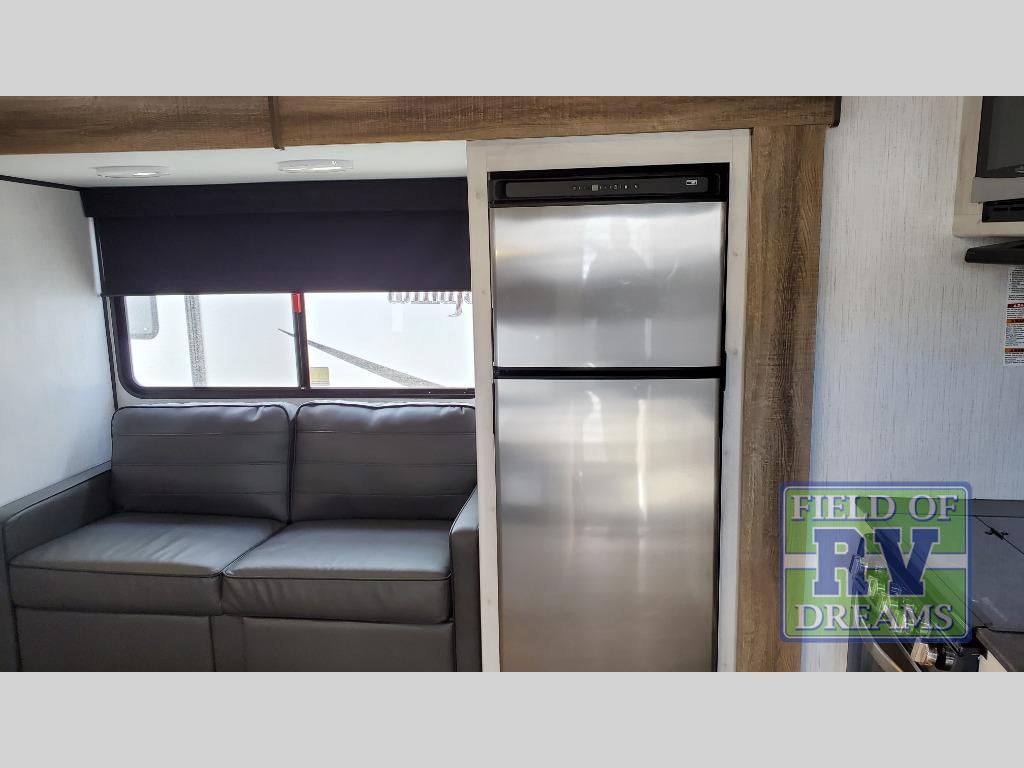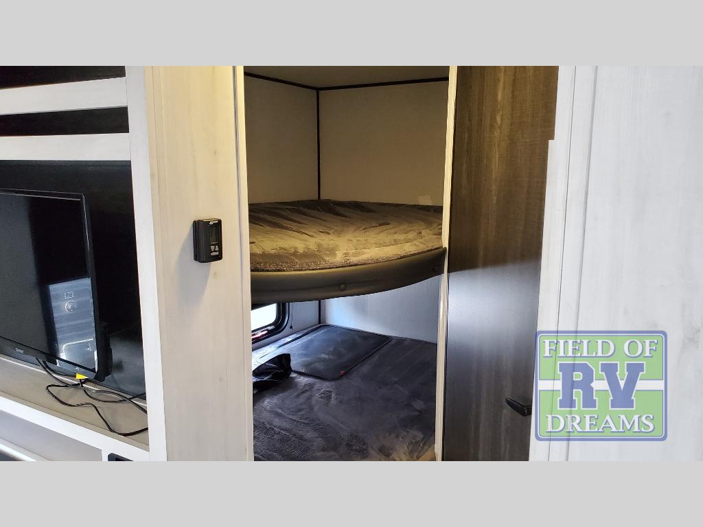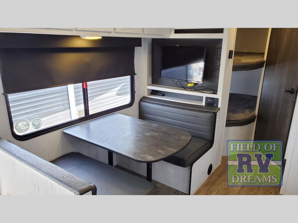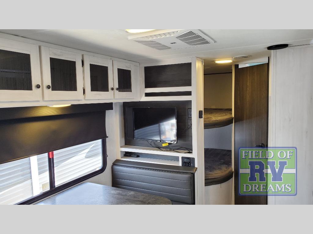 Enjoy family time at the campground with this travel trailer! The kiddos can sleep on the set of double bunk beds and you will have your own privacy with the front private bedroom which has a queen bed with under-bed storage and wireless cell charging stations for one less thing to bring with you. The chef can whip up their best meals with the three burner cooktop and everyone can enjoy them together at the booth dinette then play a card game or two. If you're not big into card games then you can relax on the sofa while you enjoy a cold drink stored in the 10 cu. ft. stainless steel refrigerator. Freshen up each day in the rear corner bathroom with the ABS tub/shower surround with a skylight above it!