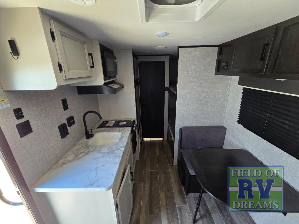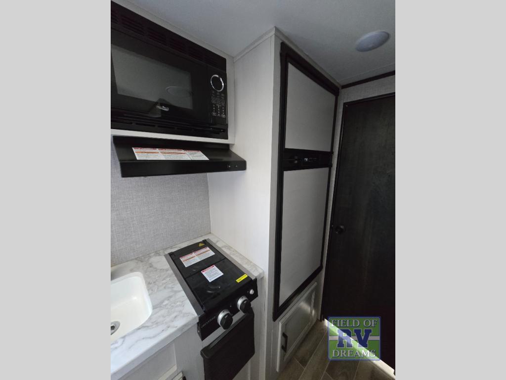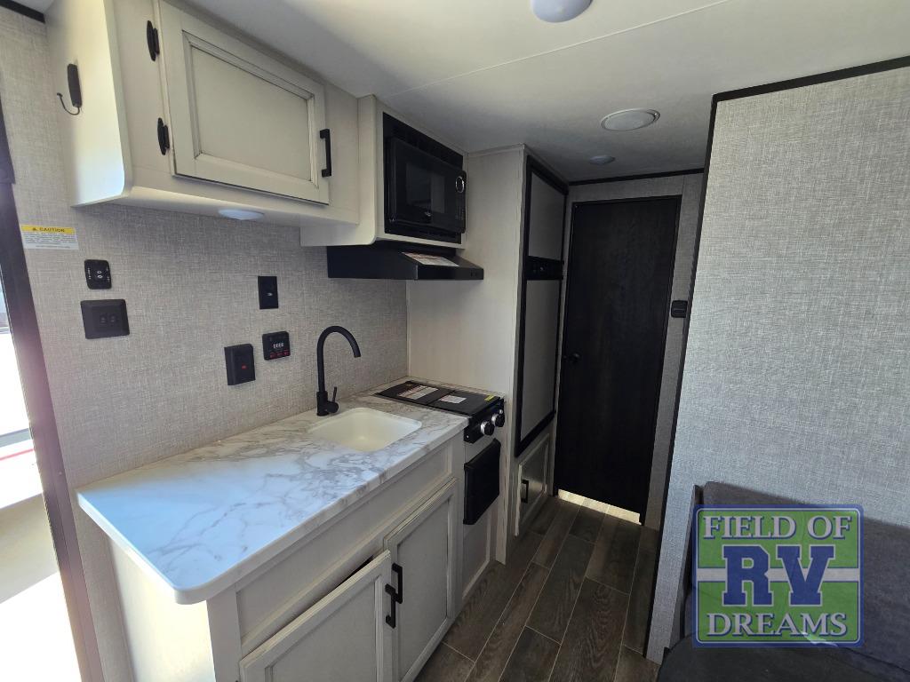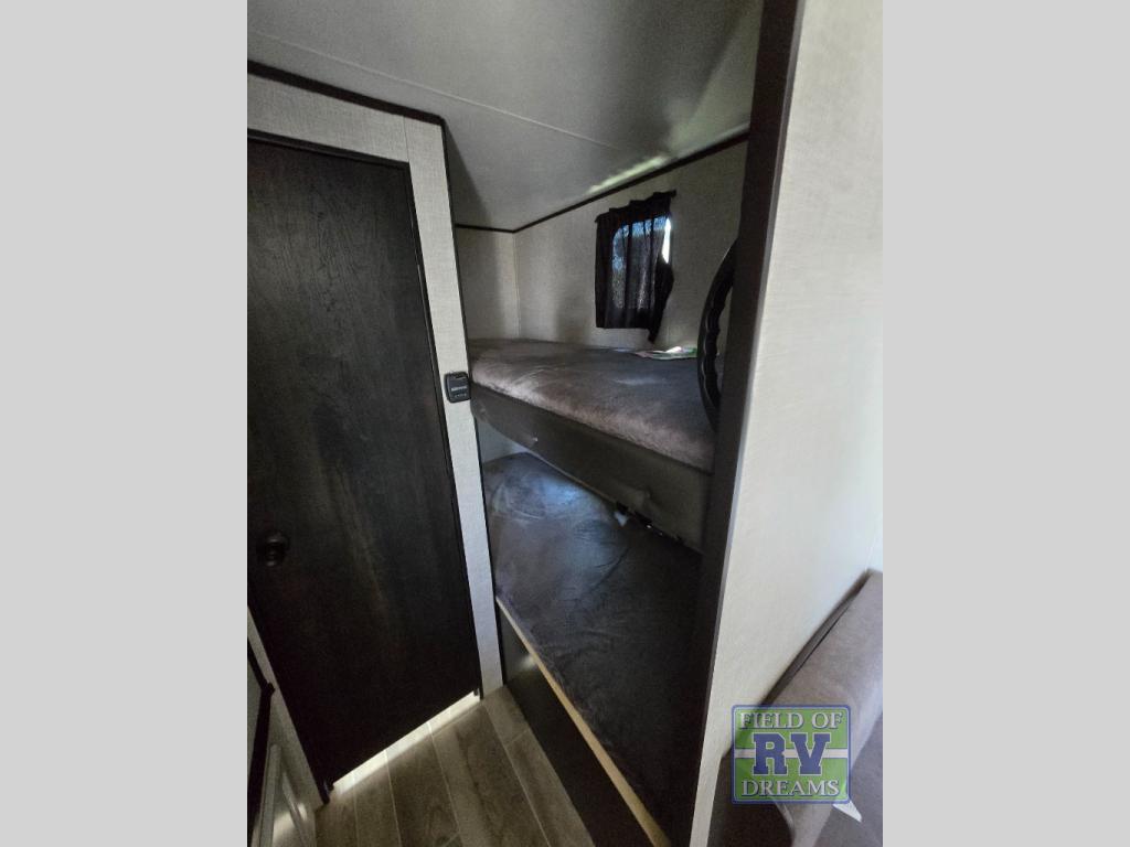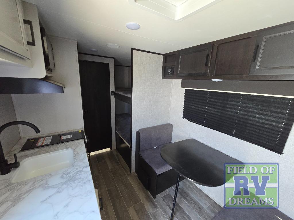 This Jay Flight SLX 7 travel trailer offers you a queen-size bed for sleeping at night, and there is even a privacy curtain that you can draw to separate the bed from the rest of the trailer too. The 29" x 75" bunk beds are another sleeping location, and you can even create a bed for one more person by transforming the booth dinette. Overhead cabinets will help you keep your belongings organized, and the kitchen has a two-burner range, 6-cubic foot refrigerator, residential-style countertops, microwave oven, and a high-rise faucet at the sink to help you prepare meals.