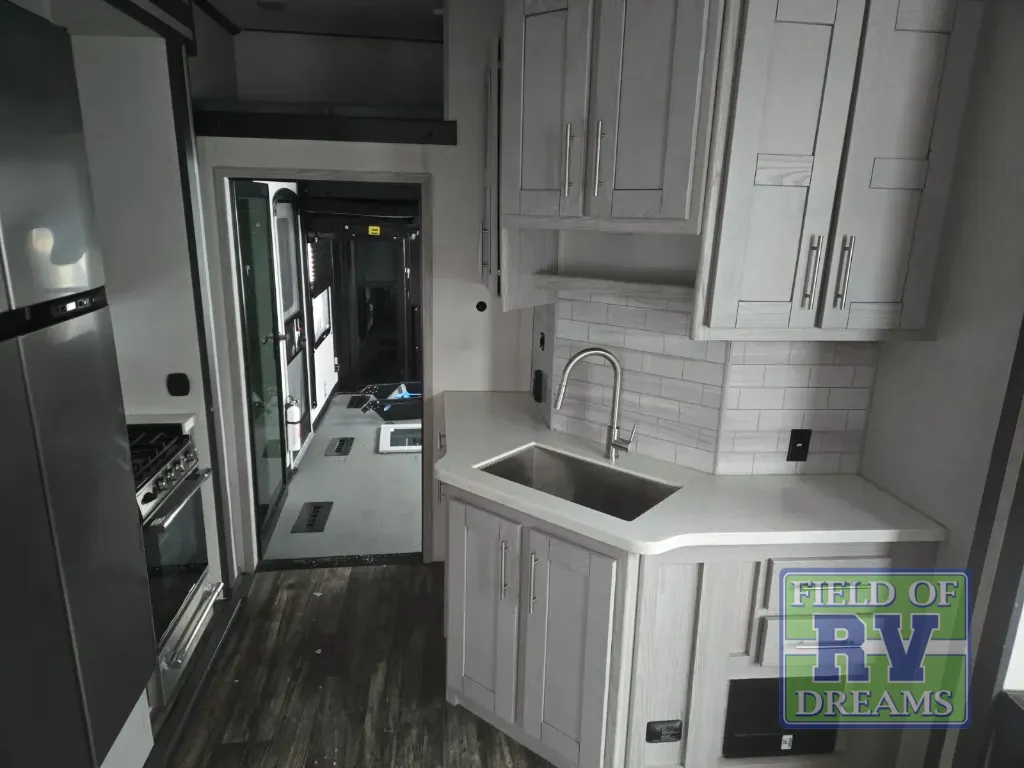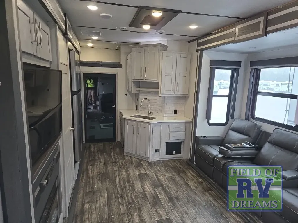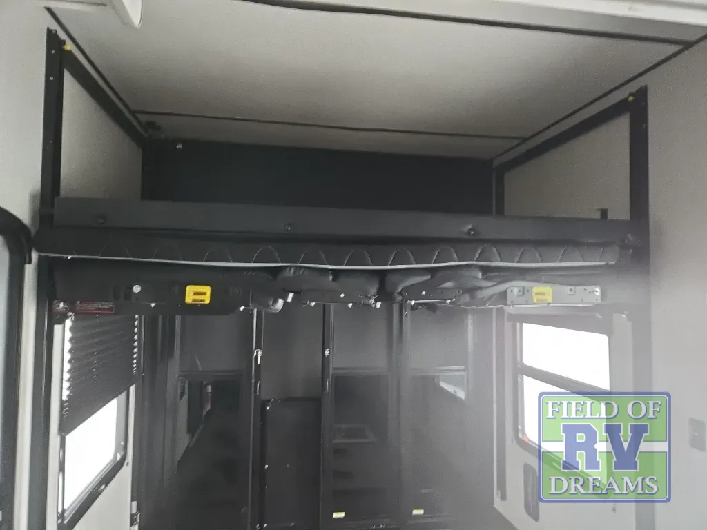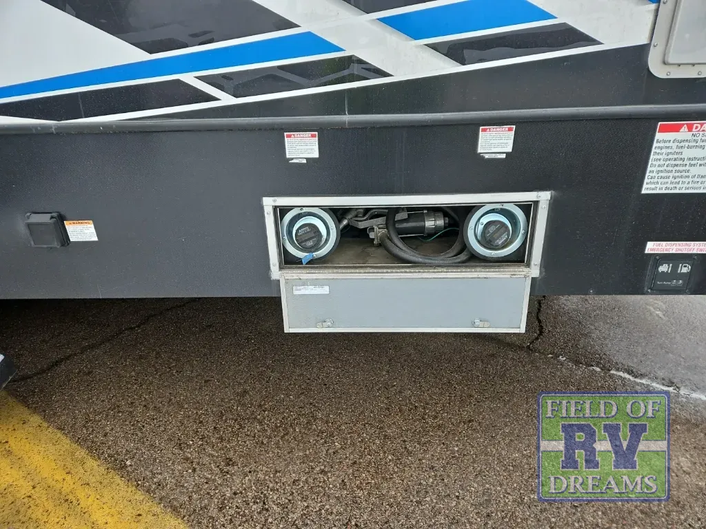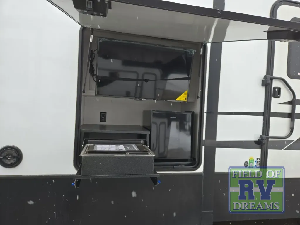 You won't believe what this toy hauler has in store for you! Starting with the dual entry doors for a smooth flow of traffic to the outdoor entertainment center with an LED TV, a pull-out cooktop, and a refrigerator. You can prepare your best meals with the three burner cooktop, store your favorite snacks in the large pantry, and pop a bag of popcorn in the convection microwave for movie night. The sofa slide and hide-a-bed sofa offer comfortable places to sit while you watch your movies on the LED TV with a fireplace below at the entertainment center. With a dual entry bathroom, everyone will be able to easily access it especially those staying in the front private bedroom which has a residential queen bed slide, a dresser with LED TV, and a front master closet prepped to add an optional washer and dryer. The 13' garage area not only has dual opposing sofas with a queen bed above them, but also a loft with a bunk mat, a LED TV, and a half bathroom!