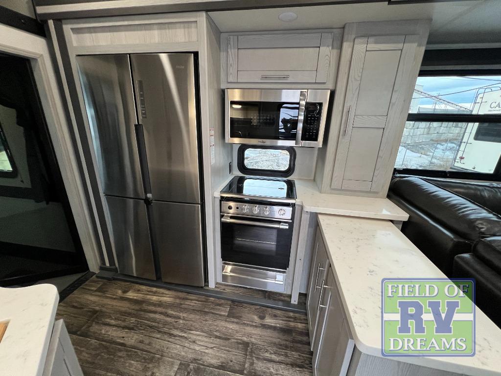 Get your adrenaline pumping with any one of these Keystone RV Fuzion fifth wheel toy haulers! The frame welded, Adjust-A-Trac tie-downs have 38 points to fully secure your toys as you travel, and the extended garage lengths have outside storage so you can haul bigger toys. A fully enclosed fuel pump station is integrated with the iN-Command smart RV control system with Global Connect. The equalizer six-point hydraulic leveling system makes setting up a breeze. And the exclusive Omni-Chill technology offers high-efficiency air conditioning and maximum cooling. The interior provides fiberglass backed linoleum flooring, extra-tall slide height, solid wood cabinet and drawer frames, and extra tall ceilings with crown molding to mention a few attention to details features. Choose a Fuzion because you want to be seen with the best RV garage for power sports enthusiasts and enjoy comfort and amenities when you are away!