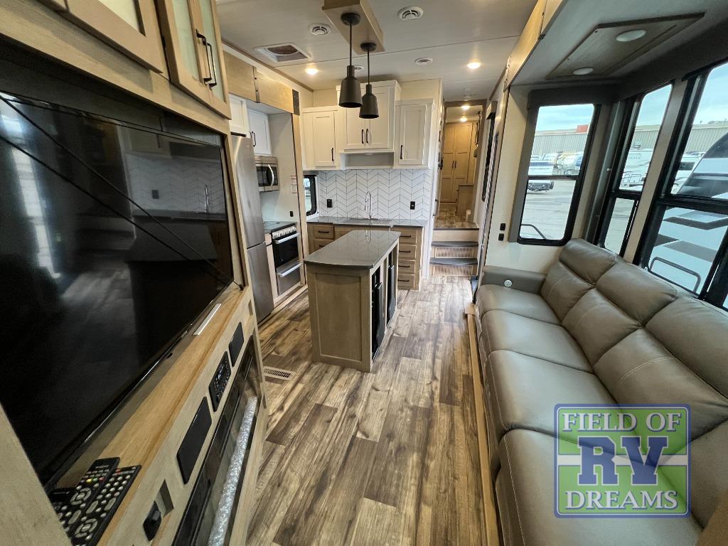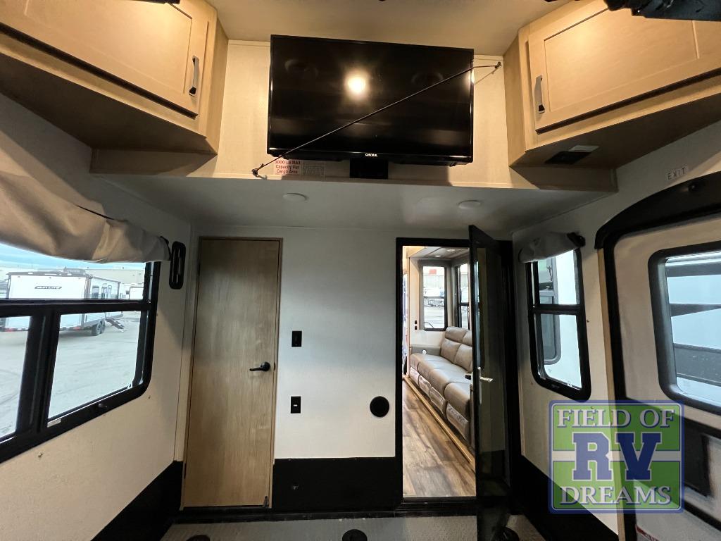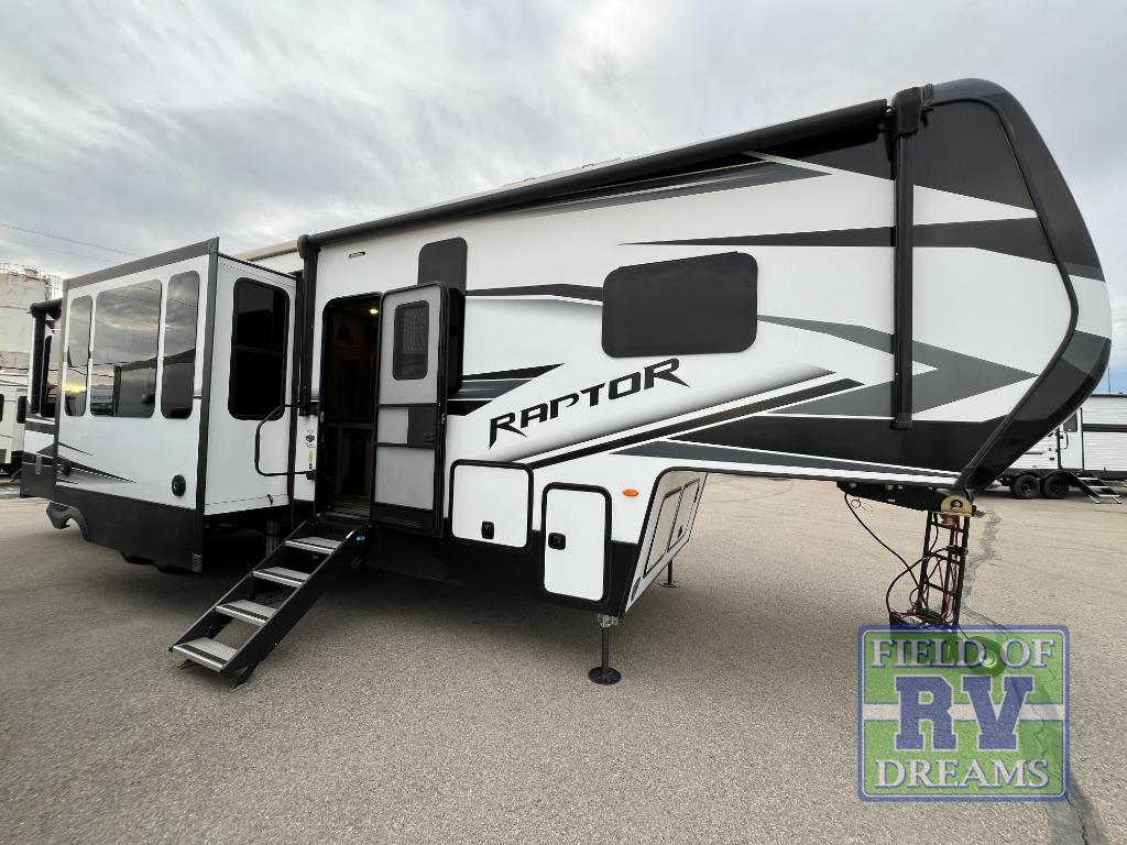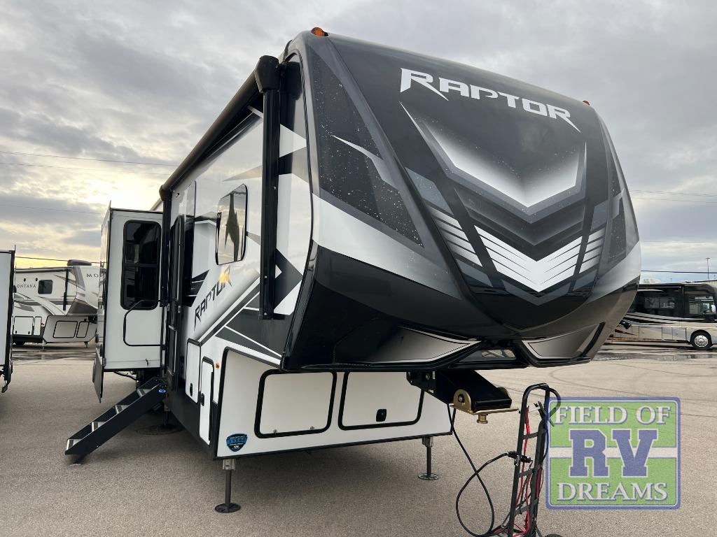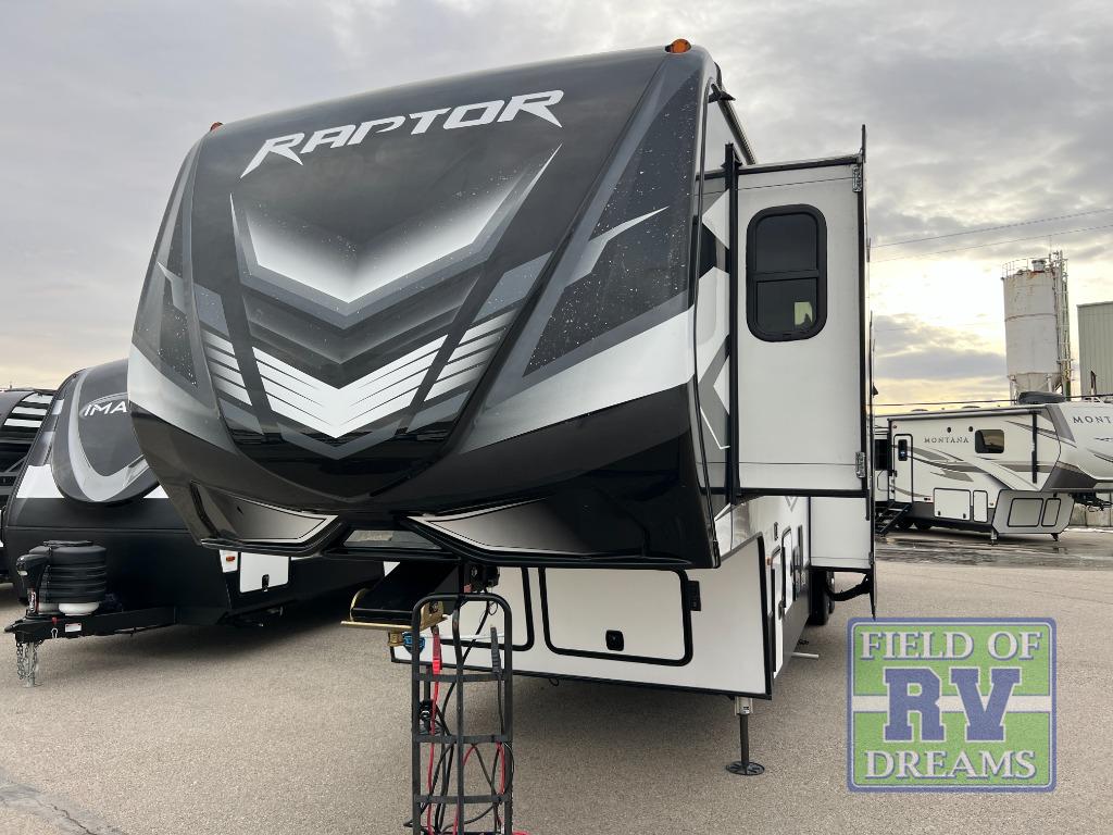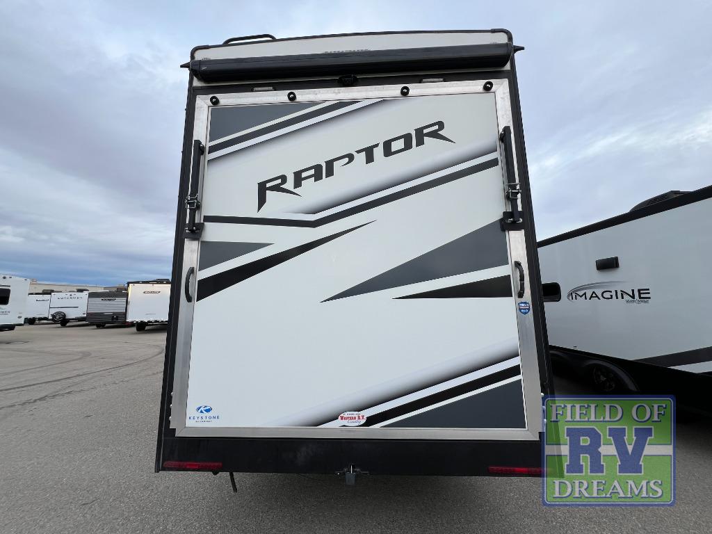 Experience a breath of fresh air with one of these Keystone RV Raptor fifth wheel toy haulers! Their rugged construction consists of a walkable one-piece Alpha Super Flex TPO roof with aluminum flashing, G-rated tires, Dyna Span floor decking, and frame-welded tie downs to keep your toys in place as you travel. With an on-demand water heater, you can have an endless amount of hot water when you need it. Some unexpected conveniences you will appreciate include an Omni-Chill A/C system to keep you cool on those hot summer days, a Furrion backup camera and HitchVision to prevent damages, and a Generation 3 iN-Command smart automation system with Global Command to make life easier. Soft-close hardwood cabinetry makes for a quiet closure to enjoy undetected late night snacking, and the MORryde zero-gravity ramp door makes it easy to load an unload your toys. Come find the right one for you today!