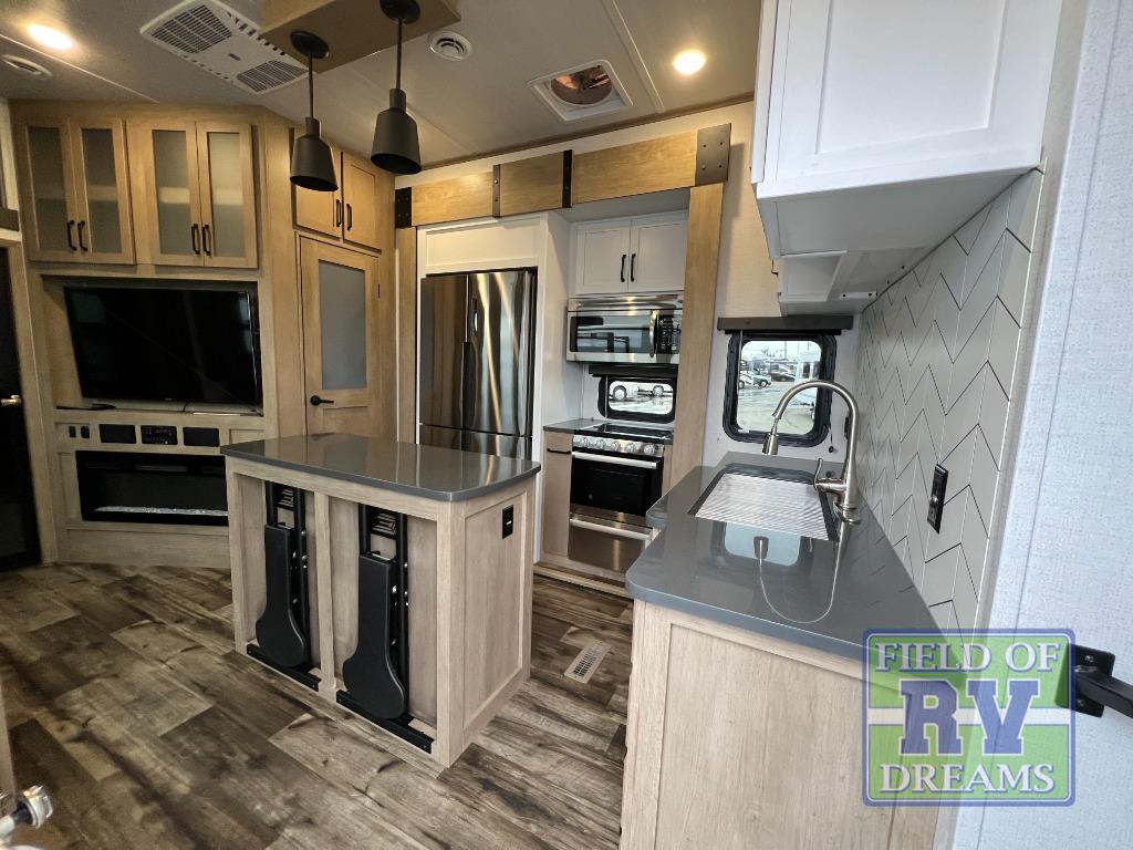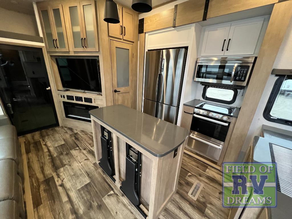 Start camping in luxury with this decked out toy hauler! The front private bedroom has a king bed slide for more walking around space, an entertainment center with storage for your movies, a front wardrobe, and an area next to it prepped to add an optional washer and dryer. Freshen up each morning in the full bathroom with the fiberglass one-piece shower then head to the kitchen to fry up some eggs on the three burner cooktop. Grab a cold cup of orange juice from the 18 cu. ft. refrigerator then enjoy it and the eggs at the kitchen island with two flip-up bar stools. The 4-seat recliner slide is conveniently across from the entertainment center with a 50" LED TV and fireplace. As you head into the 11' garage area, you will notice a loft with a twin bed, dual opposing sofas with a table in between below an electric bed, and a half bathroom, plus one of the dual entry doors to the unit!