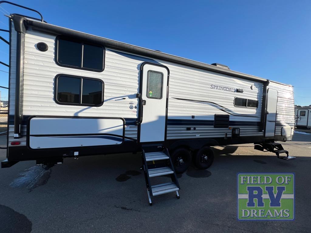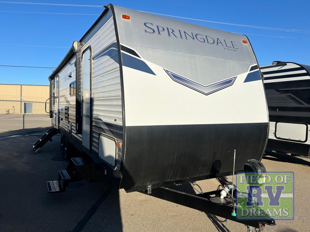 With any Keystone Springdale travel trailer, you will have a friction hinge entry door with sturdy LCI SolidStep steps, a pass-through storage compartment for your outdoor gear, and reliable Dexter E-Z Lube axles to maneuver your Springdale down the road and into the campsites. Some of the Keystone Exclusives provide 12V color-coded wiring with easy-to-trace circuits which is better than conventional RV wiring allowing a faster diagnosis for quicker repairs, and the streamlined heat distribution that uses in-floor heat vents for more efficiency for uninterrupted air flow. Also included, the Blade high performance air flow system that delivers 30% more air flow. The interior gives you pressed kitchen countertops, pleated night shades, and designer upholstered window valances for easy care and style, and more depending on the Springdale you choose!